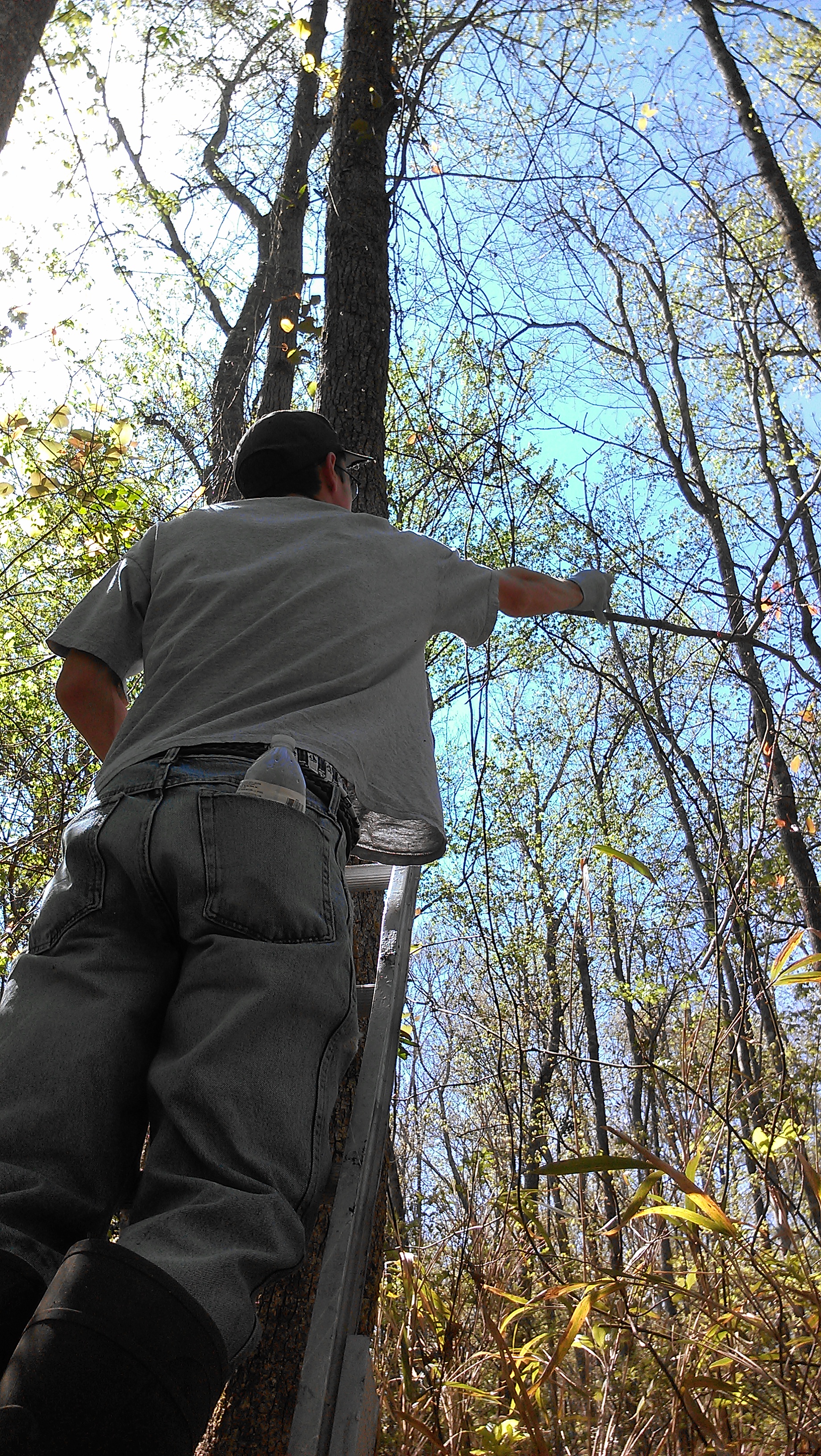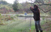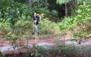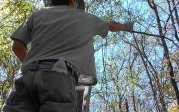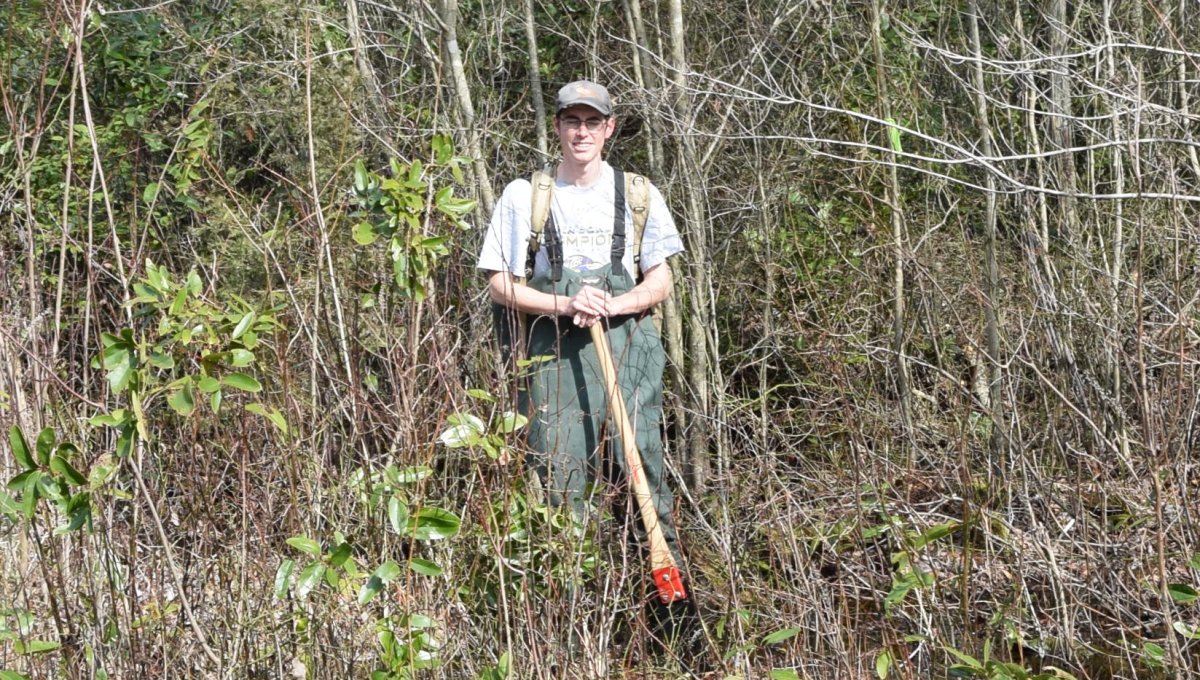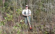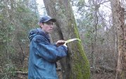 Nick Flanders planting mistletoe seeds at a research site in Great Dismal Swamp National Wildlife Refuge, Suffolk VA as part of a field experiment.