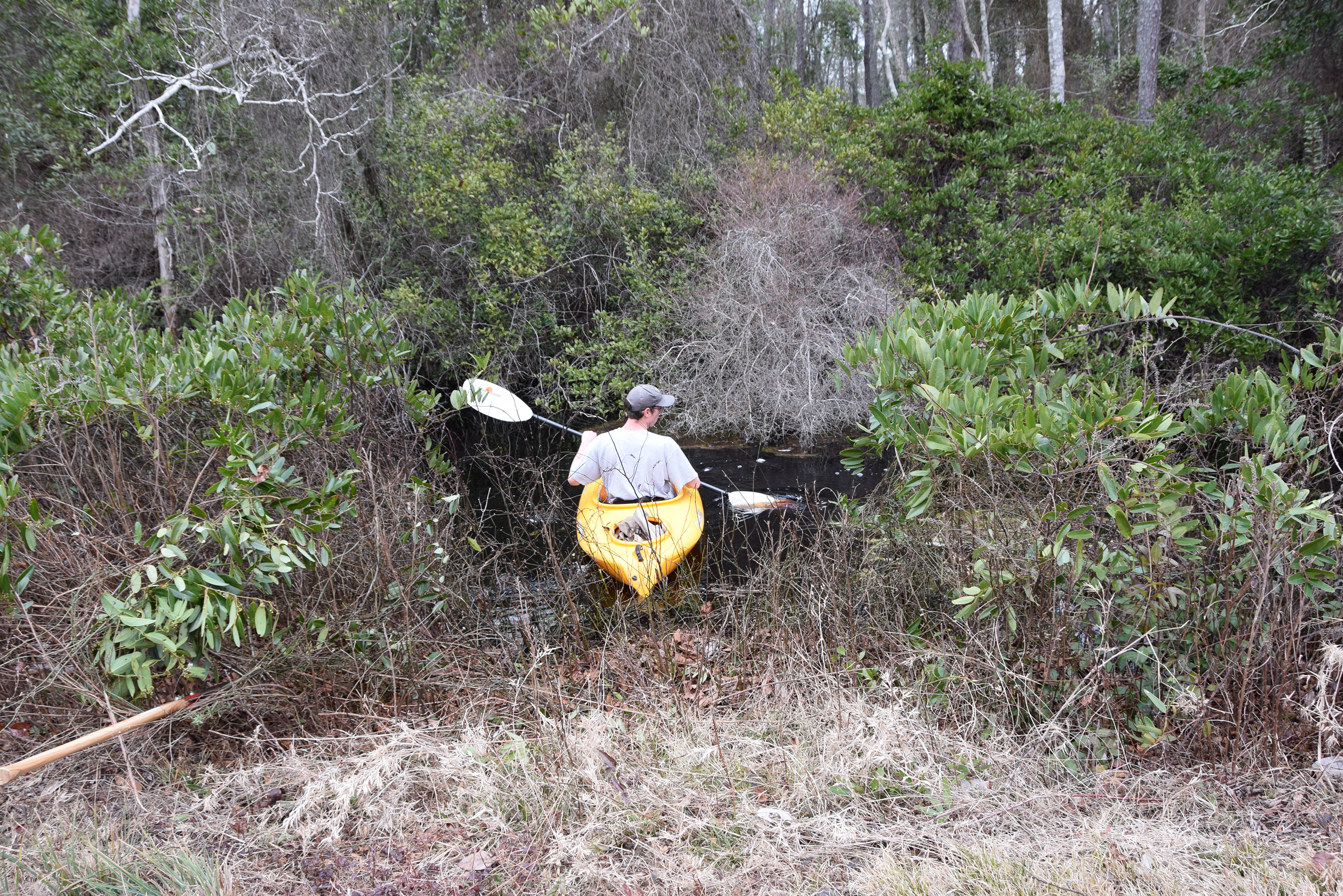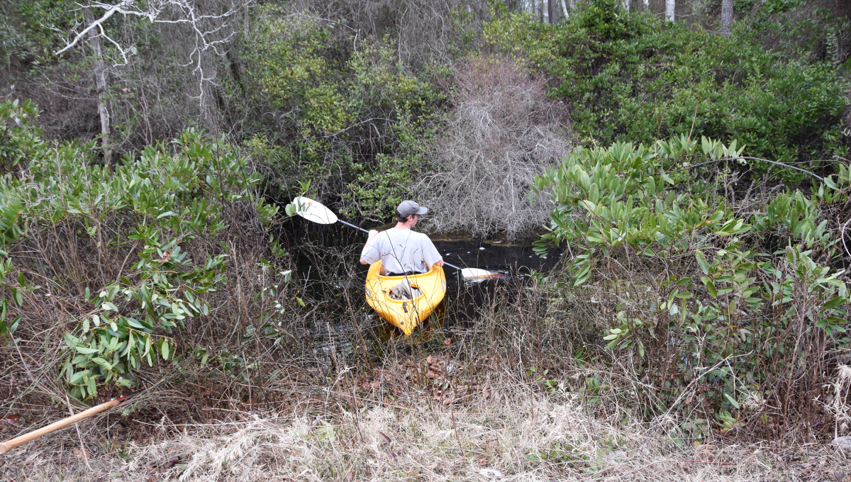 Nick Flanders kayaking to a research site in the forested wetlands of Great Dismal Swamp National Wildlife Refuge, Suffolk VA