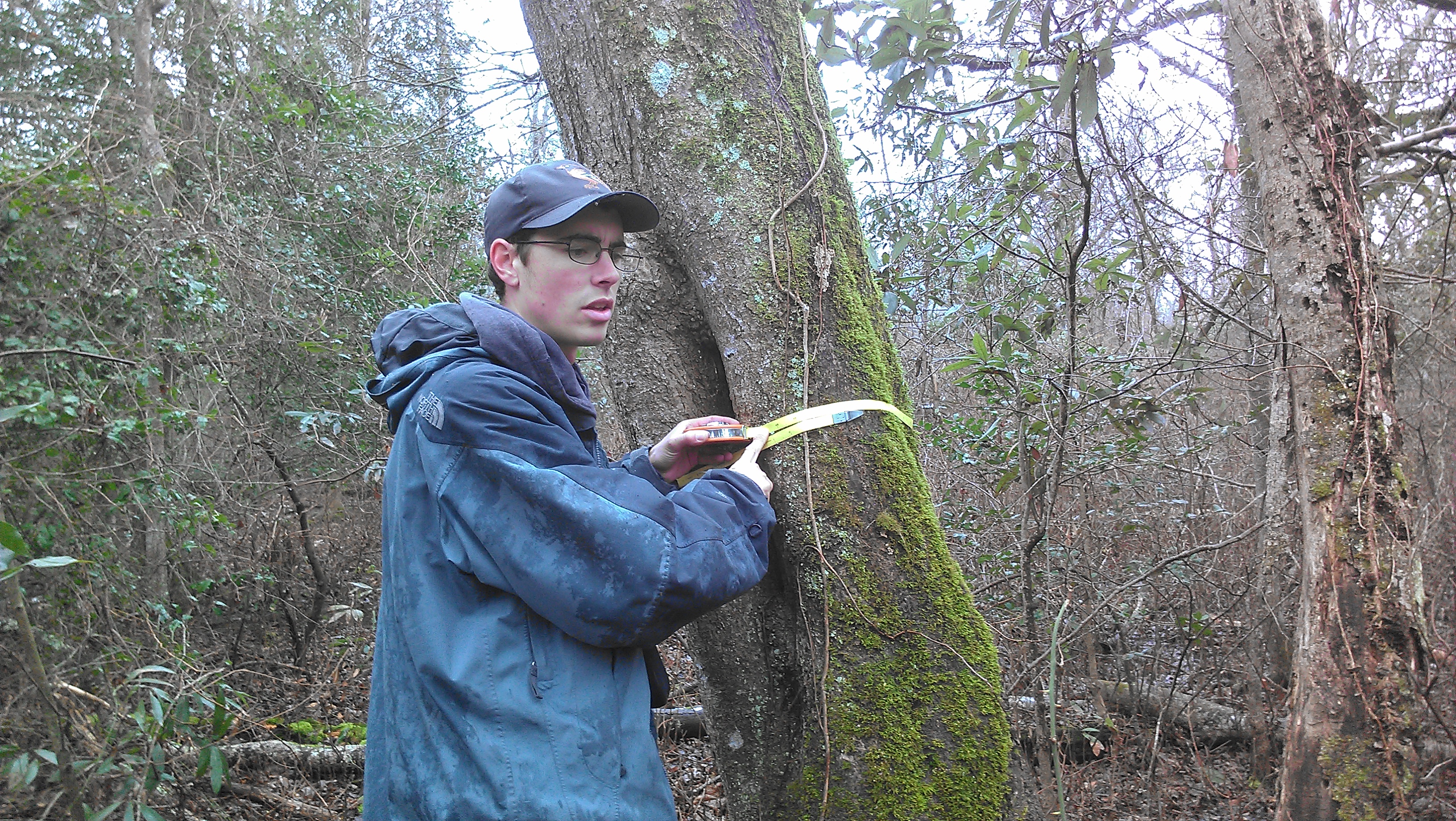 Nick Flanders measuring tree diameters at a research site in the forested wetlands of Great Dismal Swamp National Wildlife Refuge, Camden Co. NC.