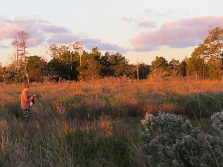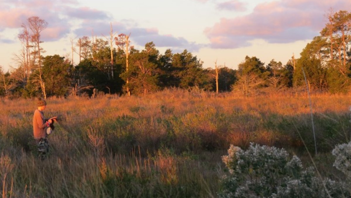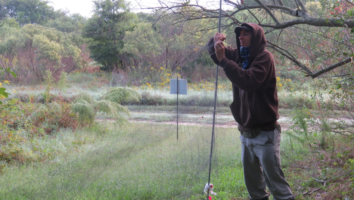 Chance Hines setting up a mist net in high marsh habitat to capture migratory songbirds at Magothy Bay NAP.