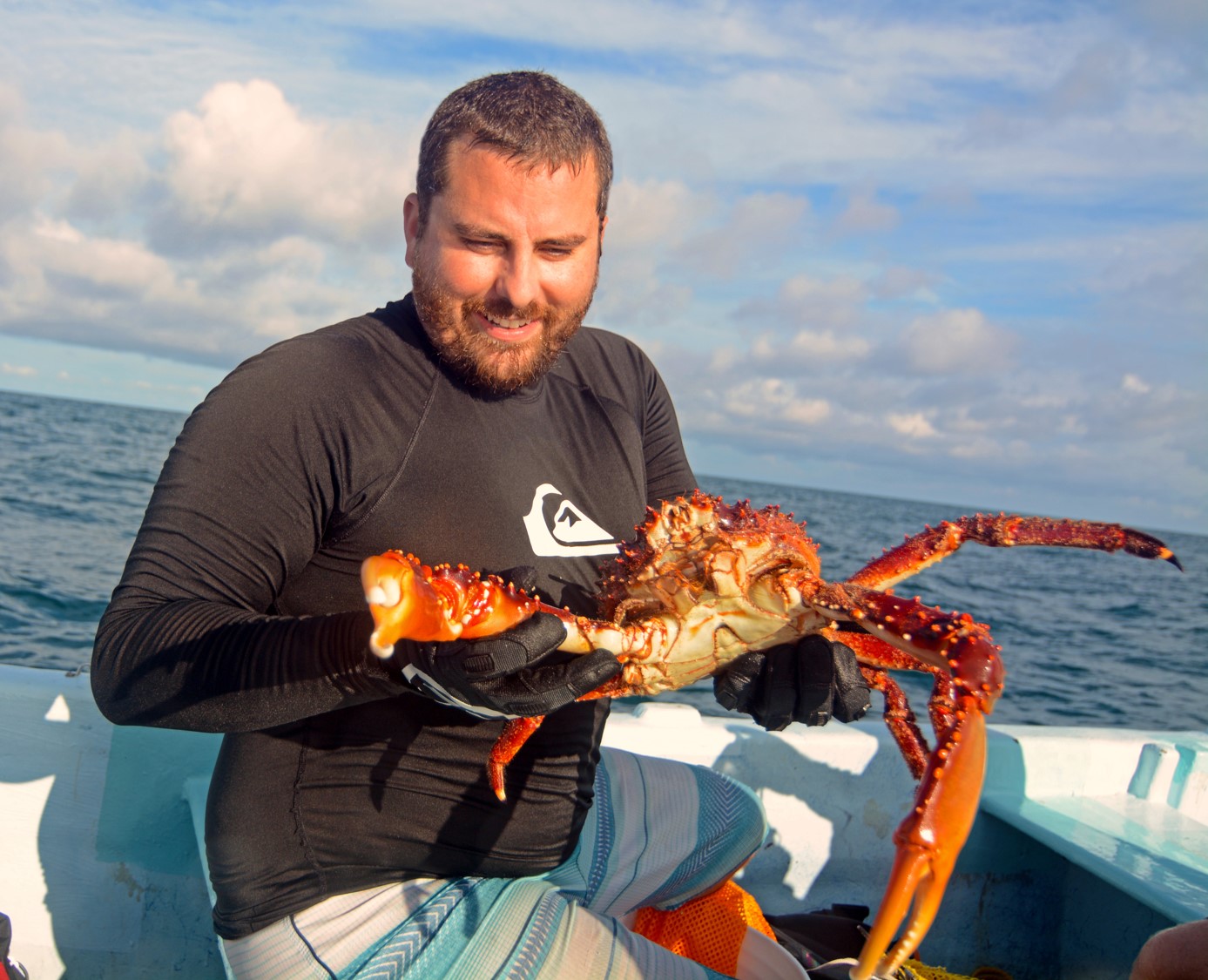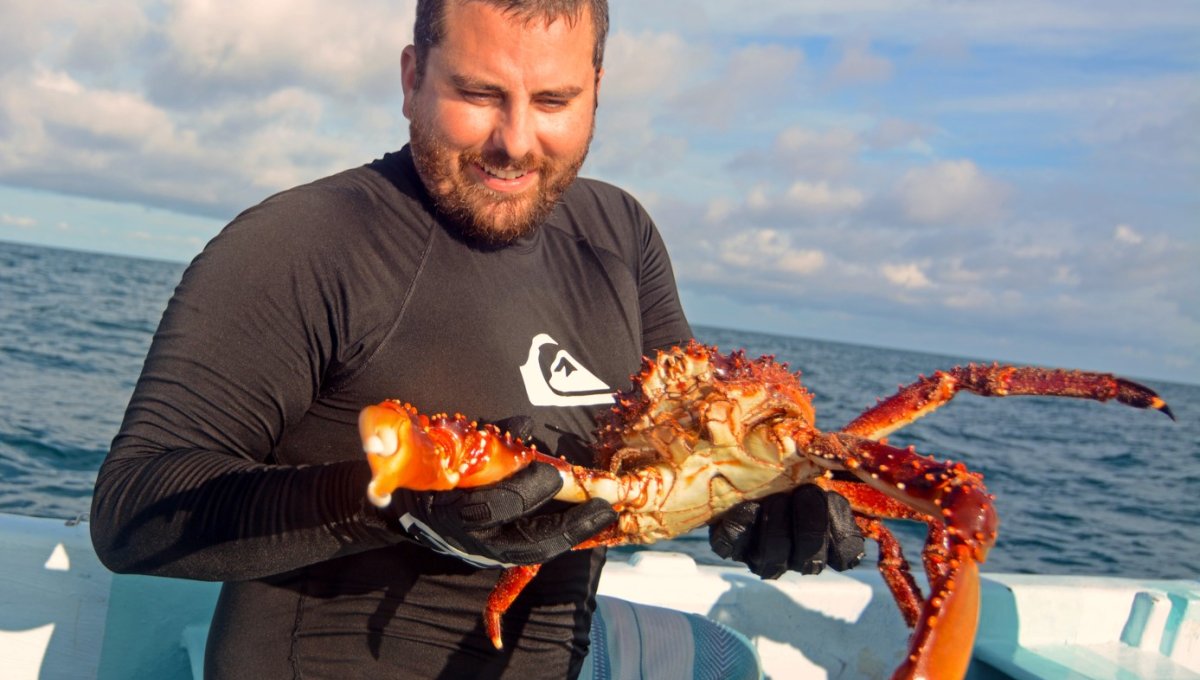 Jason Spadaro with study organism, the Caribbean King Crab (Maguimithrax spinosissimus)