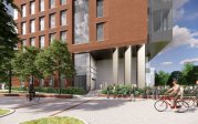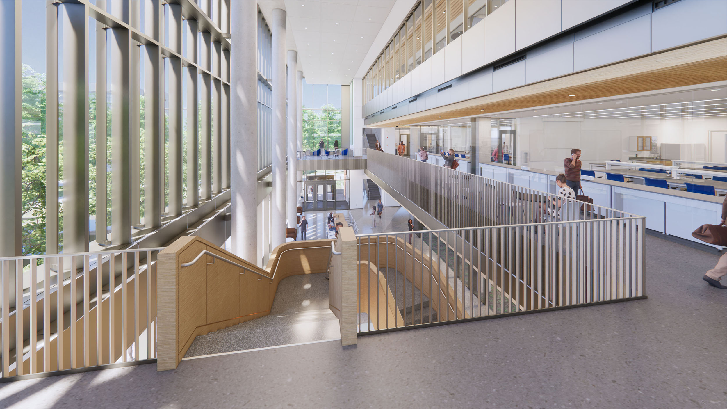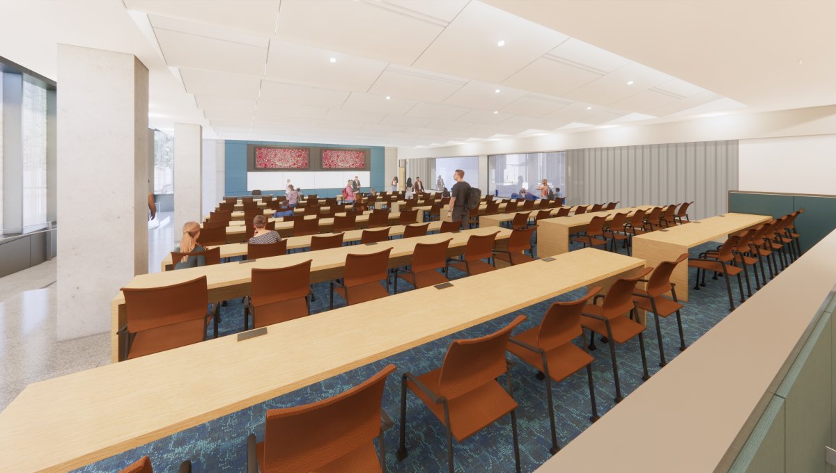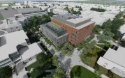 An exterior ground level view of the northeast side of the Biological Sciences rendering.