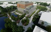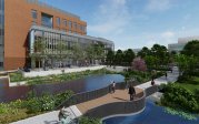 An exterior ground level view of the west side of the Biological Sciences rendering across from the new pond bridge that will be built as part of this project.