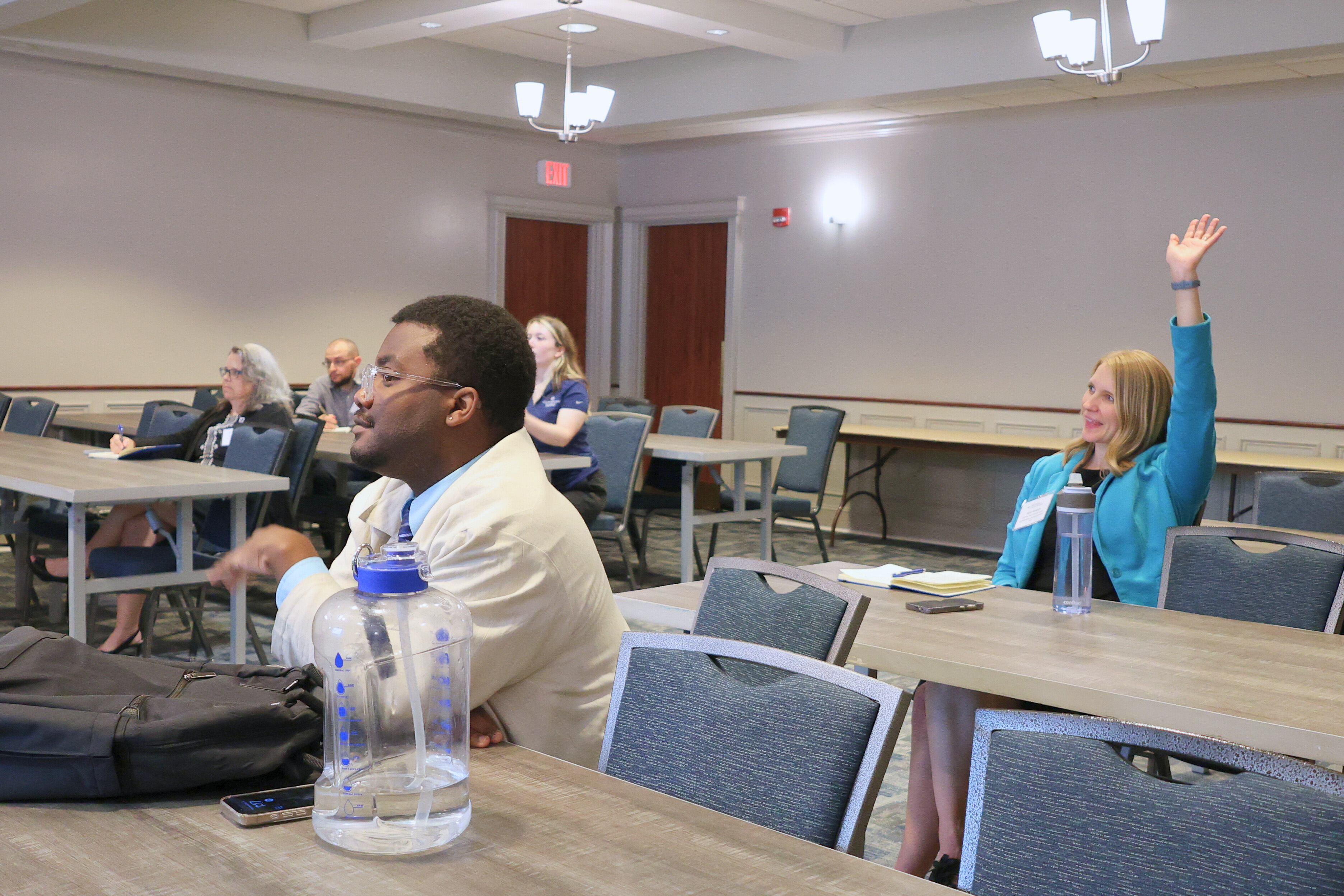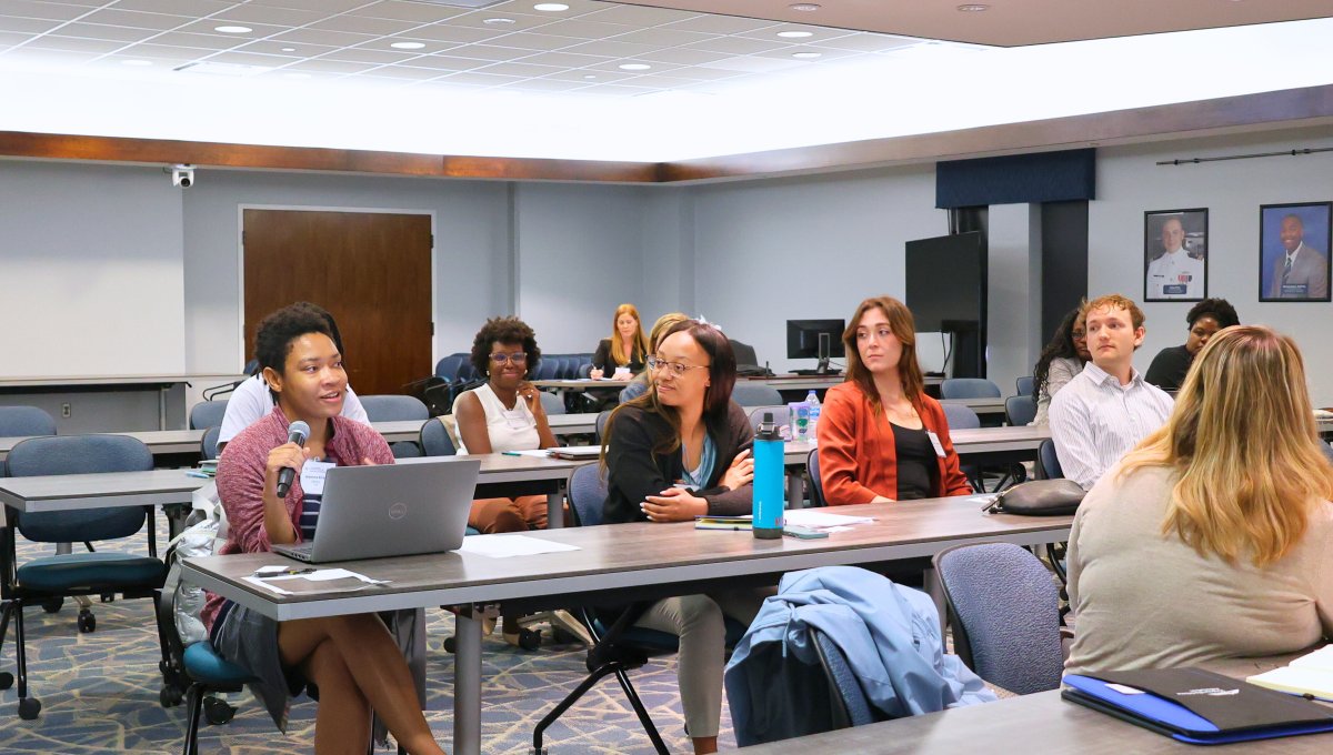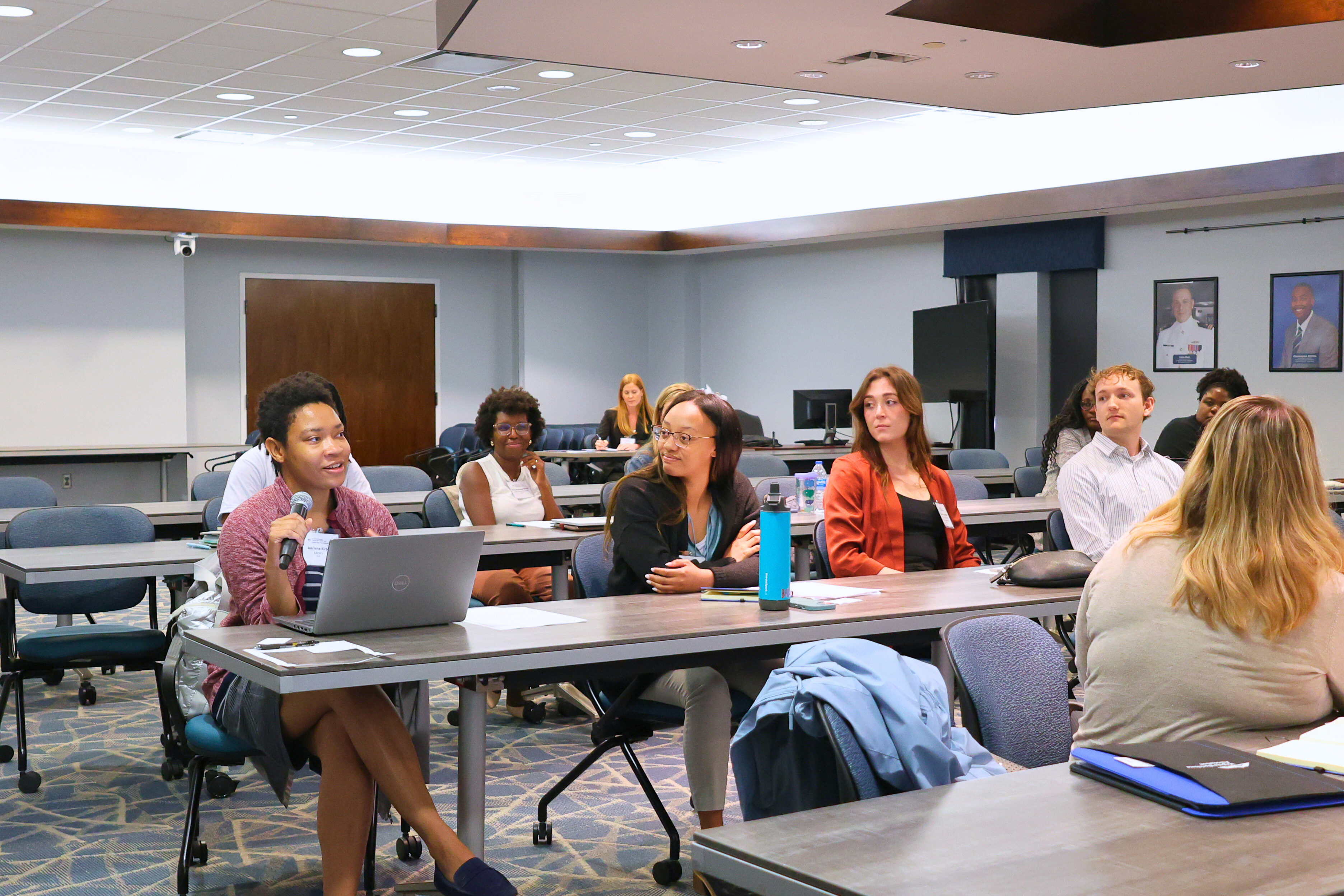 One audience member is speaking into a microphone and other audience members are paying attention.