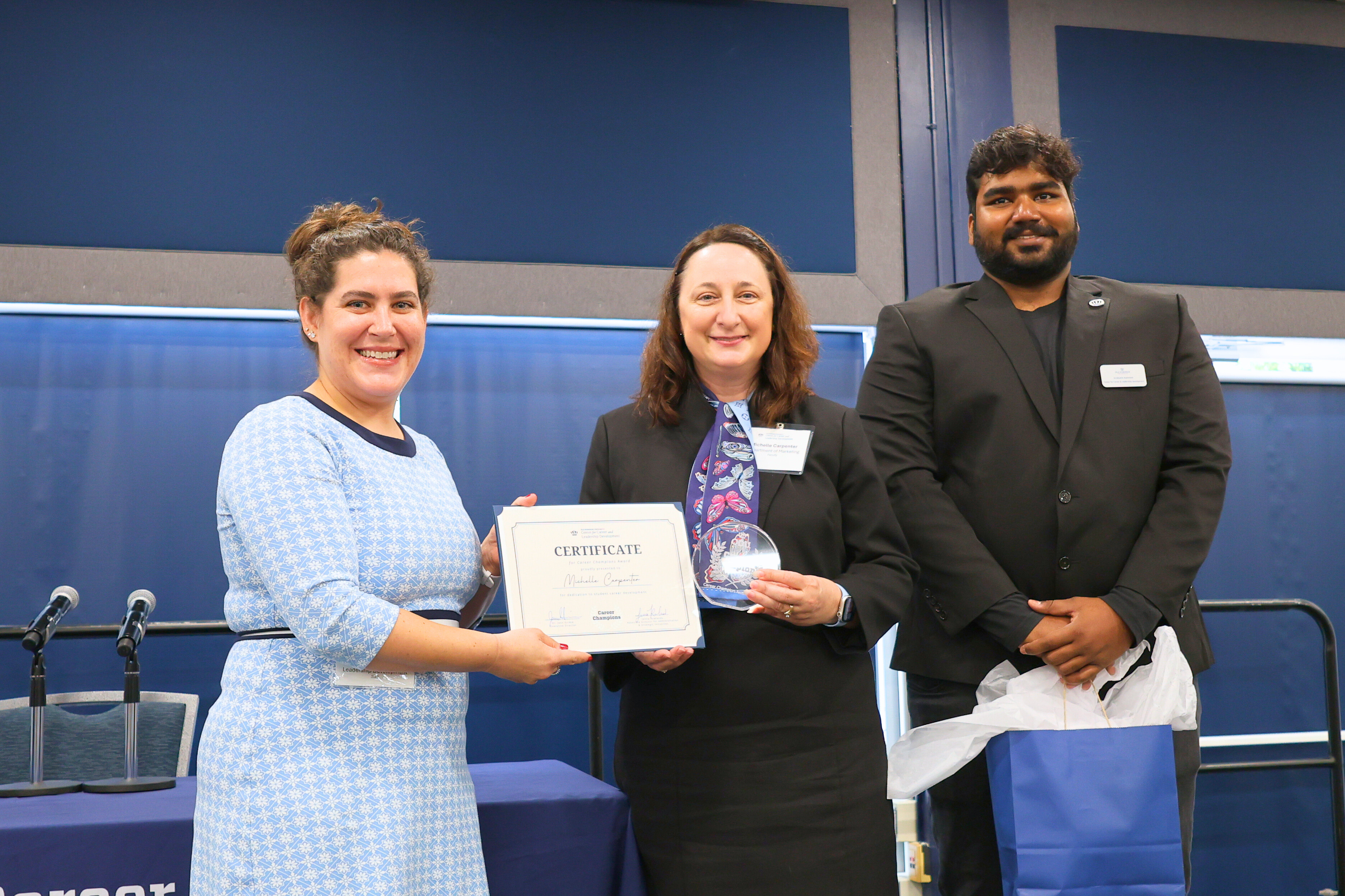 Three people standing on the stage. 2 people awarding the certificate and award to one person.