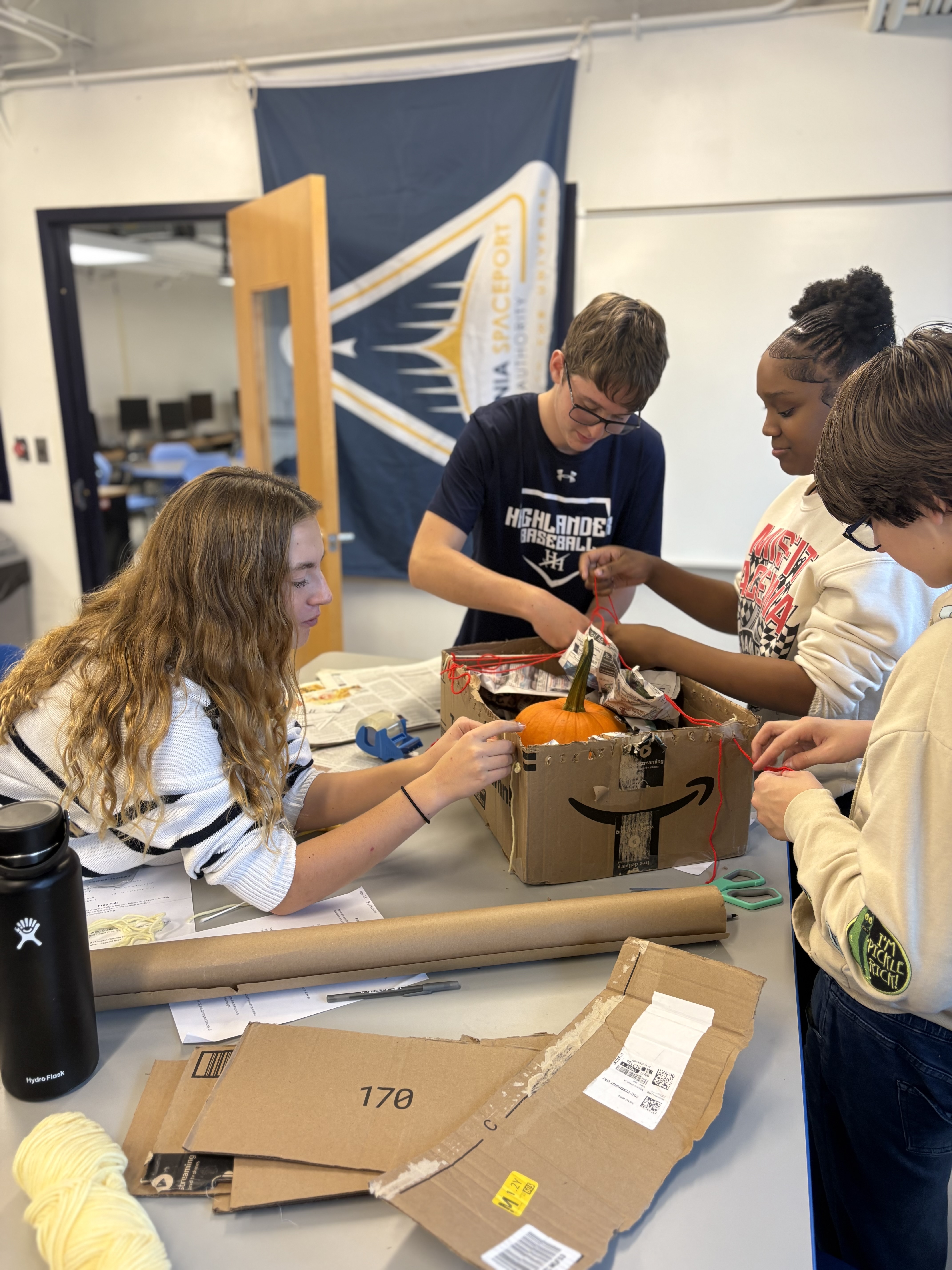 AAES students working collaboratively on an Engineering Design Project to design, construct, and test a pumpkin catcher.