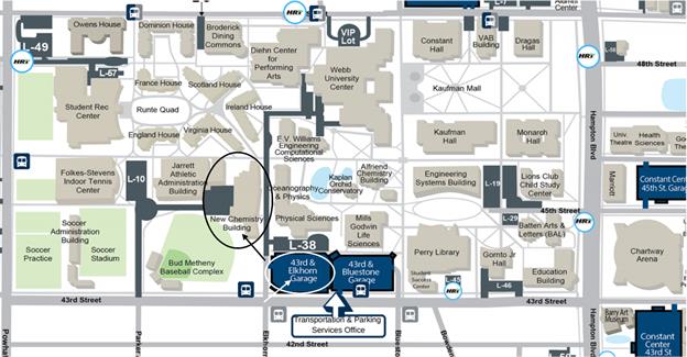 Presenters and visitors can park in Garage A (43rd and Elkhorn Avenue, shown by white arrow in the map below) right across the New Chemistry Building (black arrow in the map below), which can be accessed via Elkhorn Avenue off 43rd Street.