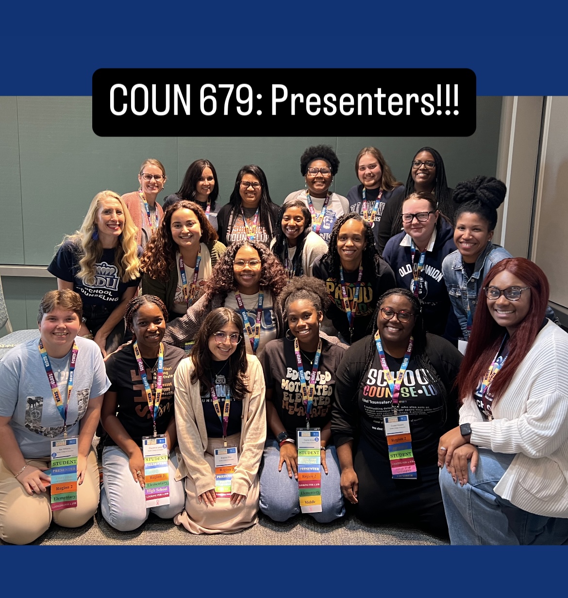 The October 2024 VSCA conference in Hampton followed the years before it- as a well attended, high energy gathering. New to this year: members of our most recent ODU School Counseling Capstone class (COUN 679; taught by Dr Emily Goodman-Scott) presented together, along with several of our doctoral students. Their session was titled “VSCA Flash”- and students presented timely topics in school counseling, “in a Flash.” Mainly, sharing concrete strategies in five minutes or less. Topic included: strategies for supporting Black girls; technology tools; strategies for serving student athletes; suicide prevention; and so much more.