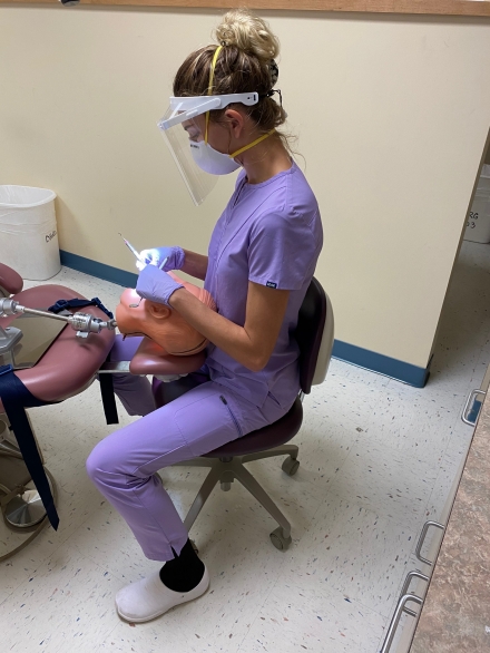 Taylor Kace, graduate student in the MSDH program is currently working on a project titled: THE EFFECTS OF STANDING AND SITTING HYGIENE ON POSTURE IN DENTAL HYGIENE STUDENTS. This research explores the impacts of sitting and standing postures to deliver dental hygiene services. This research aims to identify ergonomic advantages and risks to both postures in an effort to reduce musculoskeletal disorder burdens on dental hygienists.