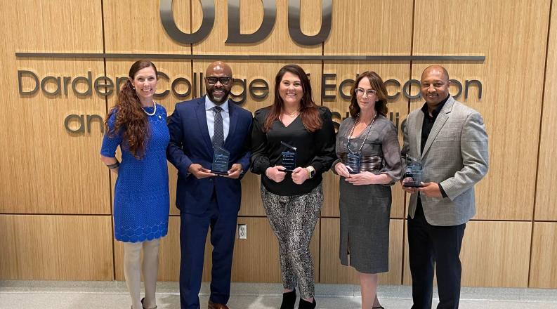 Left to Right: Interim Dean Dice, Dr. Corey L. McCray, Dr. Jennifer Goff, Dr. Ann Maydosz, and Allen “Duffey” Samuels pose in front of the ODU Darden College of Education and Professional Studies wall plaque.