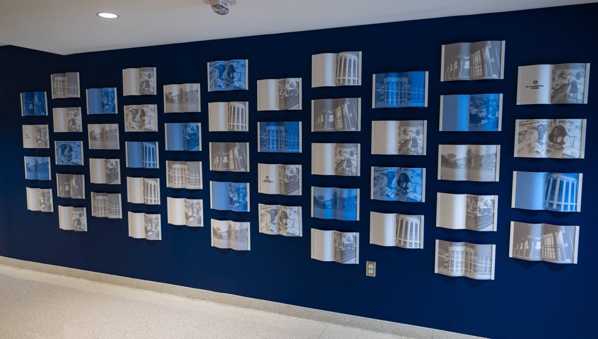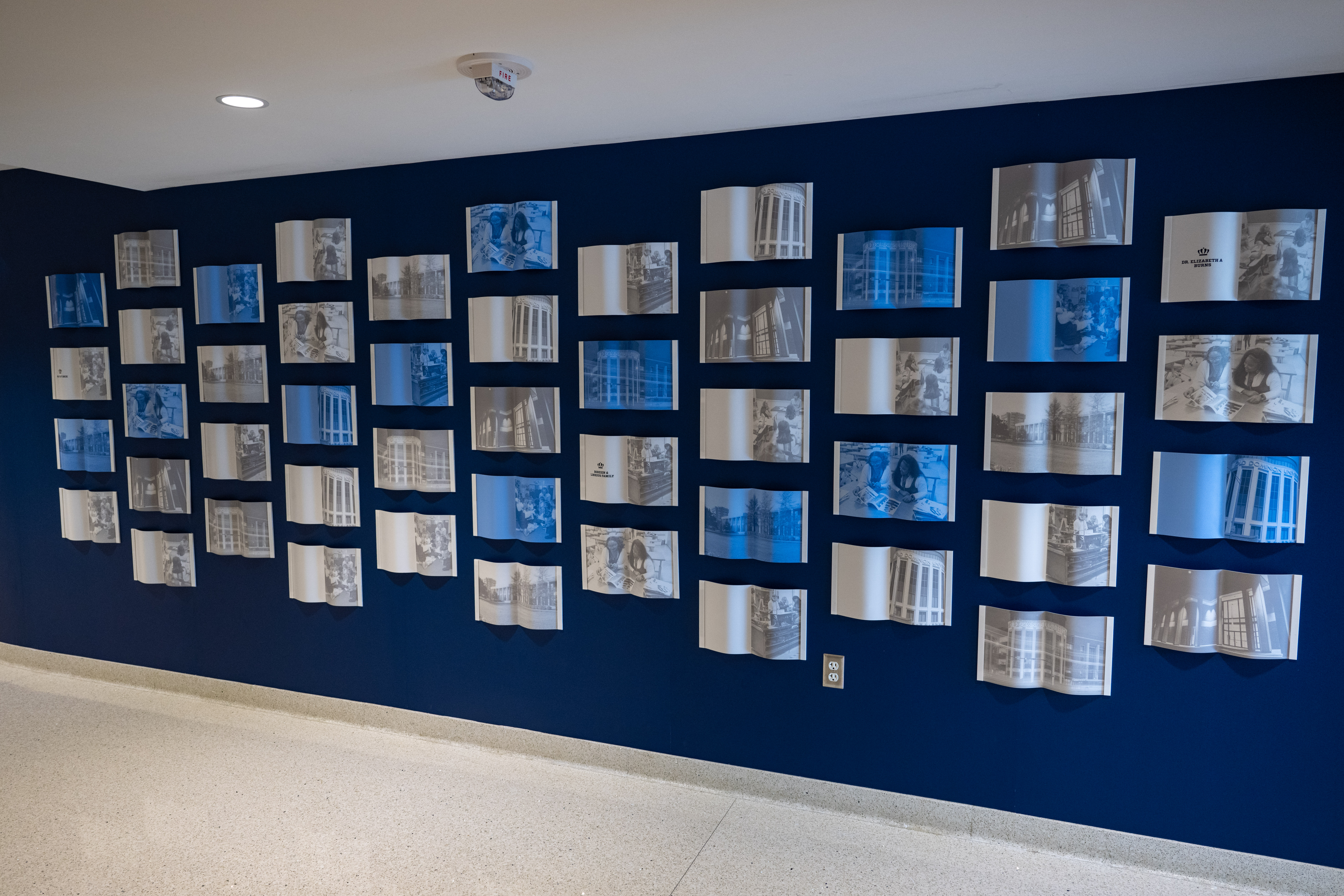 A vibrant wall of books in the main entrance celebrates every gift. Each page tells a story of impact, showcasing the donors who empower students to reach their full potential.