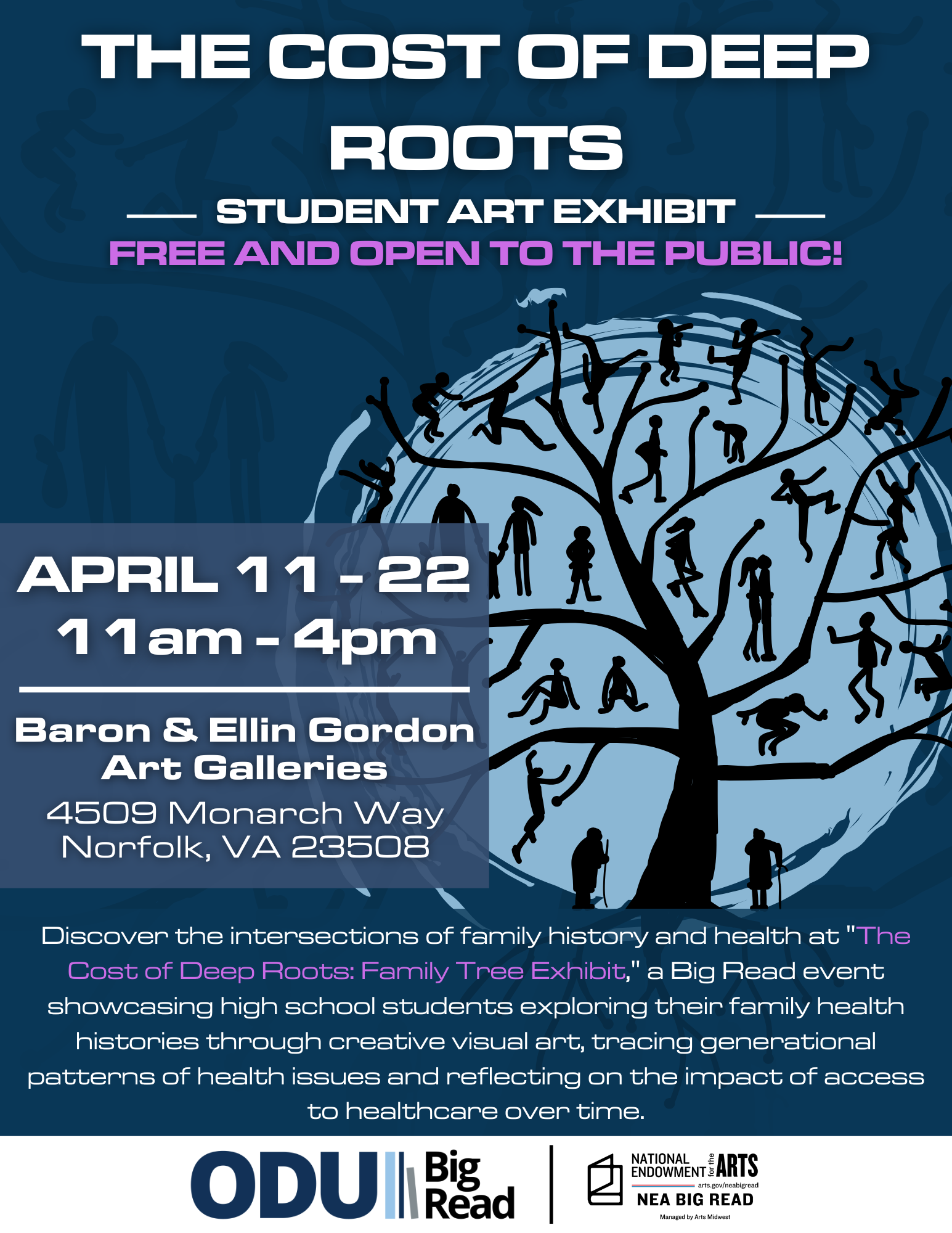 Discover the intersections of family history and health at "The Cost of Deep Roots: Family Tree Exhibit," a thought-provoking Big Read event showcasing the artistic talents of high school students. In this unique exhibition, students explore their own family health histories through creative visual art, tracing generational patterns of health issues and reflecting on the impact of access to healthcare over time.