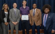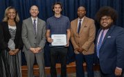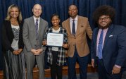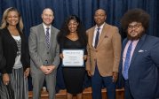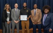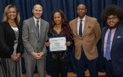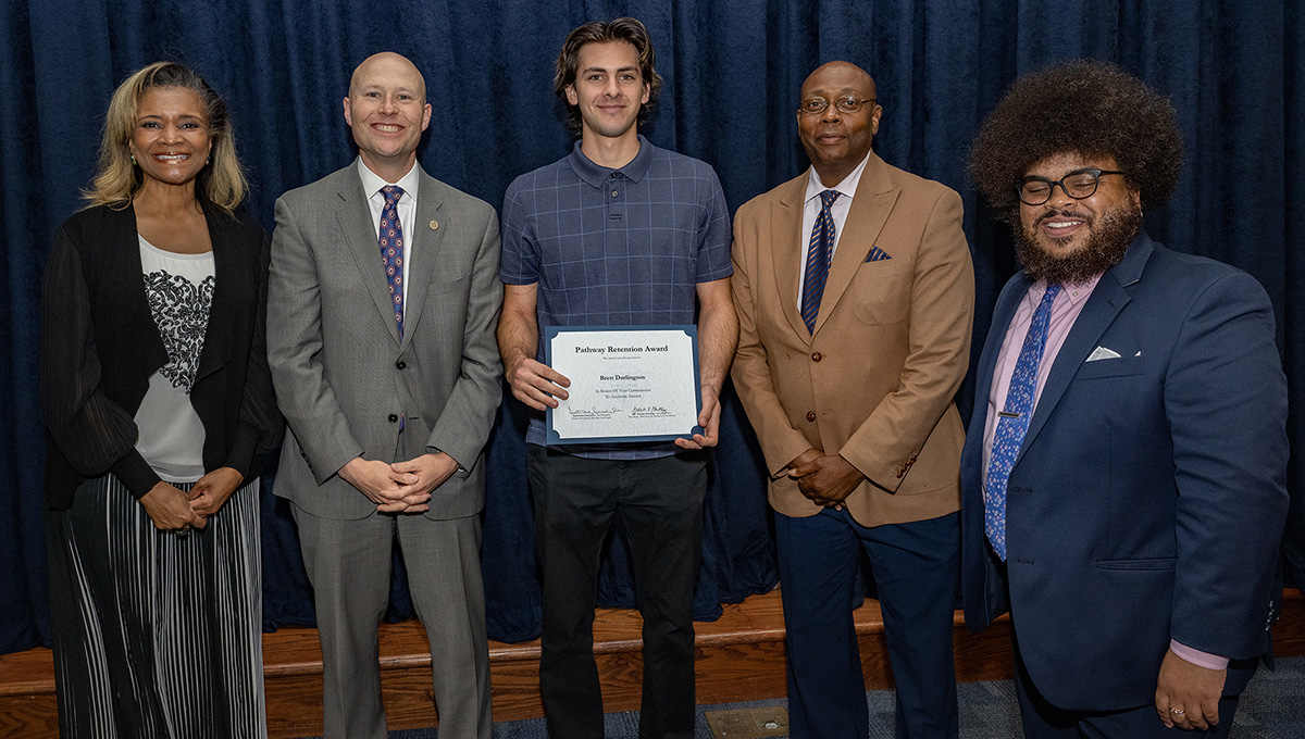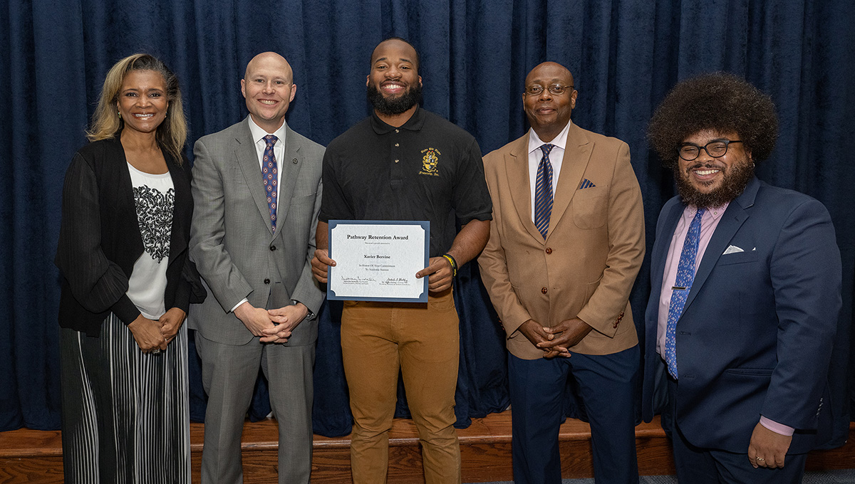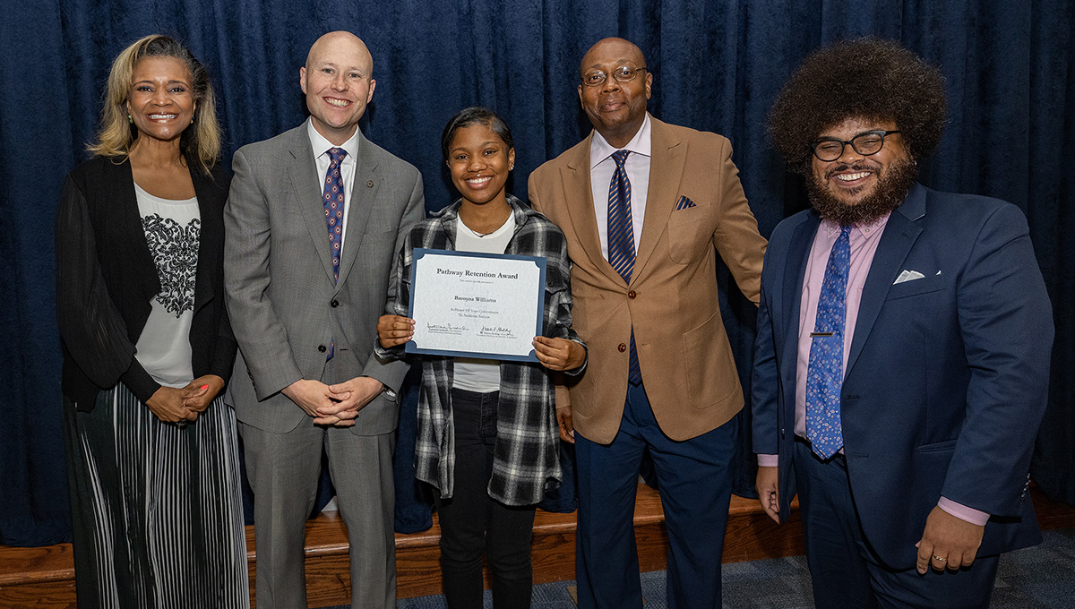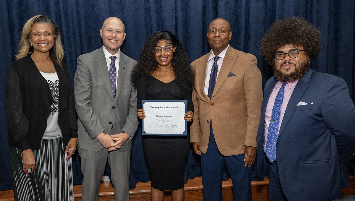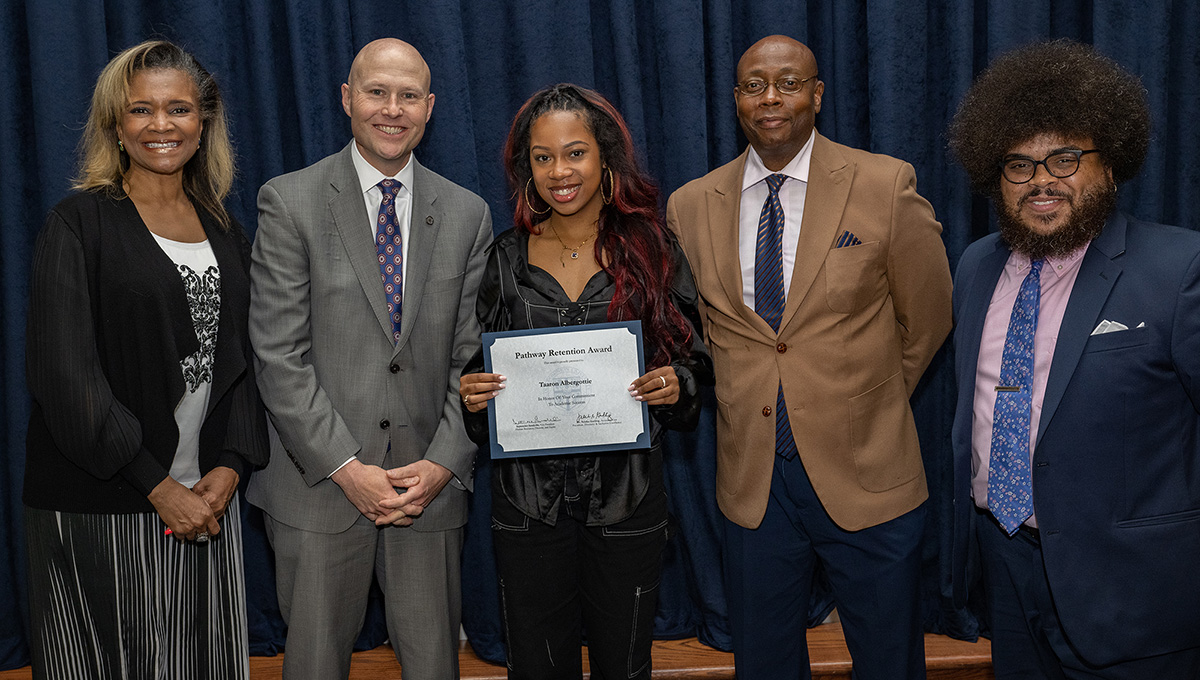 Taaron Albergottie, center, accepts the 2023 Pathway Retention Award.
