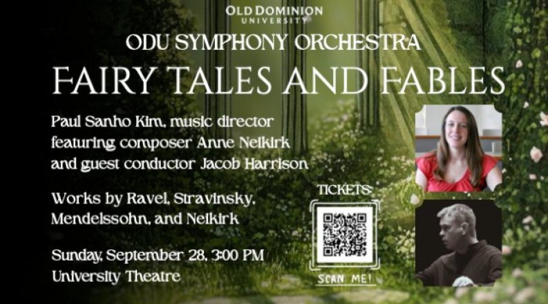 The ODU Symphony Orchestra opens its 2025-26 season with music full of fantasy and imagination. Hear the spirit and wit of Fables, a whimsical composition by local composer Anne Neikirk. Maurice Ravel’s Mother Goose Suite, with its enchanting representations of such fairy tales as Tom Thumb and Beauty and the Beast, will feature guest conductor Jacob Harrison from Texas State University. Dive into Shakespeare’s world of fairies and myths with Felix Mendelssohn’s Overture and Incidental Music to A Midsummer Night’s Dream. Finally, enjoy the thrill of Igor Stravinsky’s Berceuse and Finale from The Firebird. Paul Sanho Kim, director and conductor.
