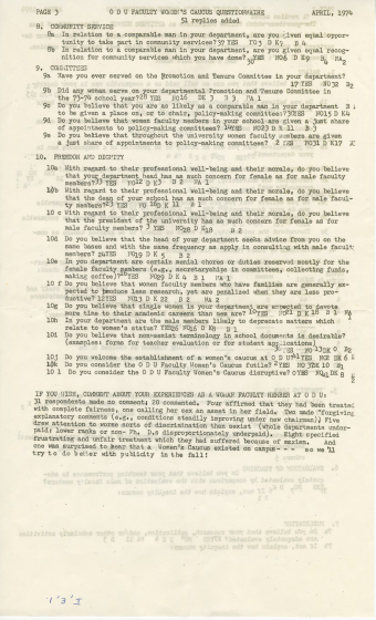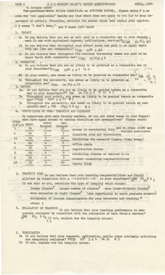 Surveys, both inside and outside the classroom, are effective tools for gathering information and implementing change. In April 1974 the ODU Faculty Women's Caucus conducted an attitudinal survey of the campus. With 51 respondents, this document provided insight into the university climate and served as a catalyst for change. Divided into 10 sections, the survey questions focused on salary, promotion, tenure, teaching load, teaching evaluations, publications, committee service, committees, and freedom and dignity. Survey respondents identified salary as a significant concern. When asked if they believed they were paid comparably to men in their department, 23 responded no, 12 responded yes, and 15 were undecided. Similar disparities were found in pay equity across the university.
