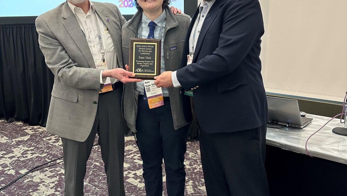 Sam Vest, Lecturer in the ODU School of Dental Hygiene, was recognized by the PRIDE (Promoting Respect for Identity Dignity and Expression) Section with an Award for Service and Leadership. They were recognized for their efforts in diversity and inclusion, specifically as it relates to LGBTQ+ populations.