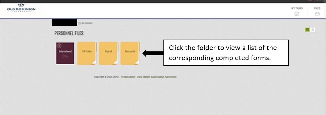 - Clicking the "Files" icon will show your personnel files (see below). Clicking each folder will open the forms associated with the folder. Click on any form to view it.