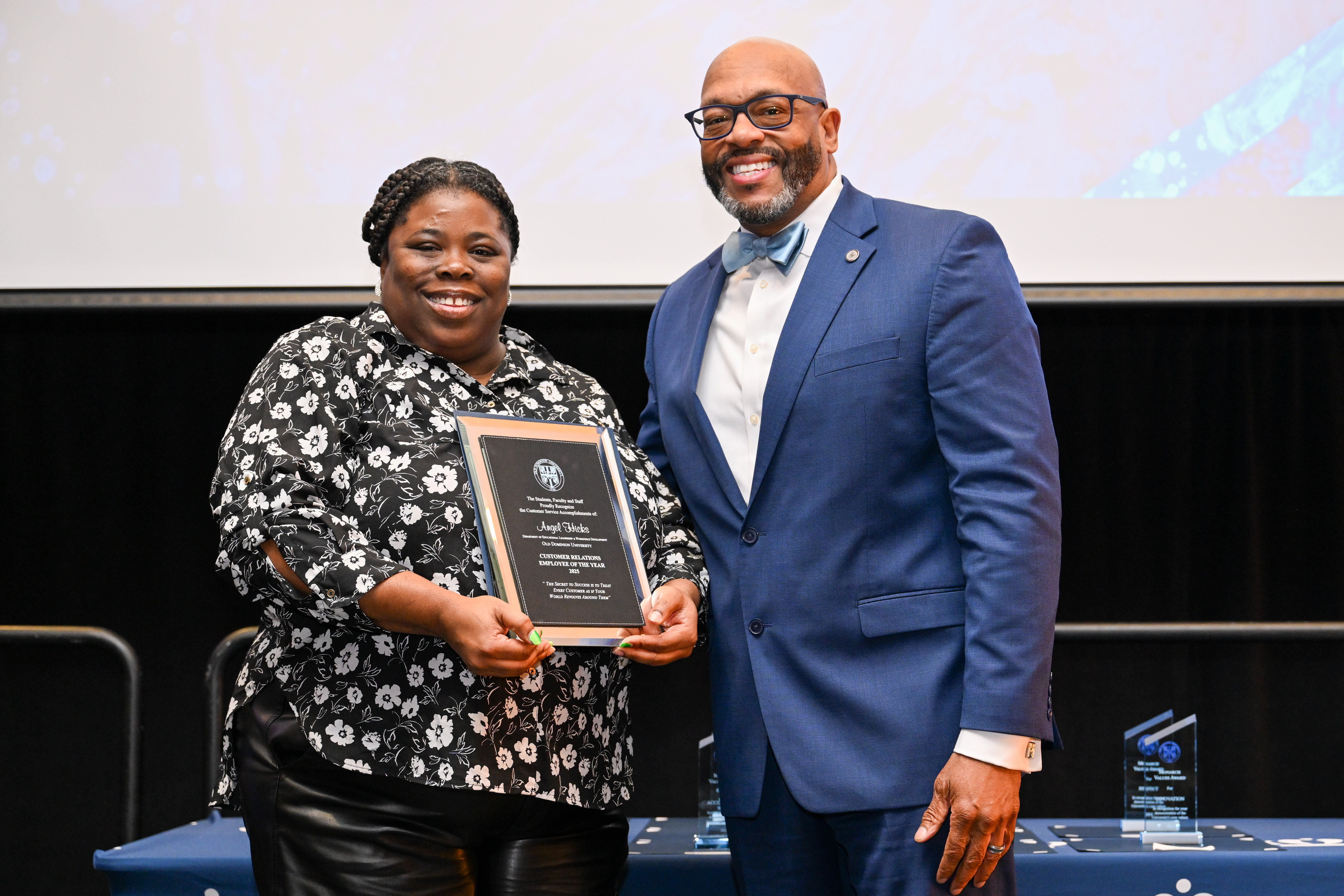2018 Customer Relations Employee of the Year Deidre Hall with President John R. Broderick.