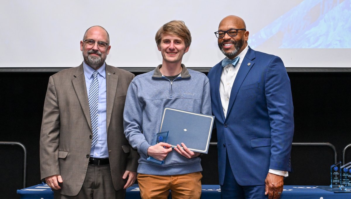 President Brian O. Hemphill and Interim Provost and Executive Vice President Brian Payne with Monarch Values Award winner Jared Sykes at the Monarch Milestones Celebration on April 10, 2025.