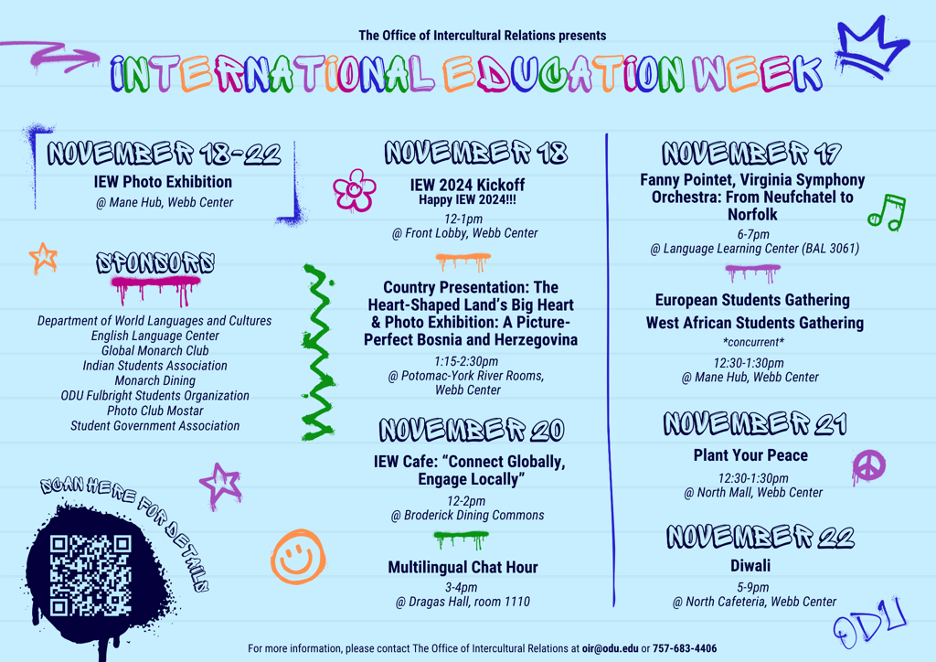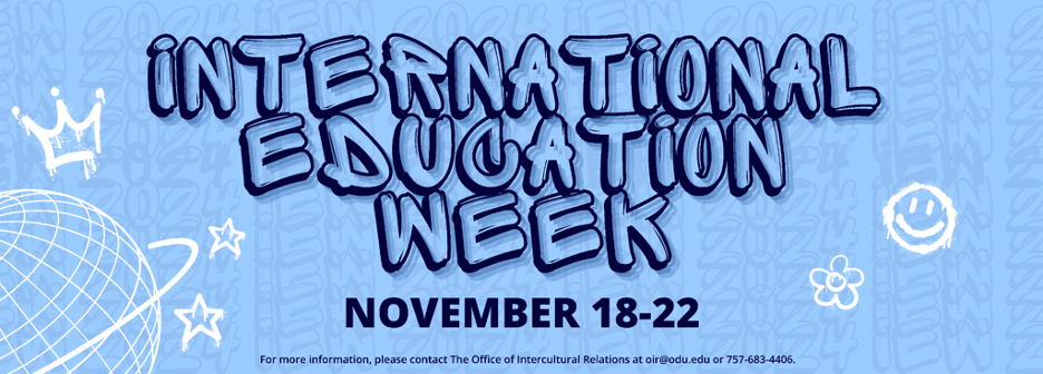 The Office of Intercultural Relations (OIR) supports the internationalization and intercultural engagement efforts on Old Dominion University's campus. OIR's International Initiatives invites you to participate in the International Education Week (IEW) in a variety of activities, from simply adding international topics to your class to the creation of a presentation or a program designed to celebrate, engage, and prepare students and communities for a global society.