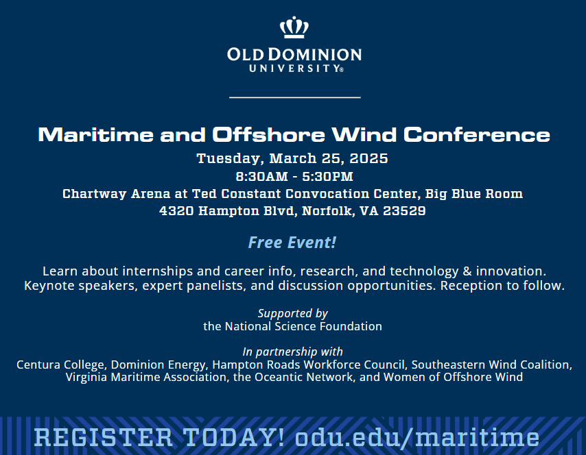 ODU's 4th Annual Maritime Conference, NextWave: Advancing the Future of Shipbuilding and Ship Repair through Industry Collaboration, Innovation, and Workforce Development. March 10th. Registration is open (free):