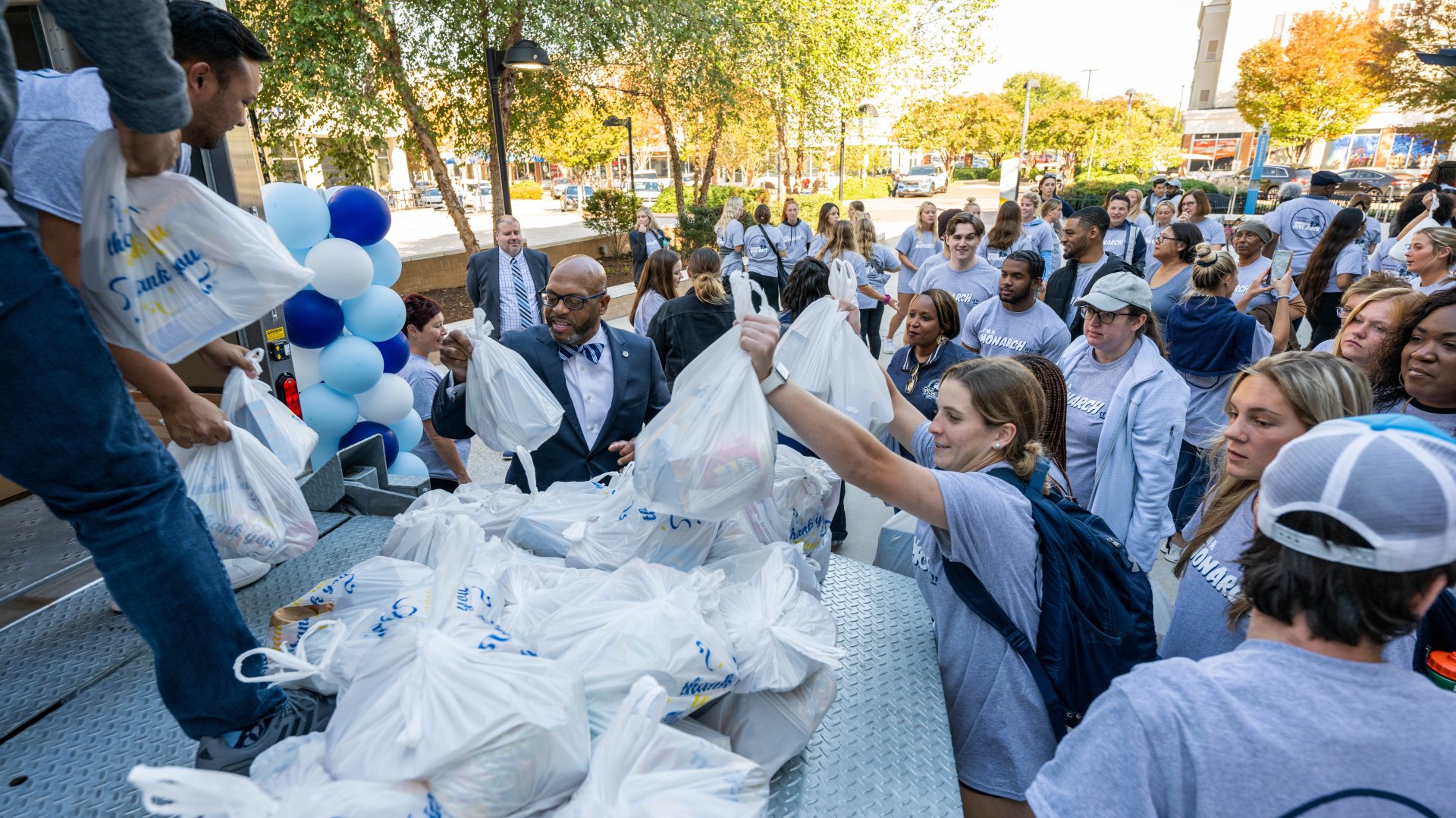 Launched in 2021, Monarchs Give Back began as a campus-led food collection and has grown into a region-wide movement of service and solidarity. With the recent integration of EVMS to form the Macon & Joan Brock Virginia Health Sciences at Old Dominion University, has only increased in scope.