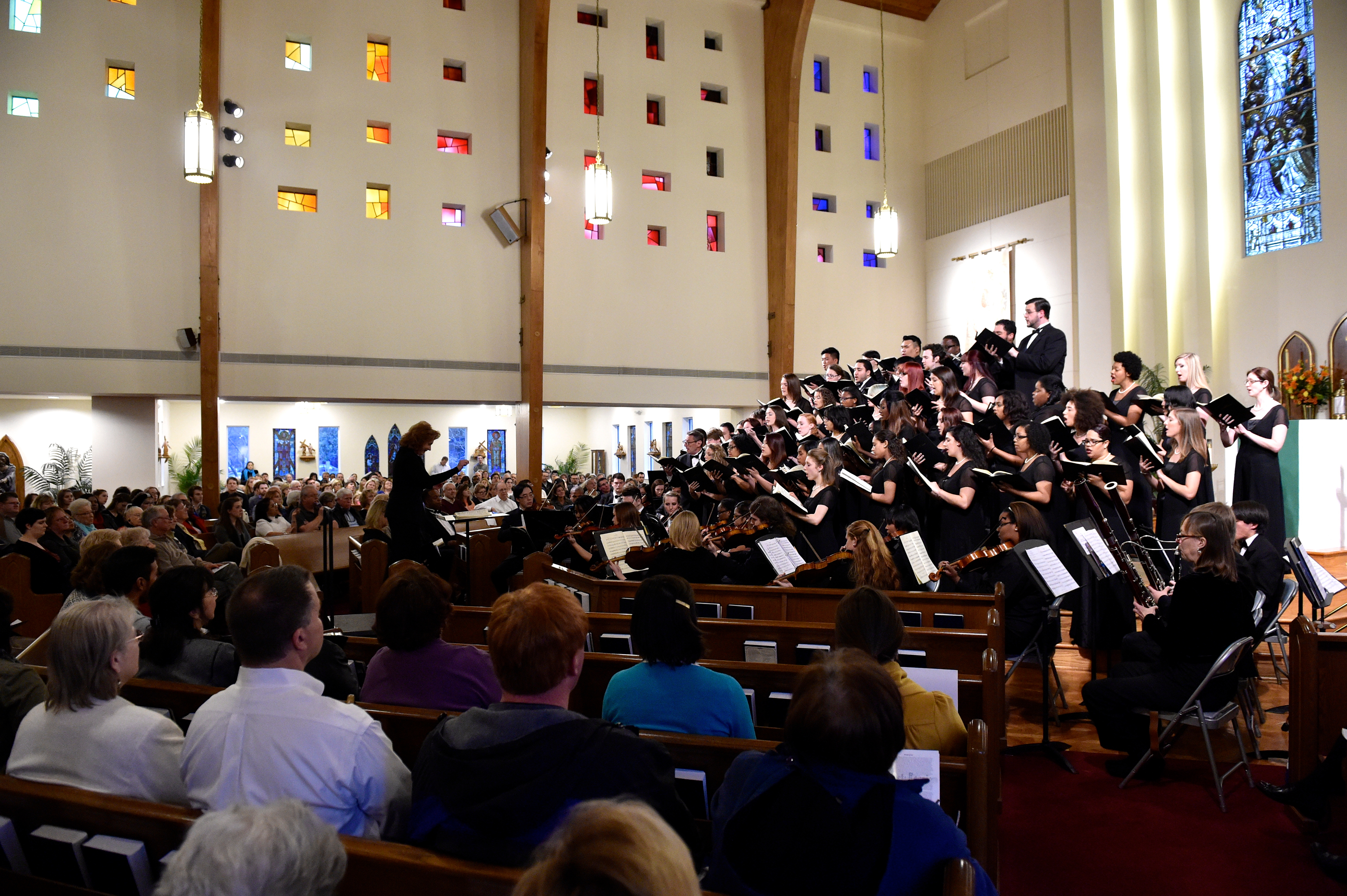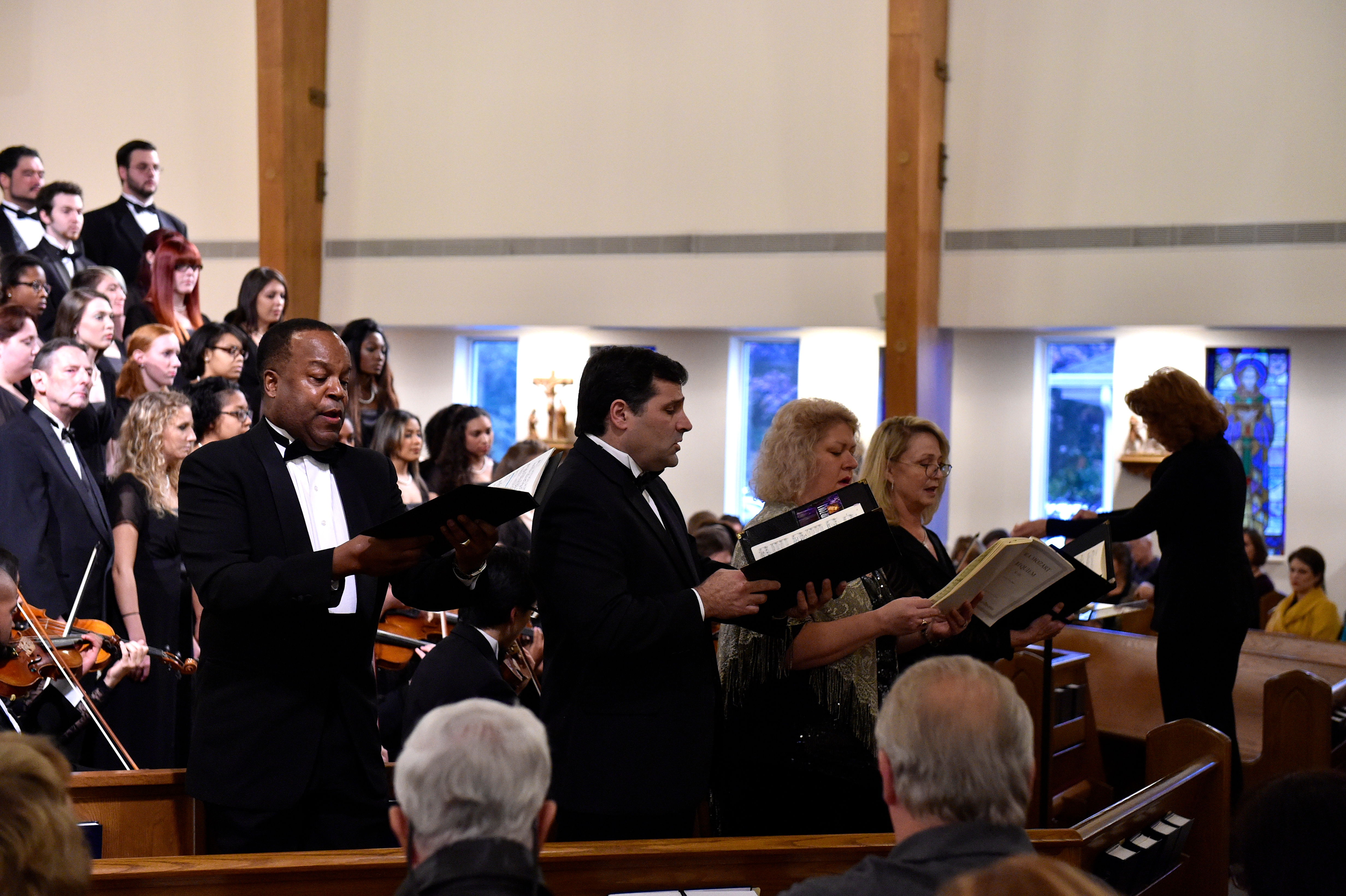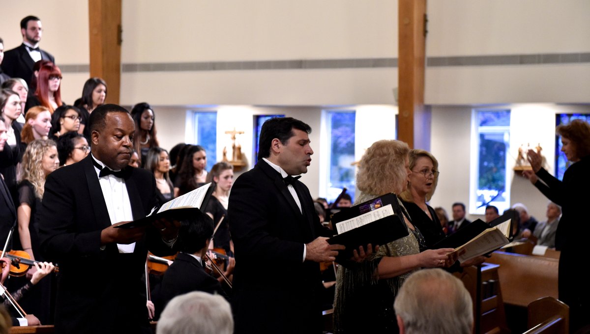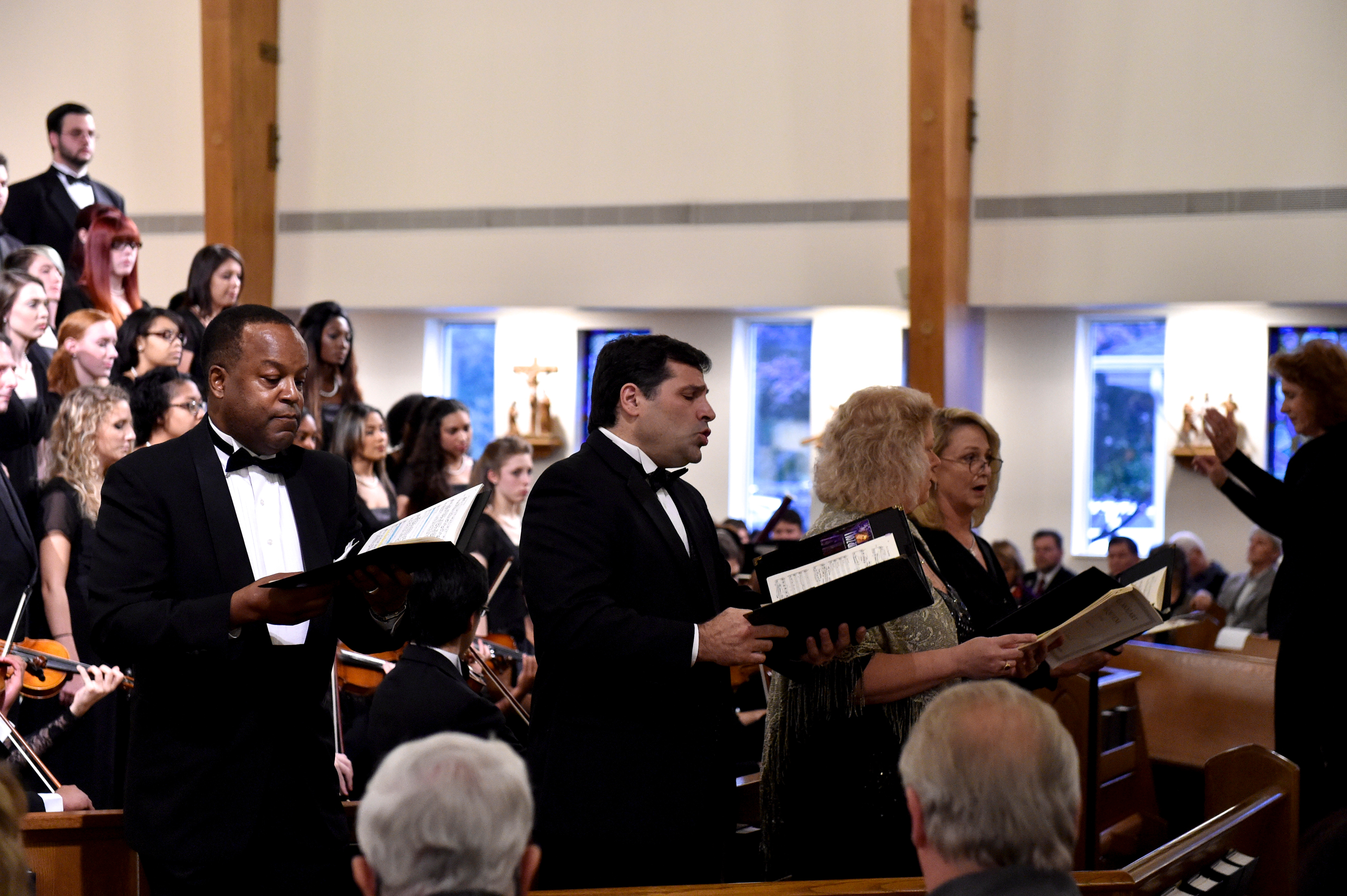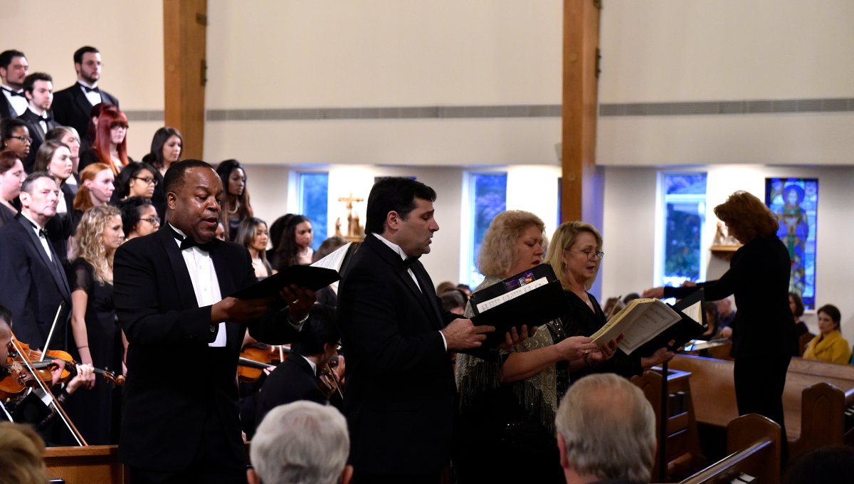 The Old Dominion University Concert Choir and Symphony Orchestra presented the Mozart Requiem, in tribute to Dr. Lee Teply, on Sunday, November 16 at Blessed Sacrament Catholic Church, Norfolk, VA. The performance featured F. Ludwig Diehn School of Music Voice faculty Agnes Fuller Mobley-Wynne, Soprano, Kelly Montgomery, Alto, Brian Nedvin, Tenor, along with area vocalist Gregory Gardner, Bass. The ODU Symphony Orchestra is directed by Paul S. Kim. This performance was conducted by Nancy K. Klein. See the photos, below.
