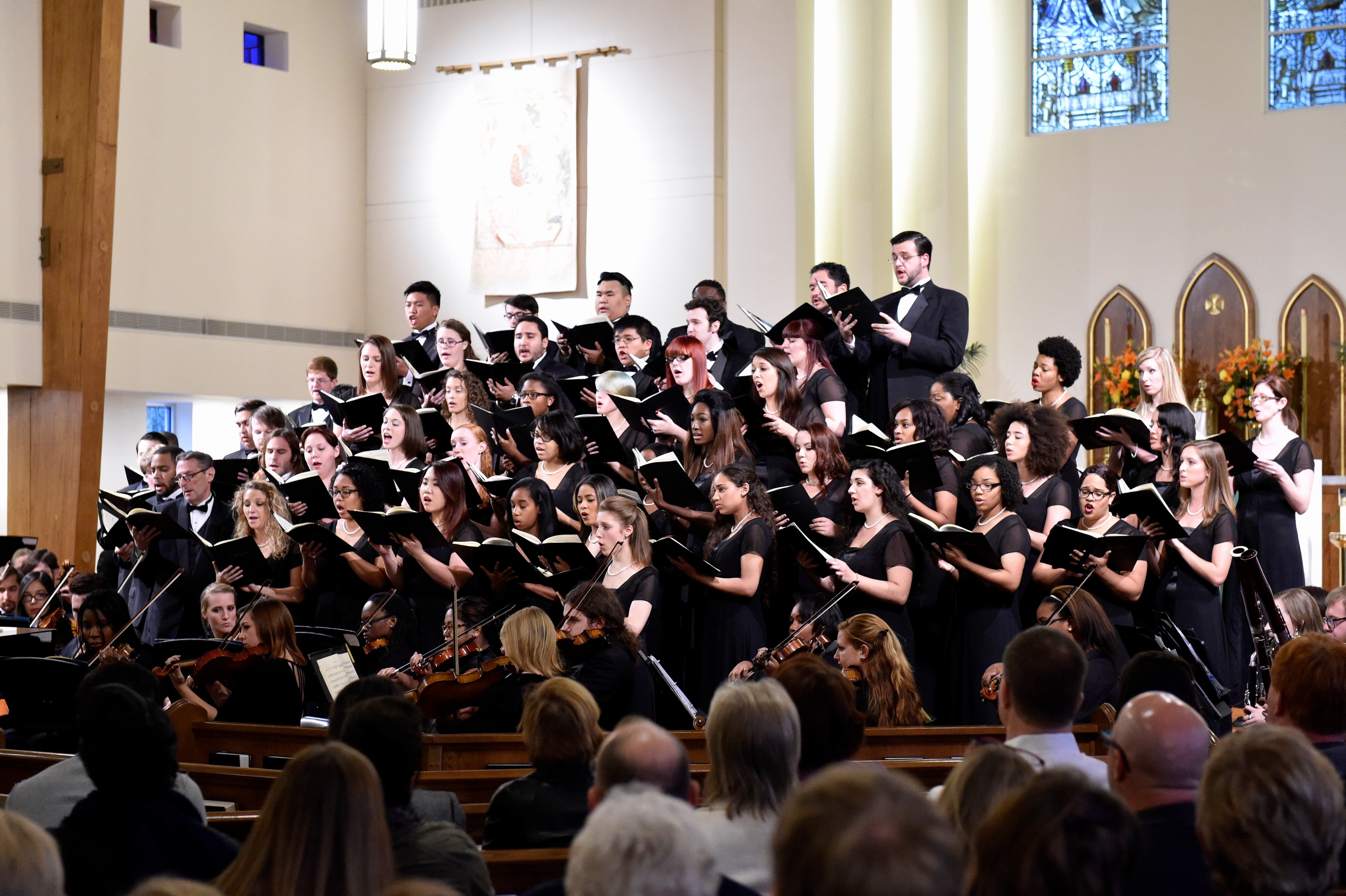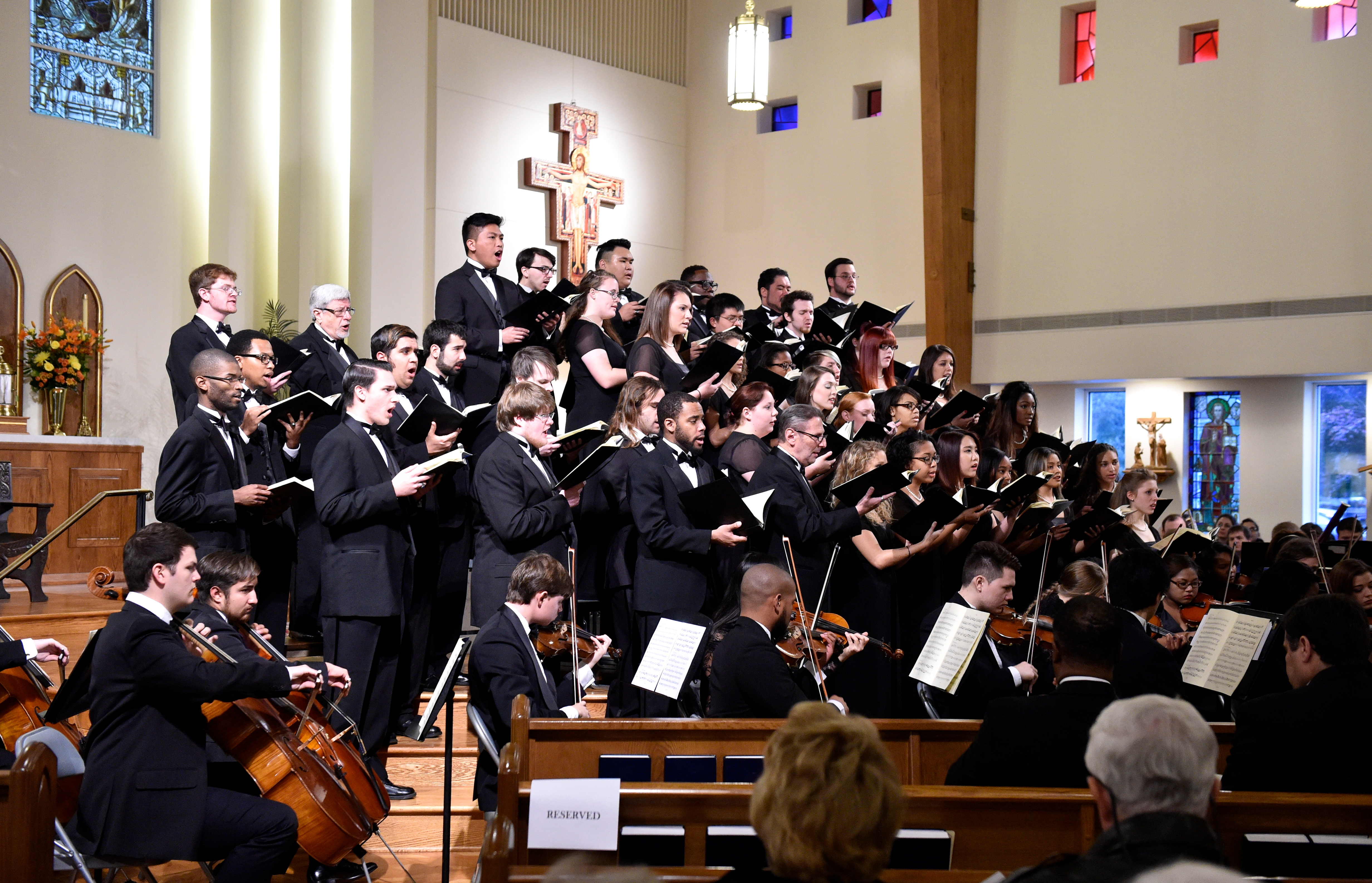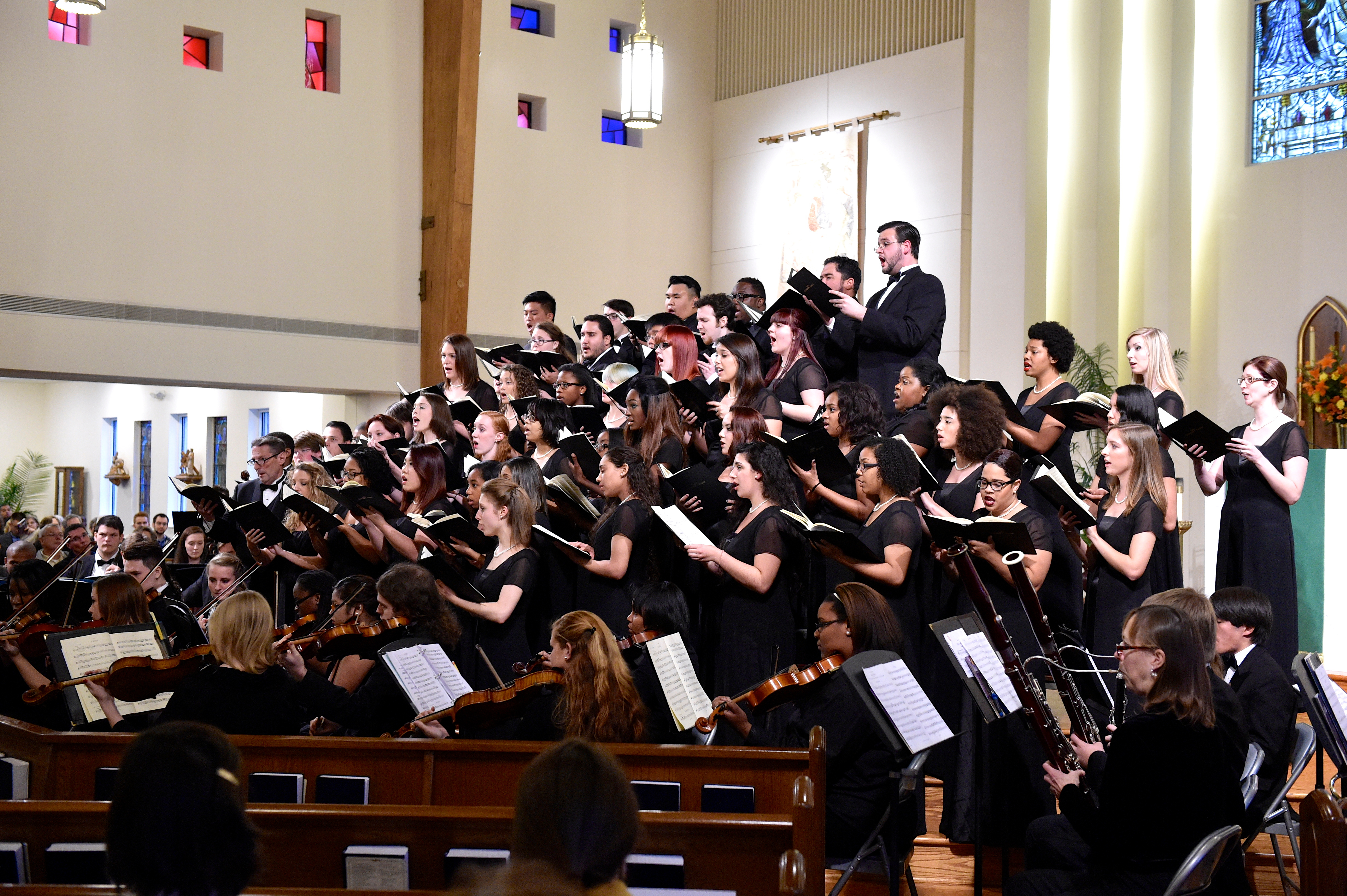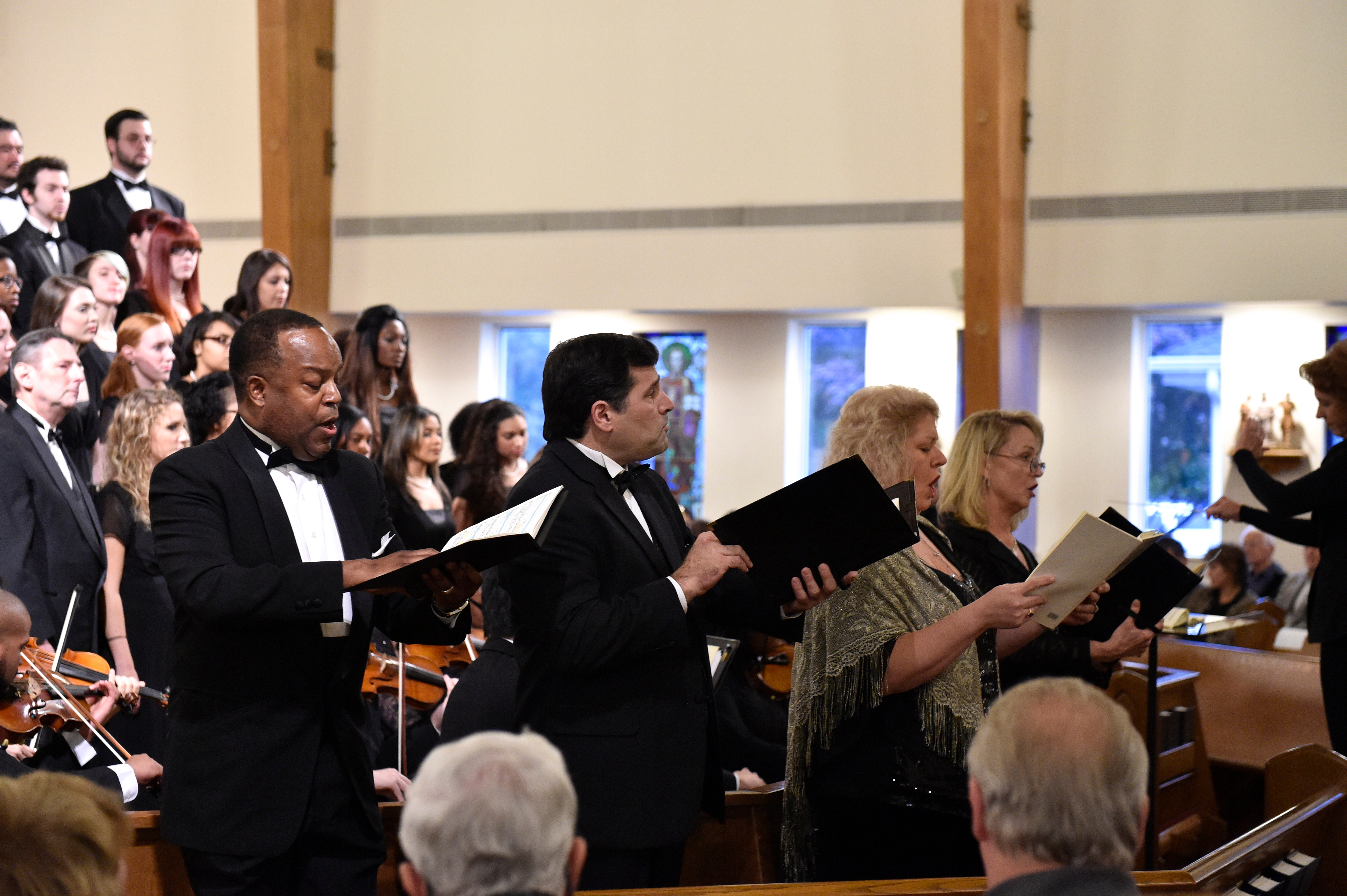 The Old Dominion University Concert Choir and Symphony Orchestra presented the Mozart Requiem, in tribute to Dr. Lee Teply, on Sunday, November 16 at Blessed Sacrament Catholic Church, Norfolk, VA. The performance featured F. Ludwig Diehn School of Music Voice faculty Agnes Fuller Mobley-Wynne, Soprano, Kelly Montgomery, Alto, Brian Nedvin, Tenor, along with area vocalist Gregory Gardner, Bass. The ODU Symphony Orchestra is directed by Paul S. Kim. This performance was conducted by Nancy K. Klein. See the photos, below.