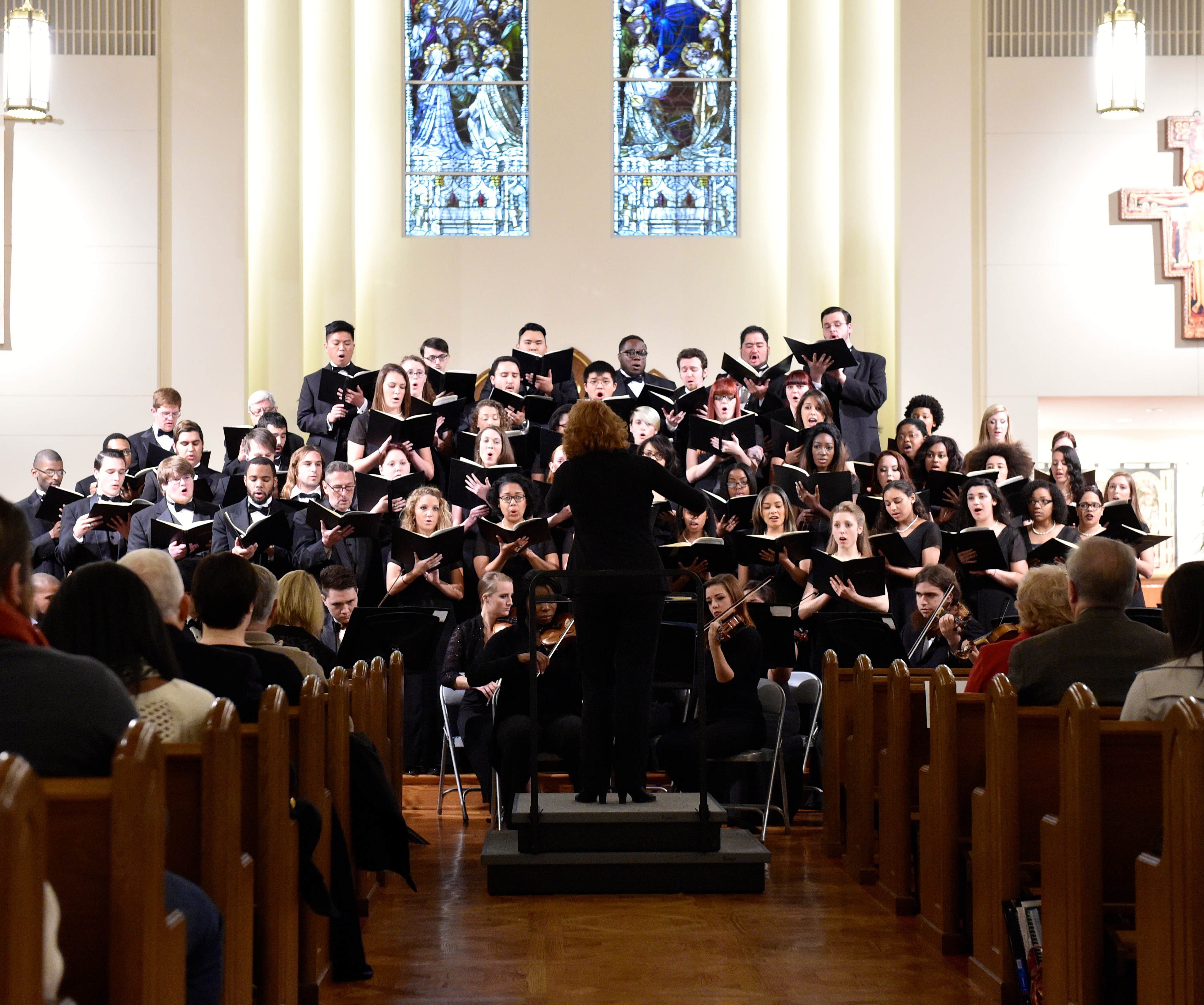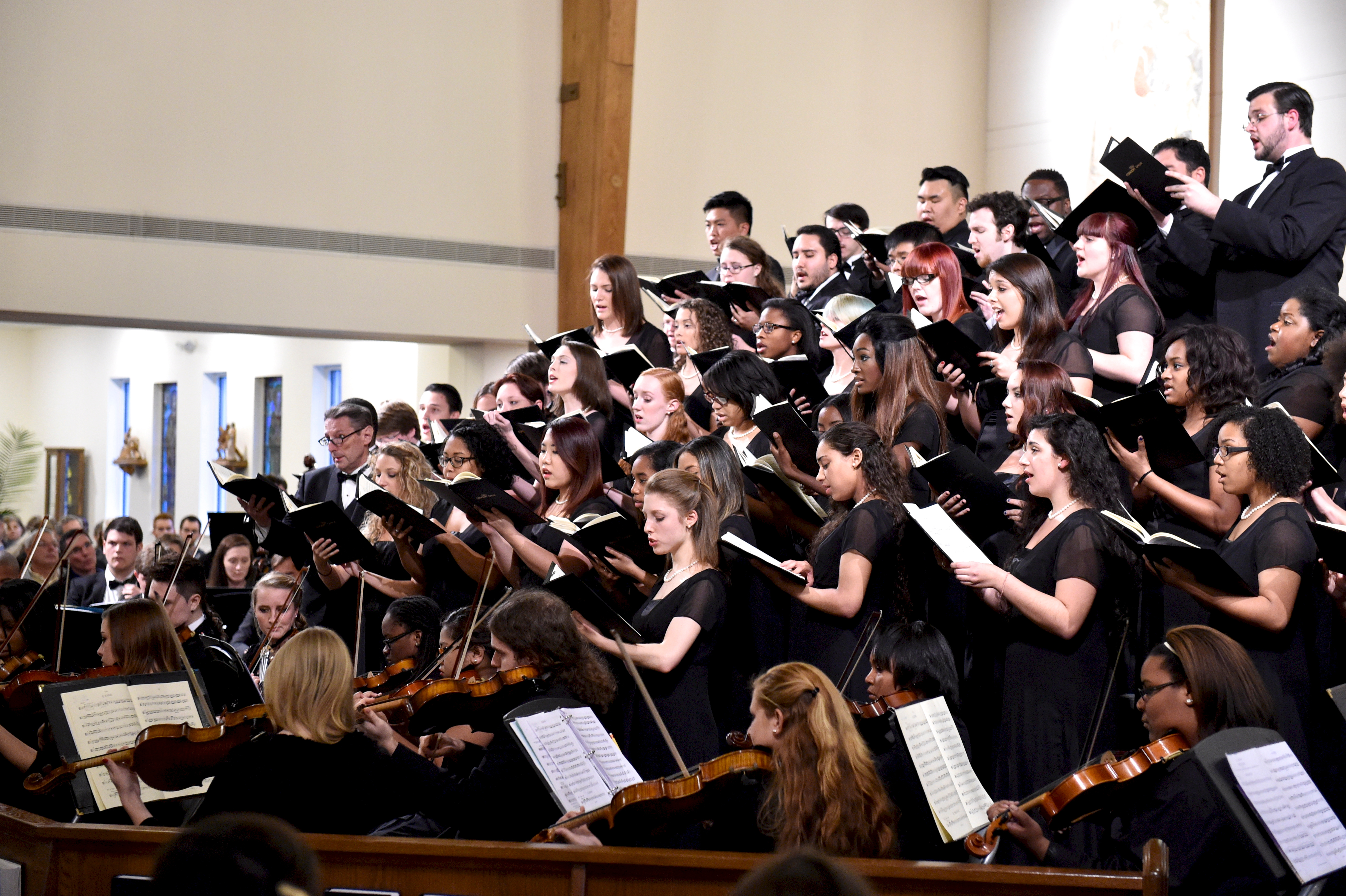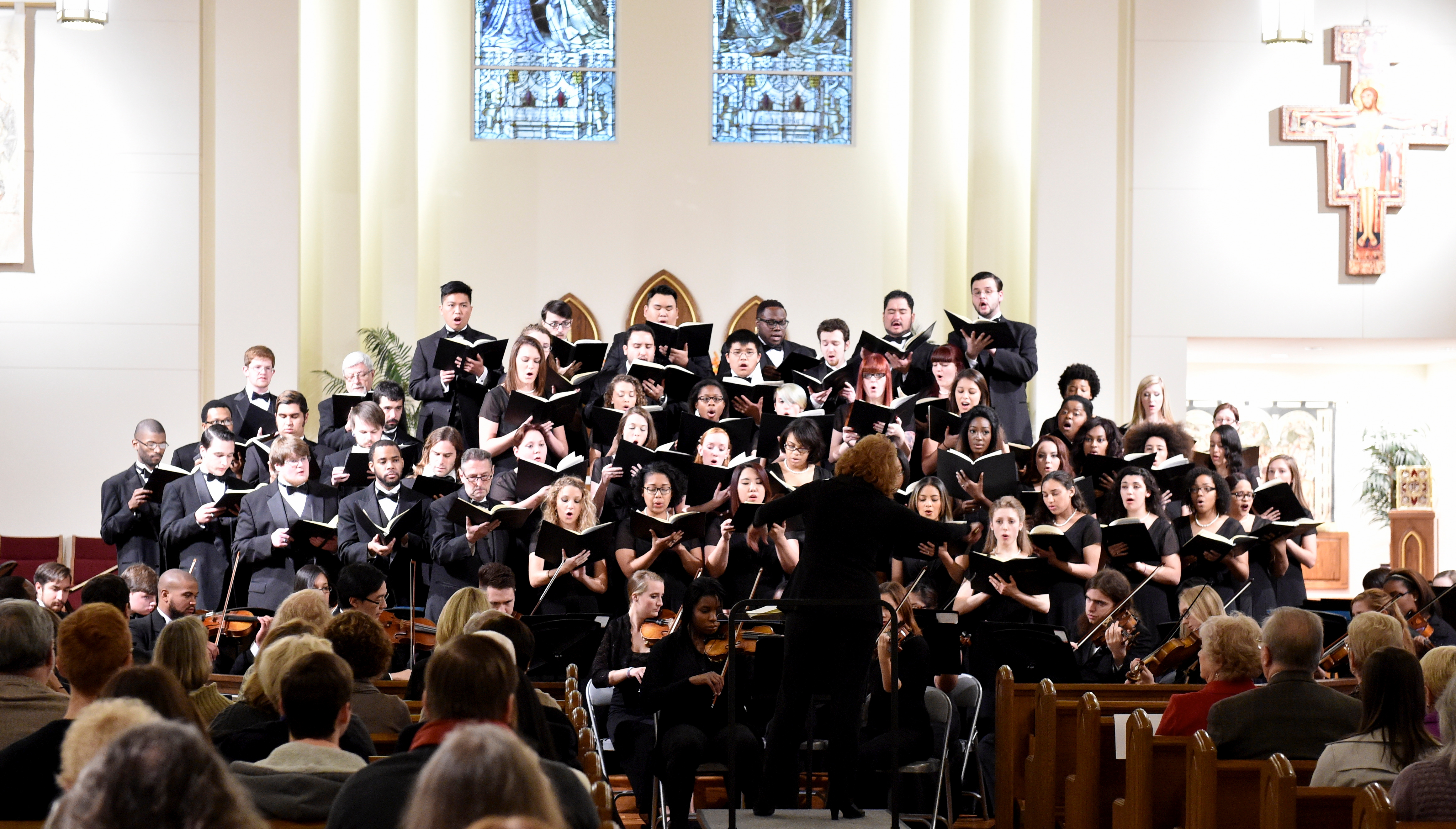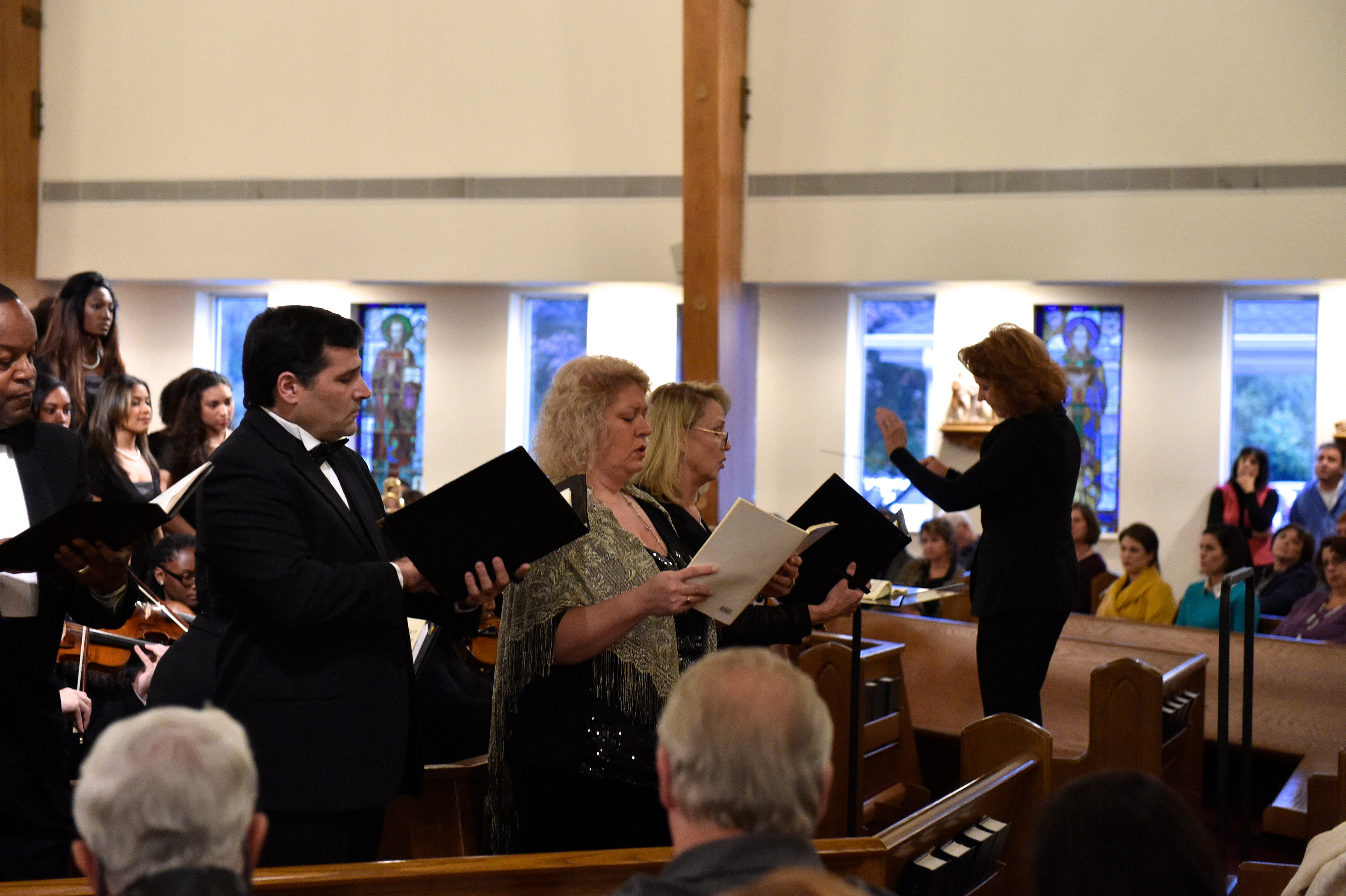 The Old Dominion University Concert Choir and Symphony Orchestra presented the Mozart Requiem, in tribute to Dr. Lee Teply, on Sunday, November 16 at Blessed Sacrament Catholic Church, Norfolk, VA. The performance featured F. Ludwig Diehn School of Music Voice faculty Agnes Fuller Mobley-Wynne, Soprano, Kelly Montgomery, Alto, Brian Nedvin, Tenor, along with area vocalist Gregory Gardner, Bass. The ODU Symphony Orchestra is directed by Paul S. Kim. This performance was conducted by Nancy K. Klein. See the photos, below.