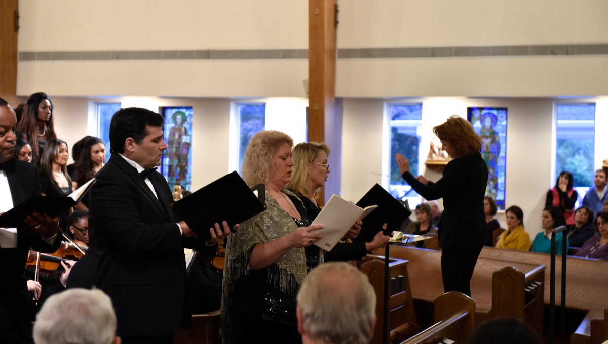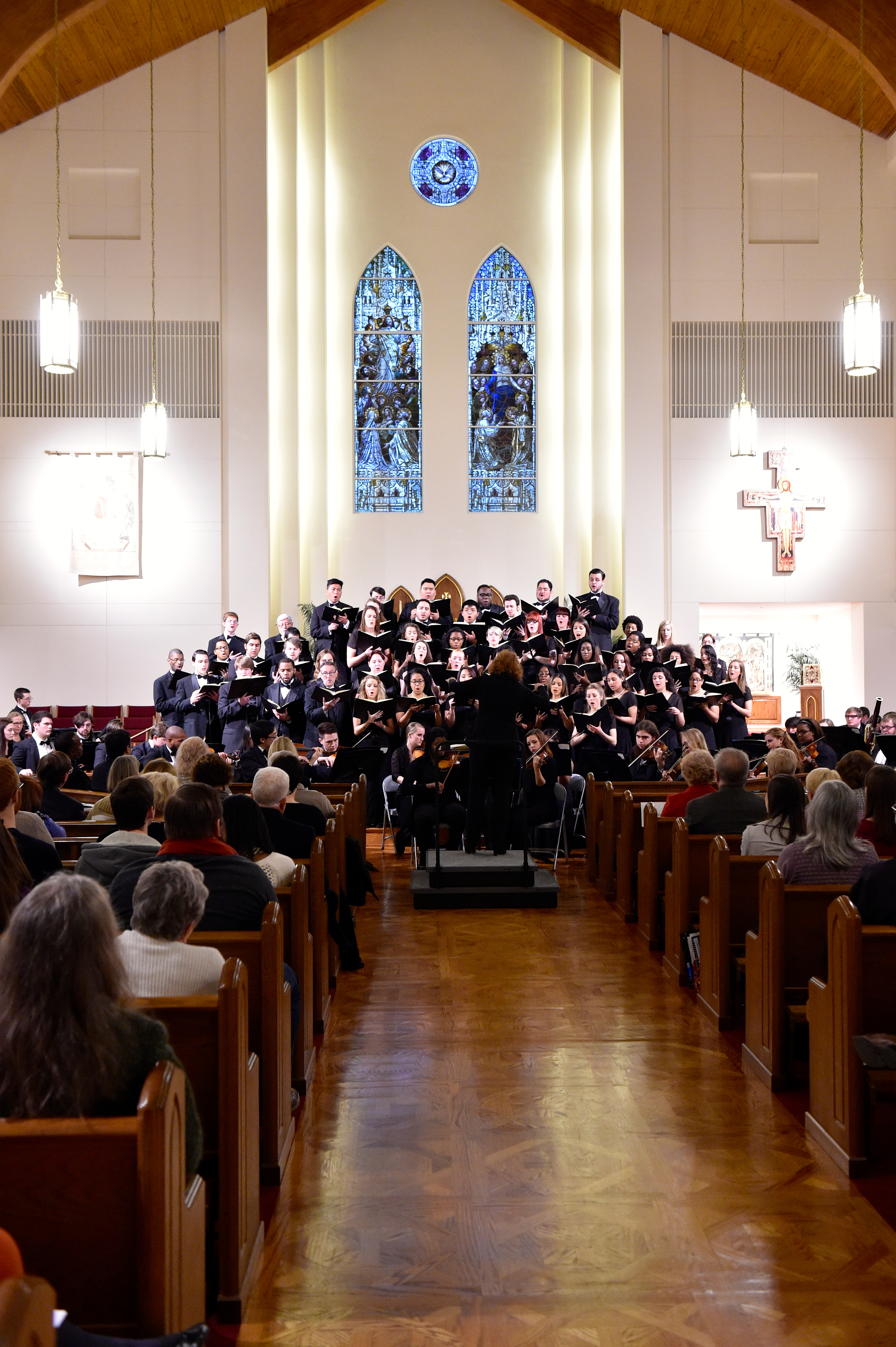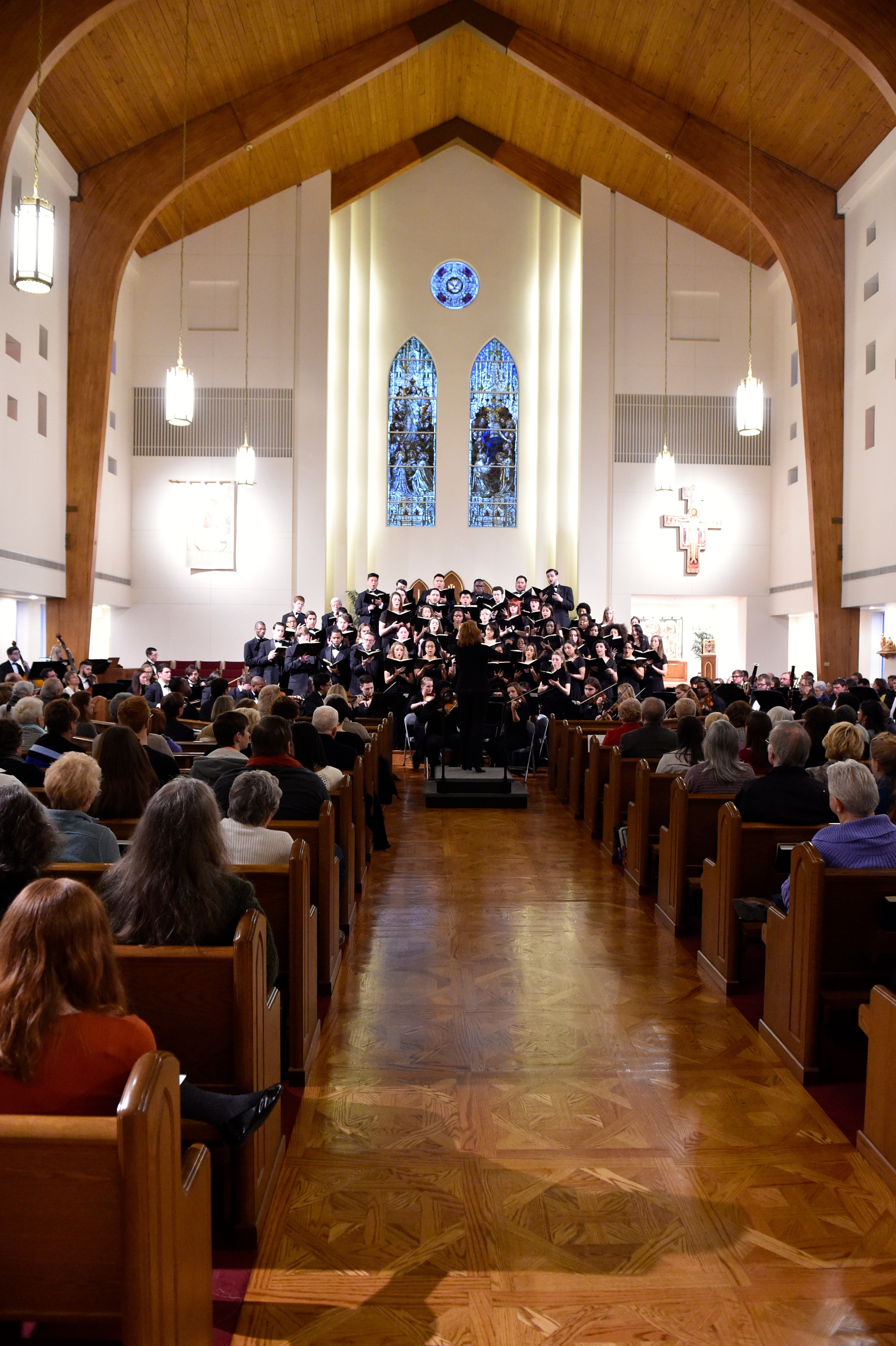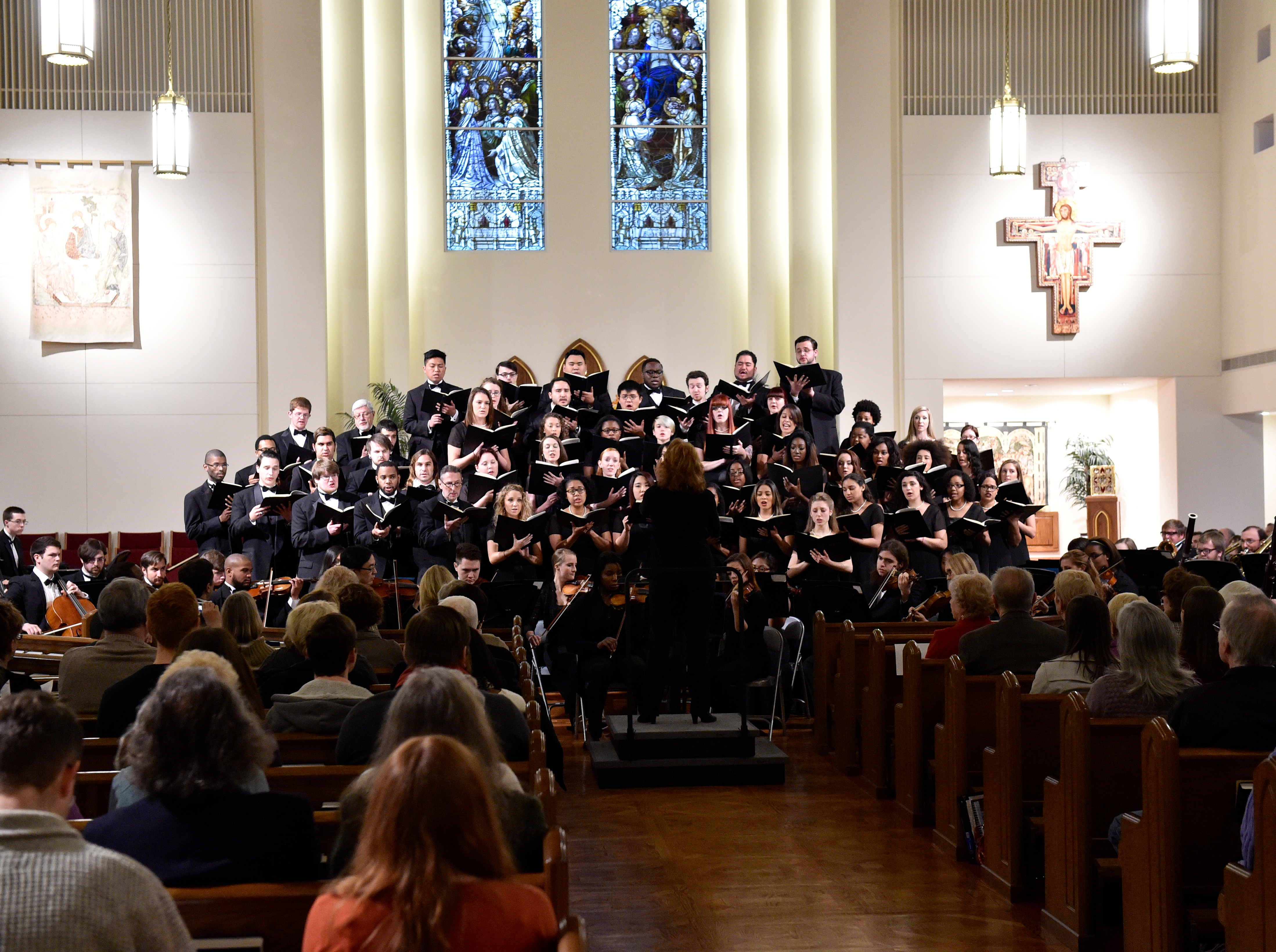 The Old Dominion University Concert Choir and Symphony Orchestra presented the Mozart Requiem, in tribute to Dr. Lee Teply, on Sunday, November 16 at Blessed Sacrament Catholic Church, Norfolk, VA. The performance featured F. Ludwig Diehn School of Music Voice faculty Agnes Fuller Mobley-Wynne, Soprano, Kelly Montgomery, Alto, Brian Nedvin, Tenor, along with area vocalist Gregory Gardner, Bass. The ODU Symphony Orchestra is directed by Paul S. Kim. This performance was conducted by Nancy K. Klein. See the photos, below.
