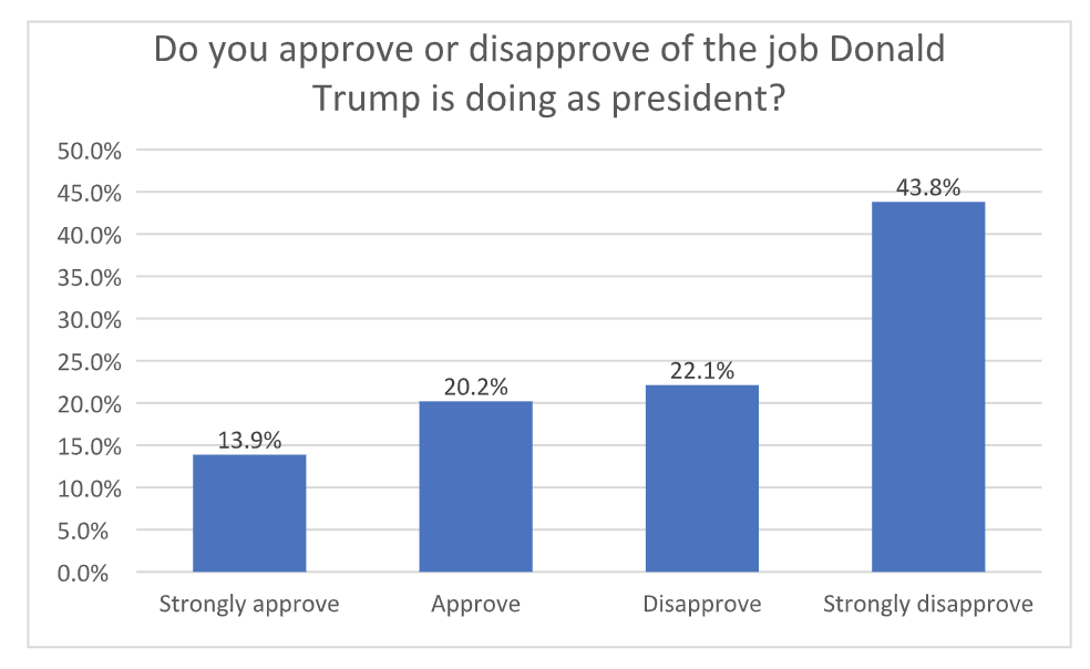 Respondents were asked: "Do you approve or disapprove of the job Donald Trump is doing as president?" Roughly one-third (34.1%) approved, with 13.9% strongly approving. Nearly two-thirds (65.9%) disapproved, with 43.8% disapproving strongly.