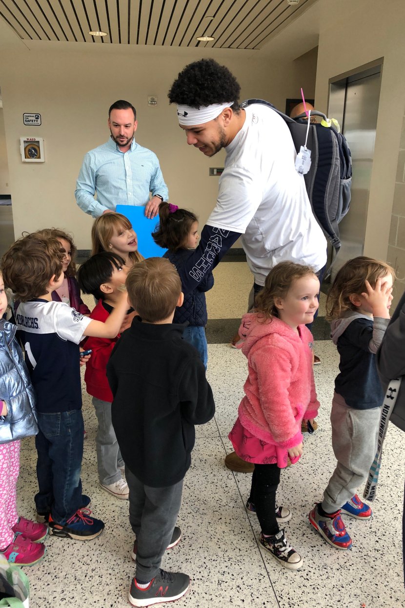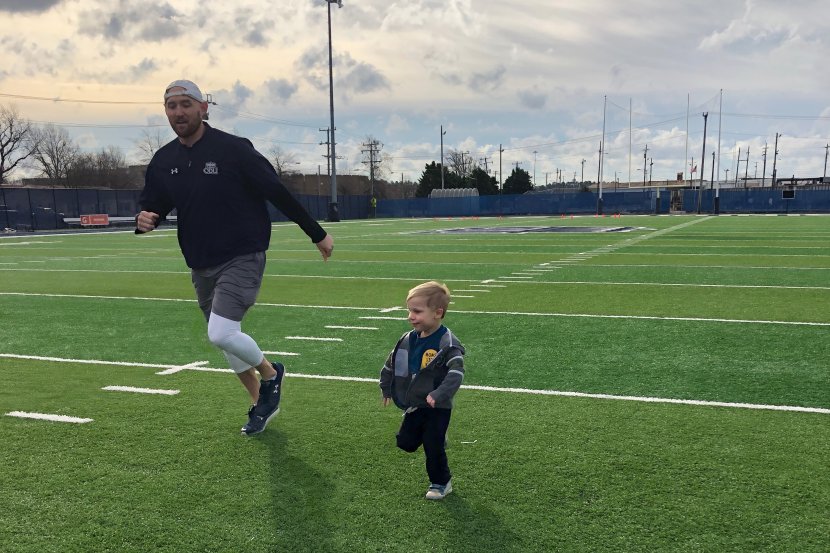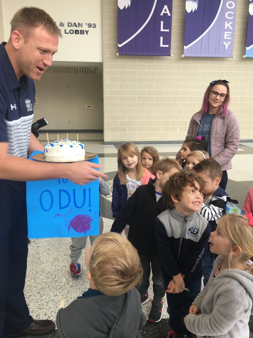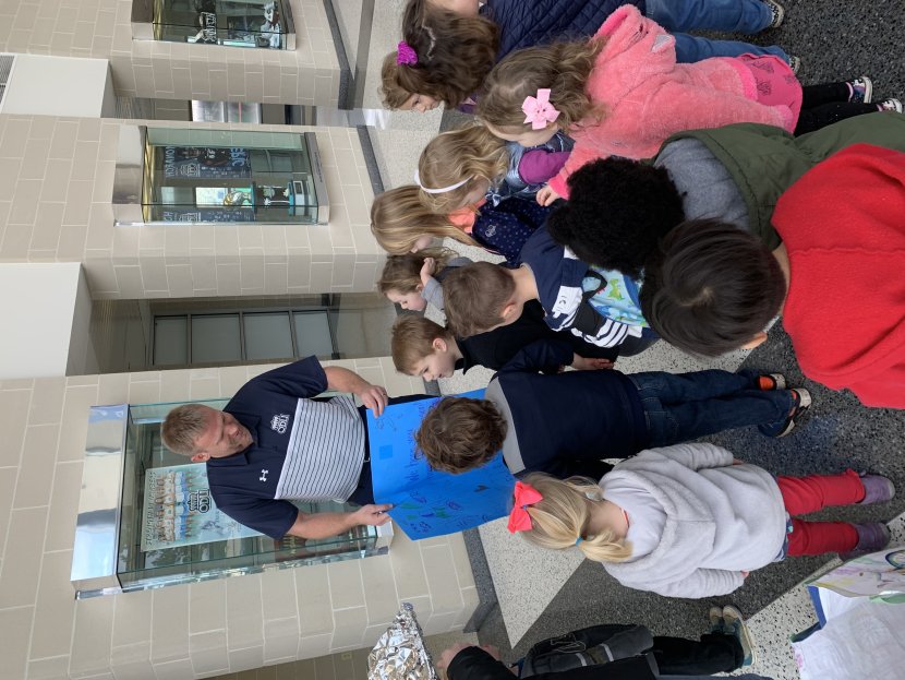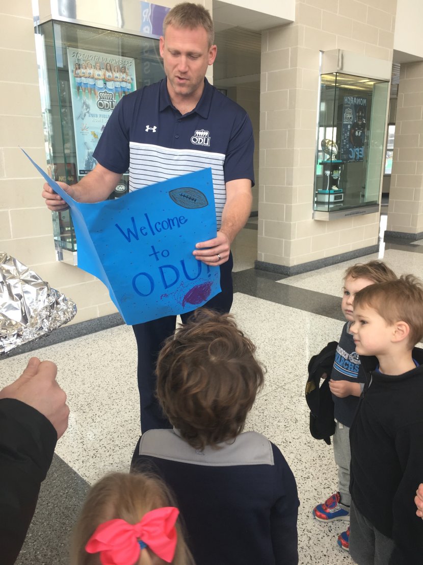 The Monarch classroom welcomed ODU's new football coach, Ricky Rahne, with a card and a homemade cake! Being new can sometimes be hard and a little scary. We wanted to make sure our new coach knew we are excited he has joined the ODU community. While there, we were introduced to some players, given a tour of the weight room, and we even got to race down the practice field!