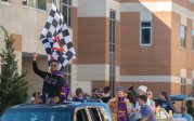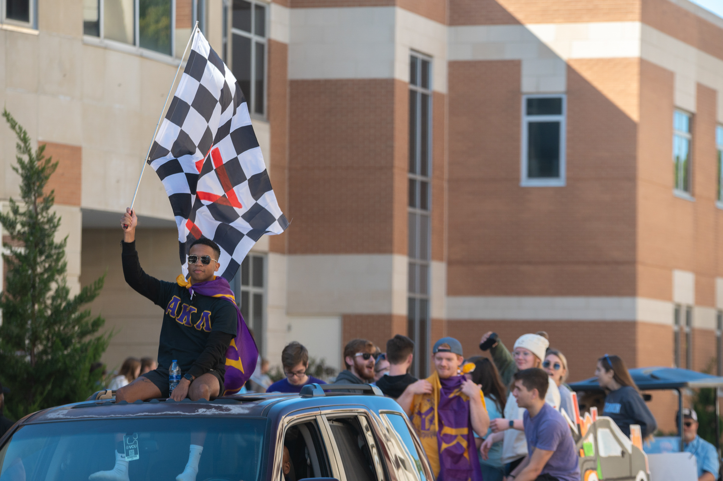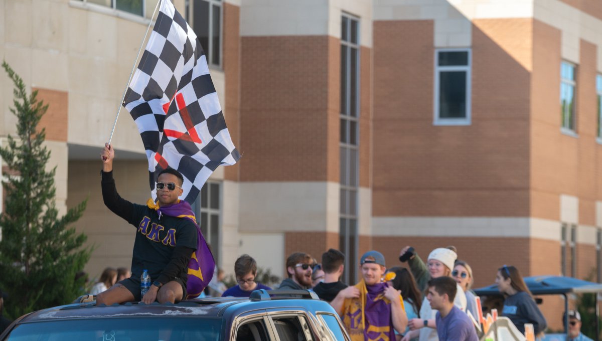 Alpha Kappa Lambda waves its flag during the Homecoming parade. Photo Nicholas Clark/ODU