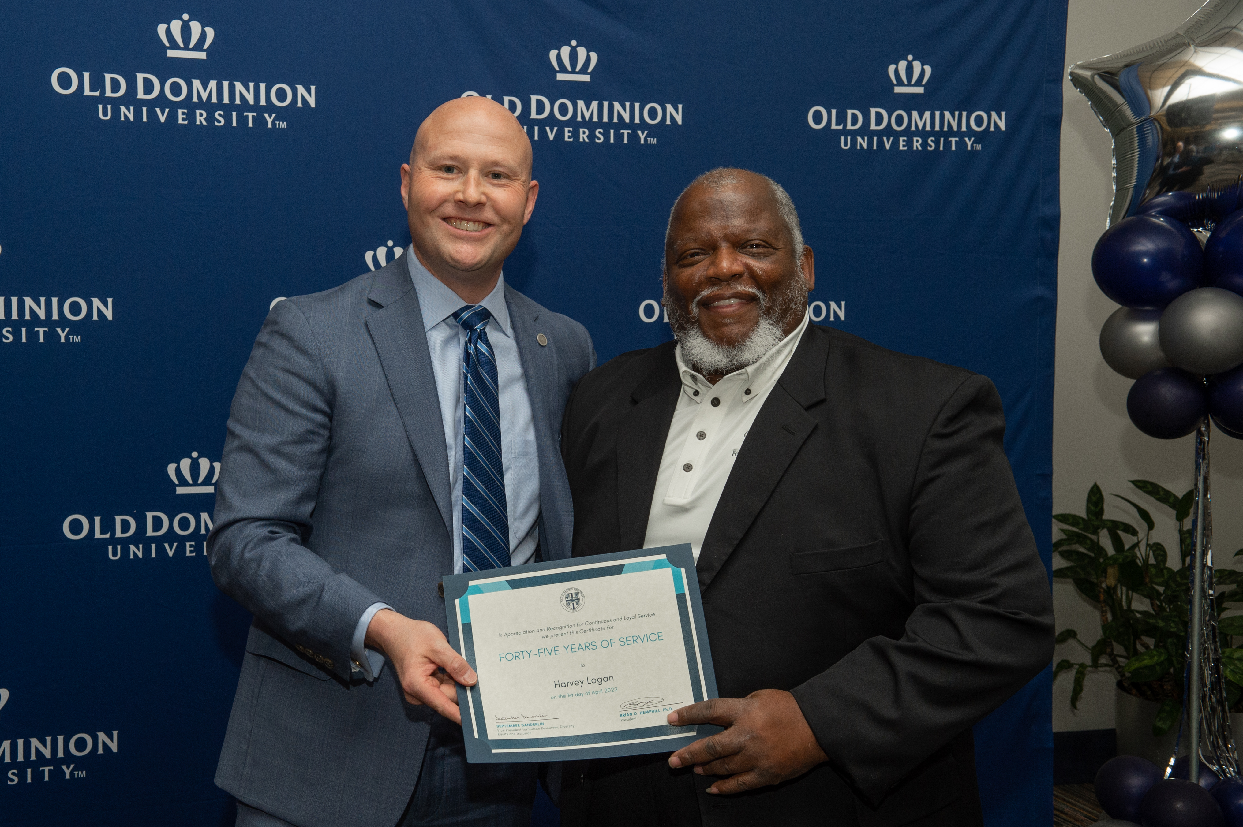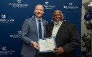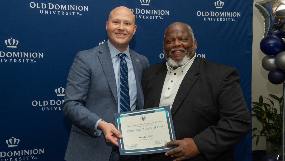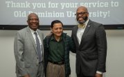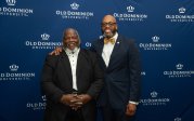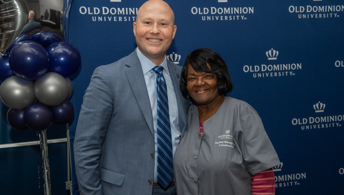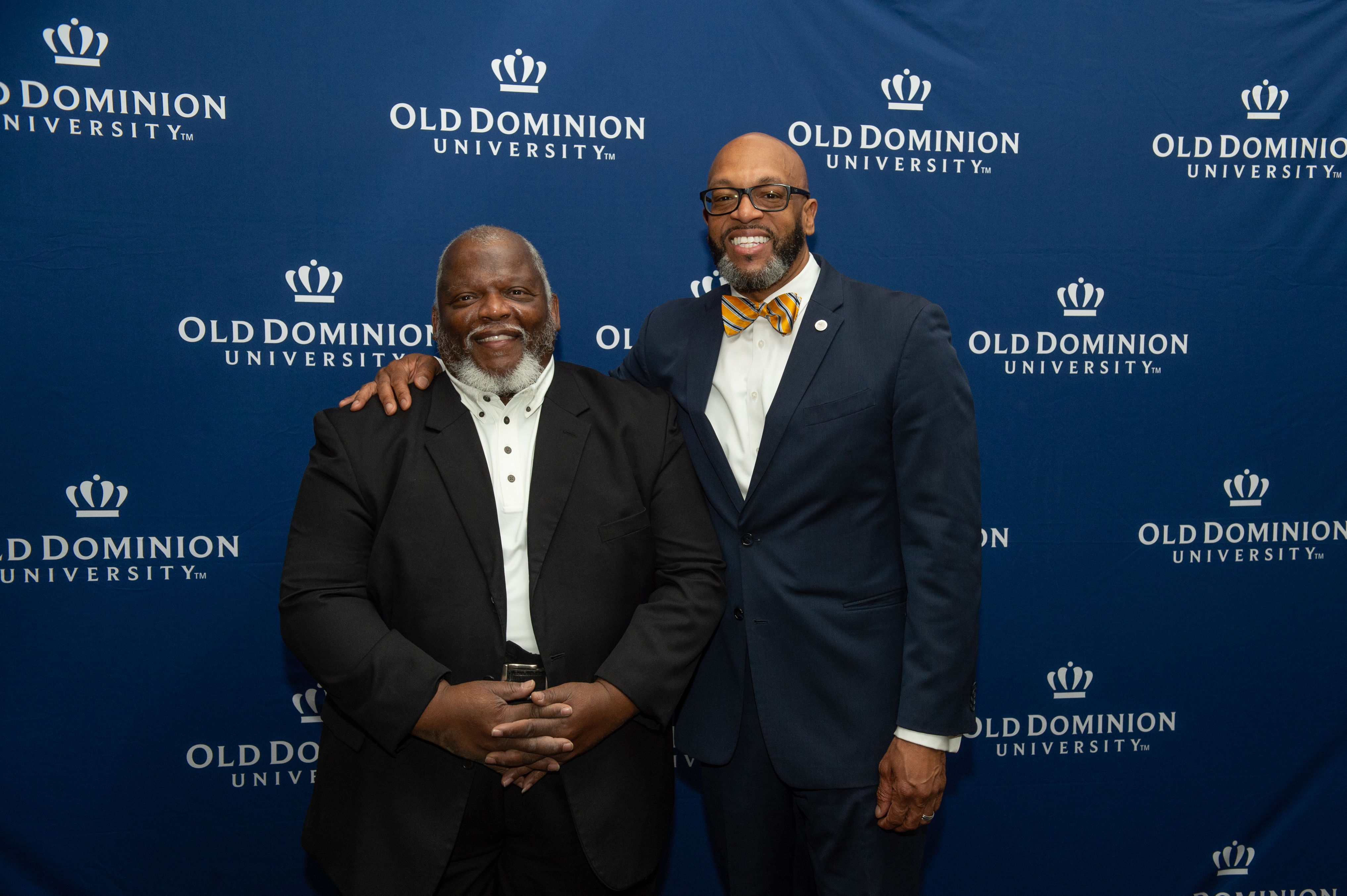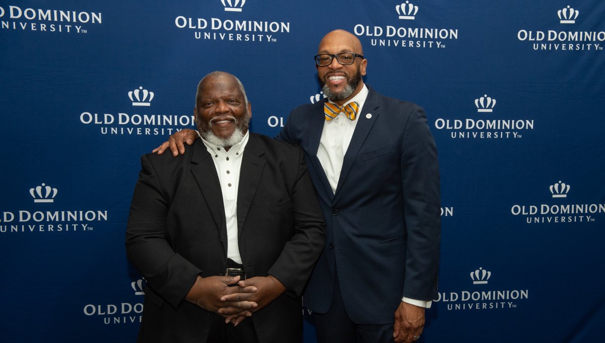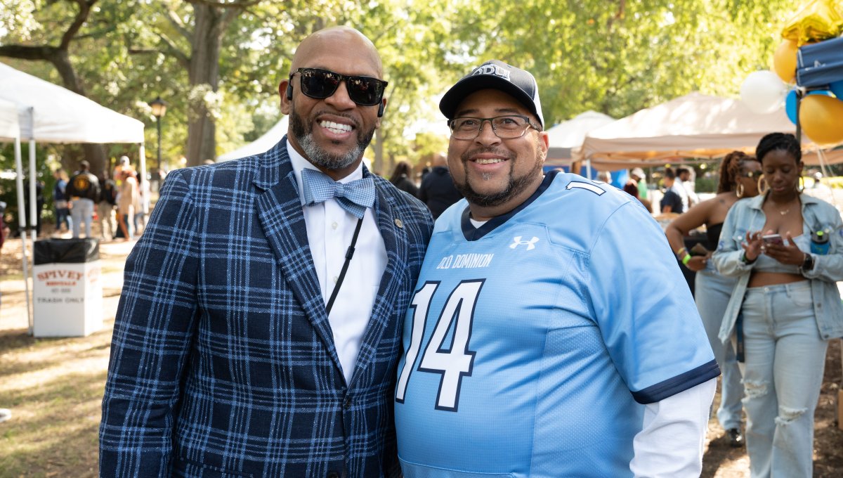 ODU President Brian O. Hemphill, Ph.D., poses for a photo with Woodrow Simms, a 1990 graduate. Photo Chuck Thomas/ODU