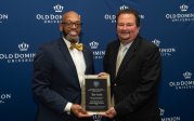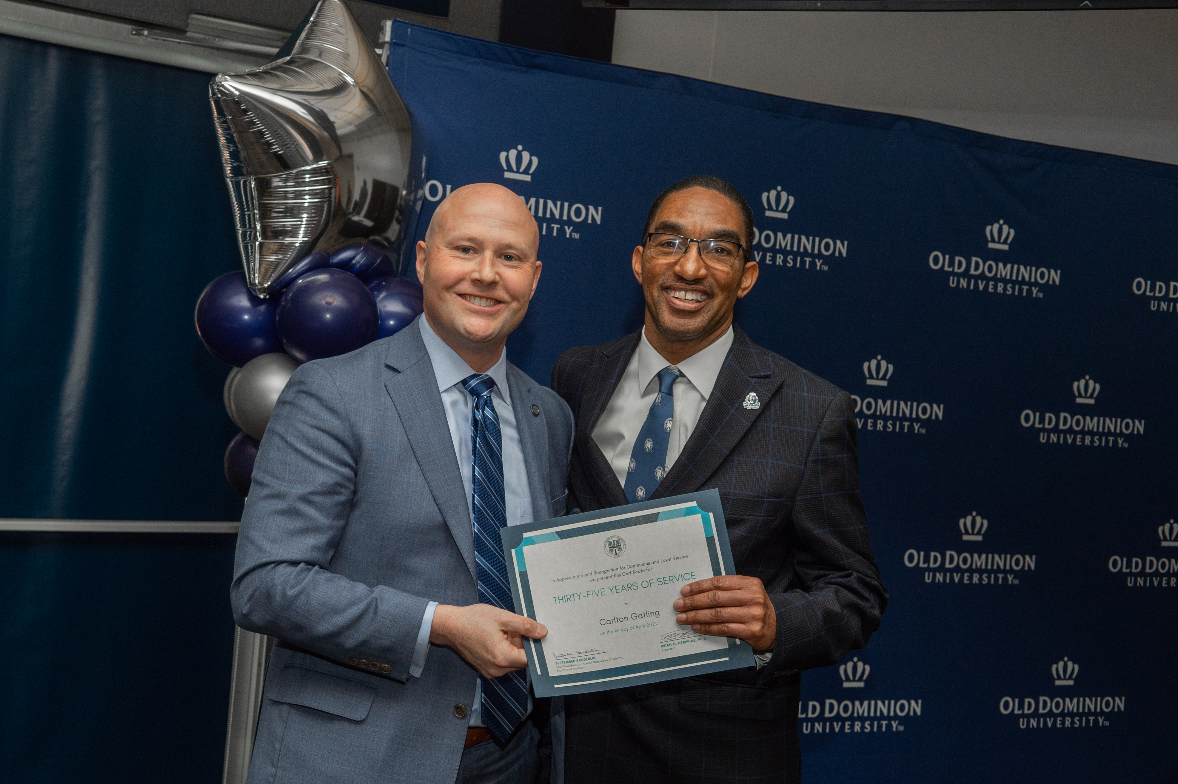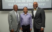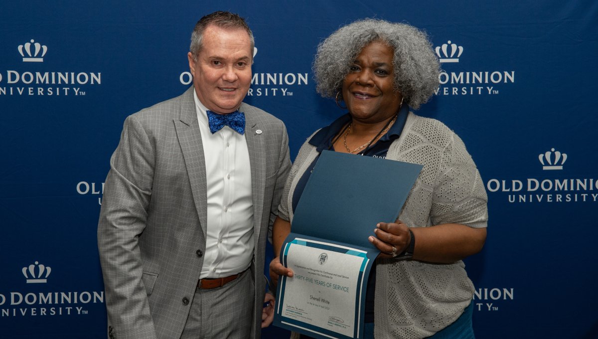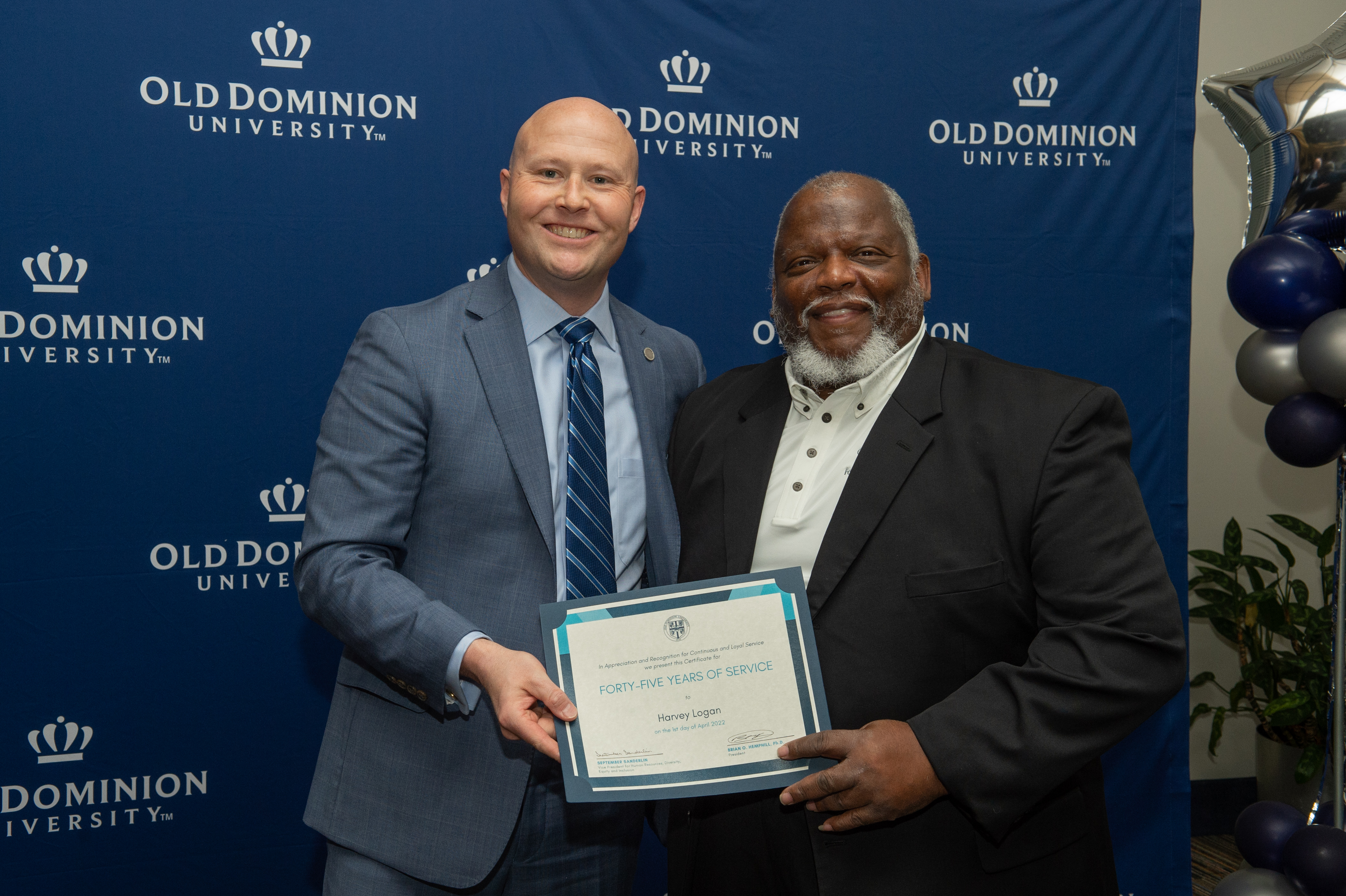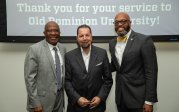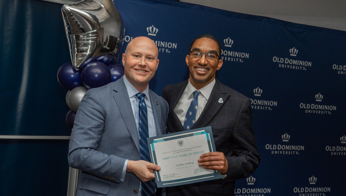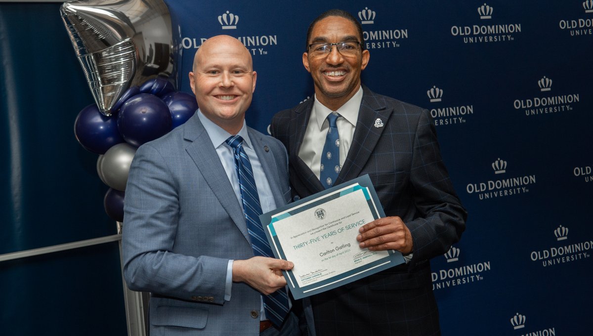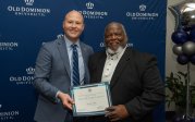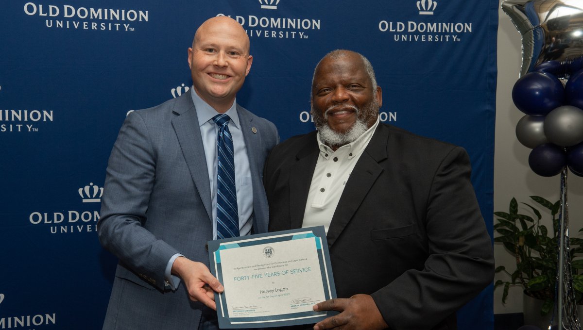 ODU President Brian O. Hemphill, Ph.D., poses for a photo with Woodrow Simms, a 1990 graduate. Photo Chuck Thomas/ODU