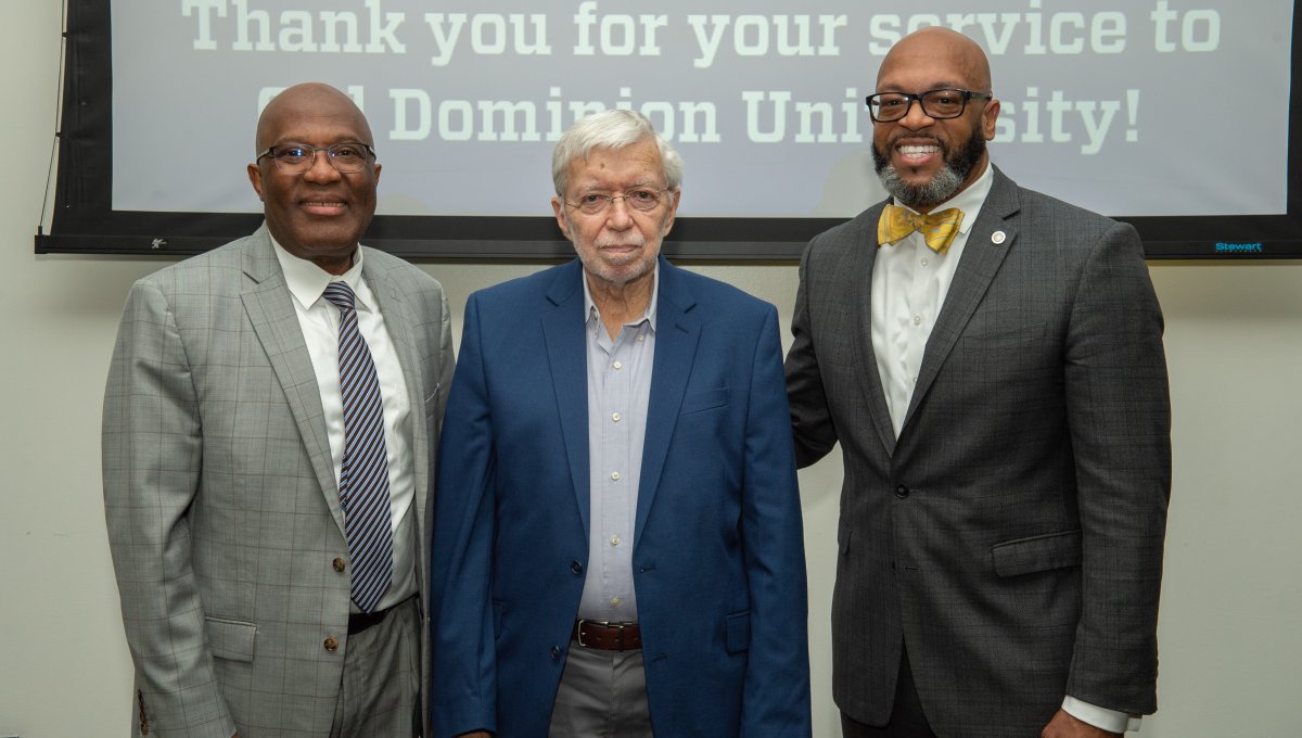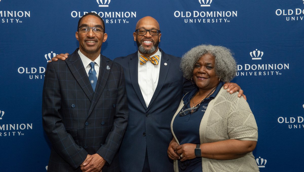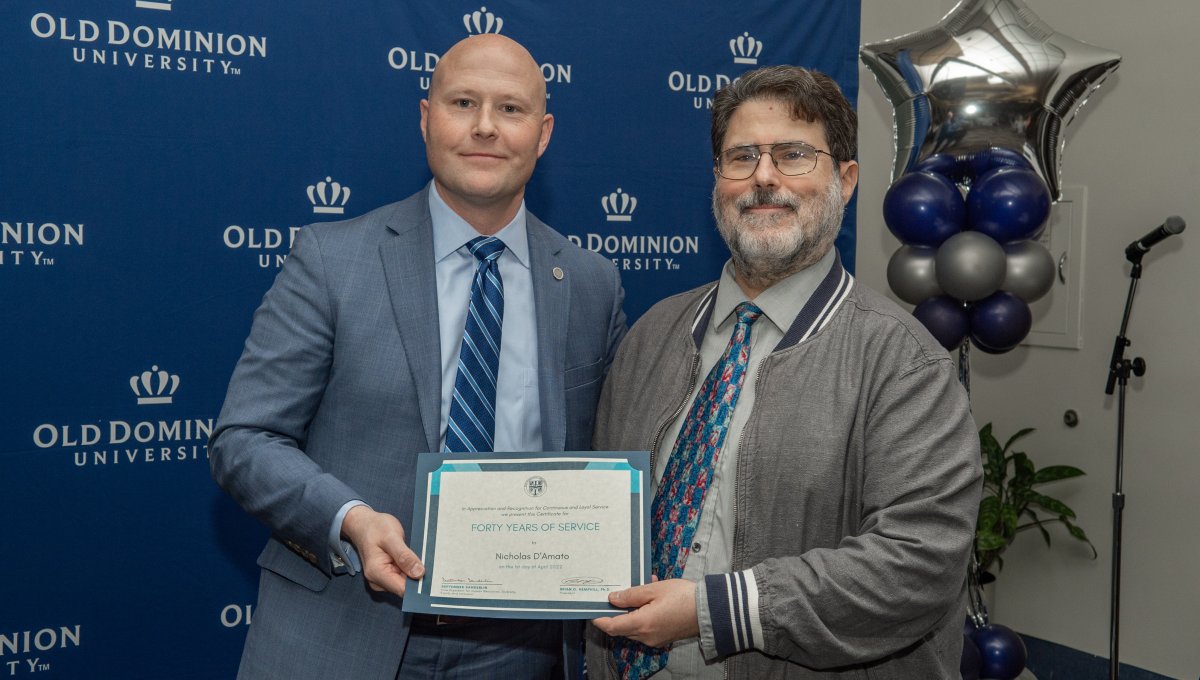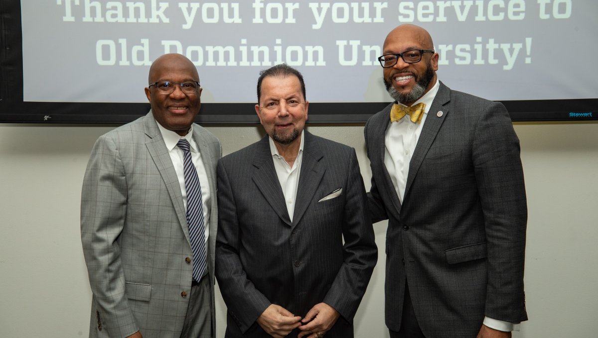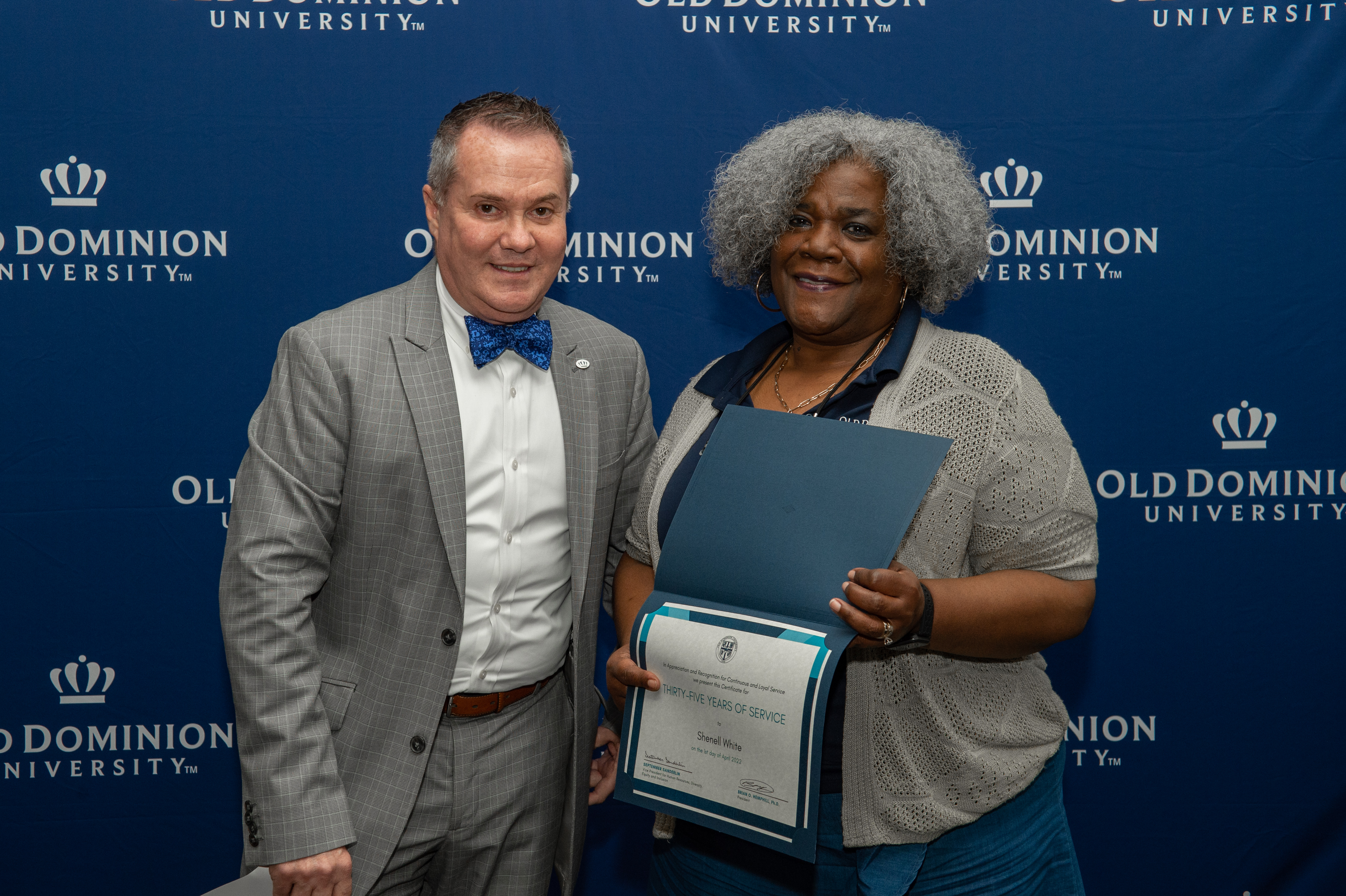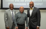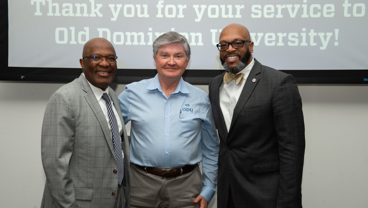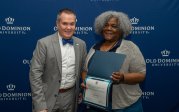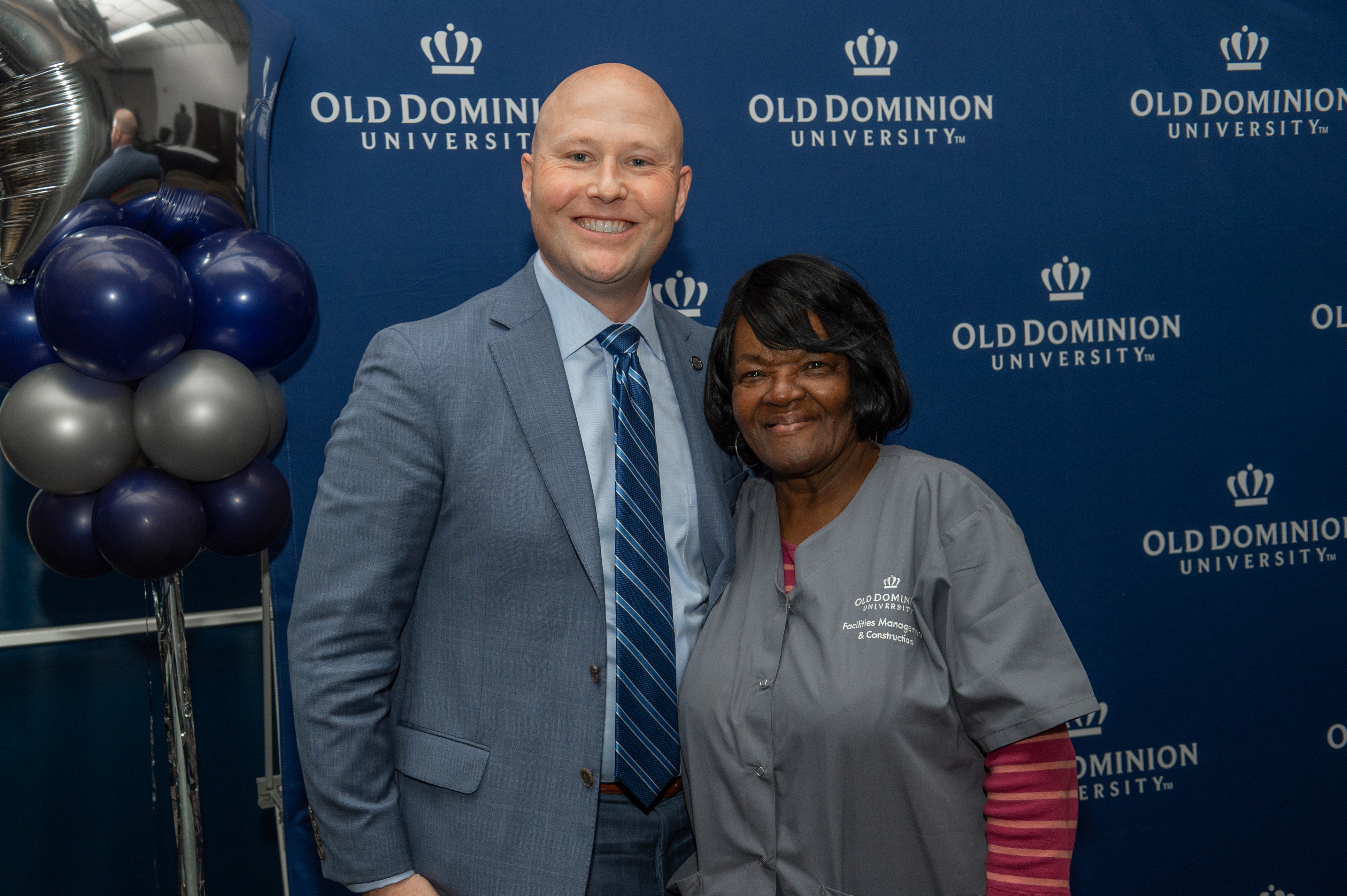 ODU President Brian O. Hemphill, Ph.D., poses for a photo with Woodrow Simms, a 1990 graduate. Photo Chuck Thomas/ODU