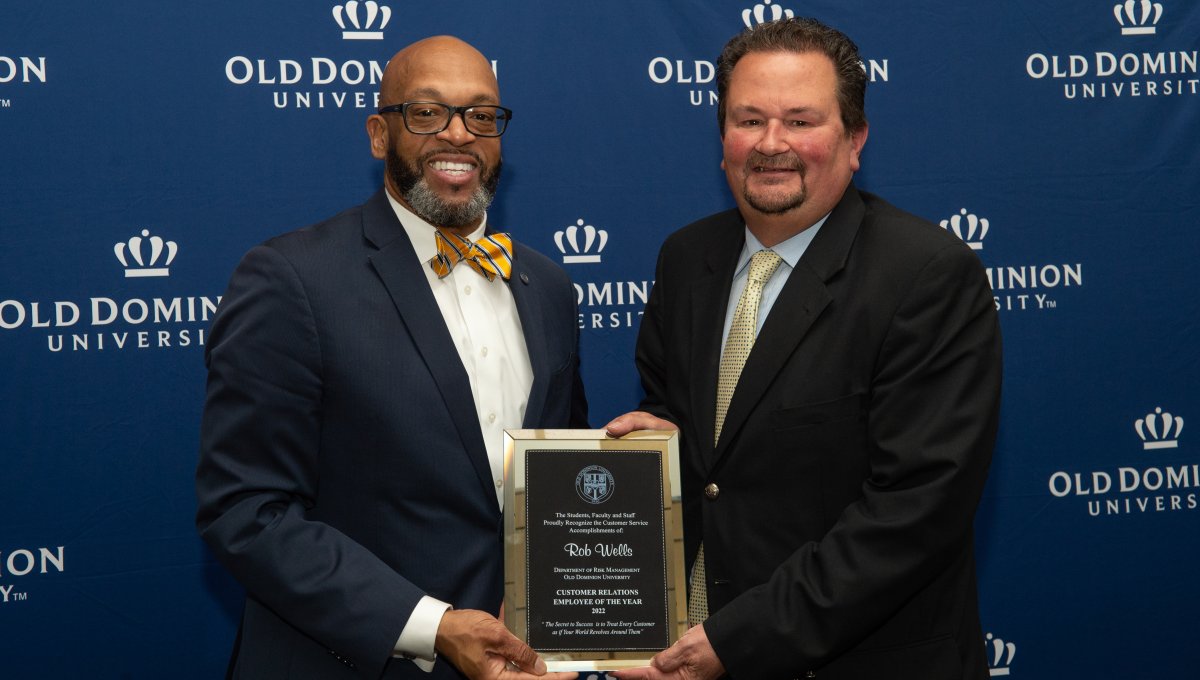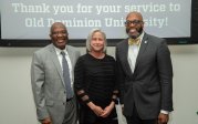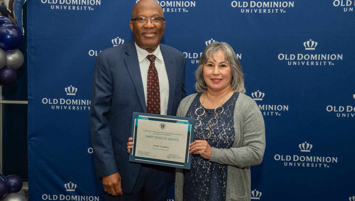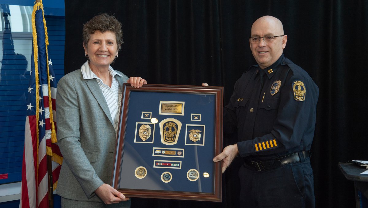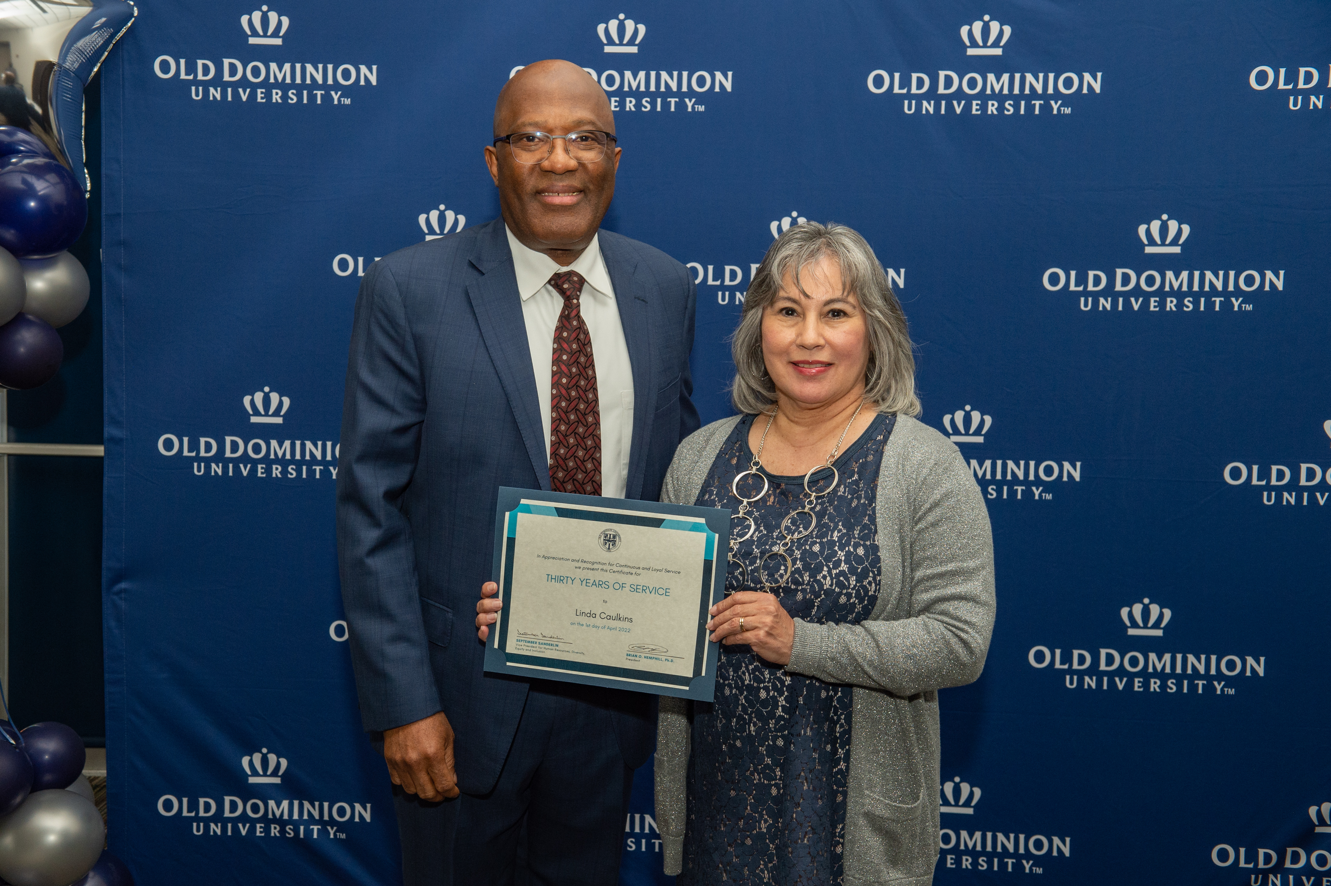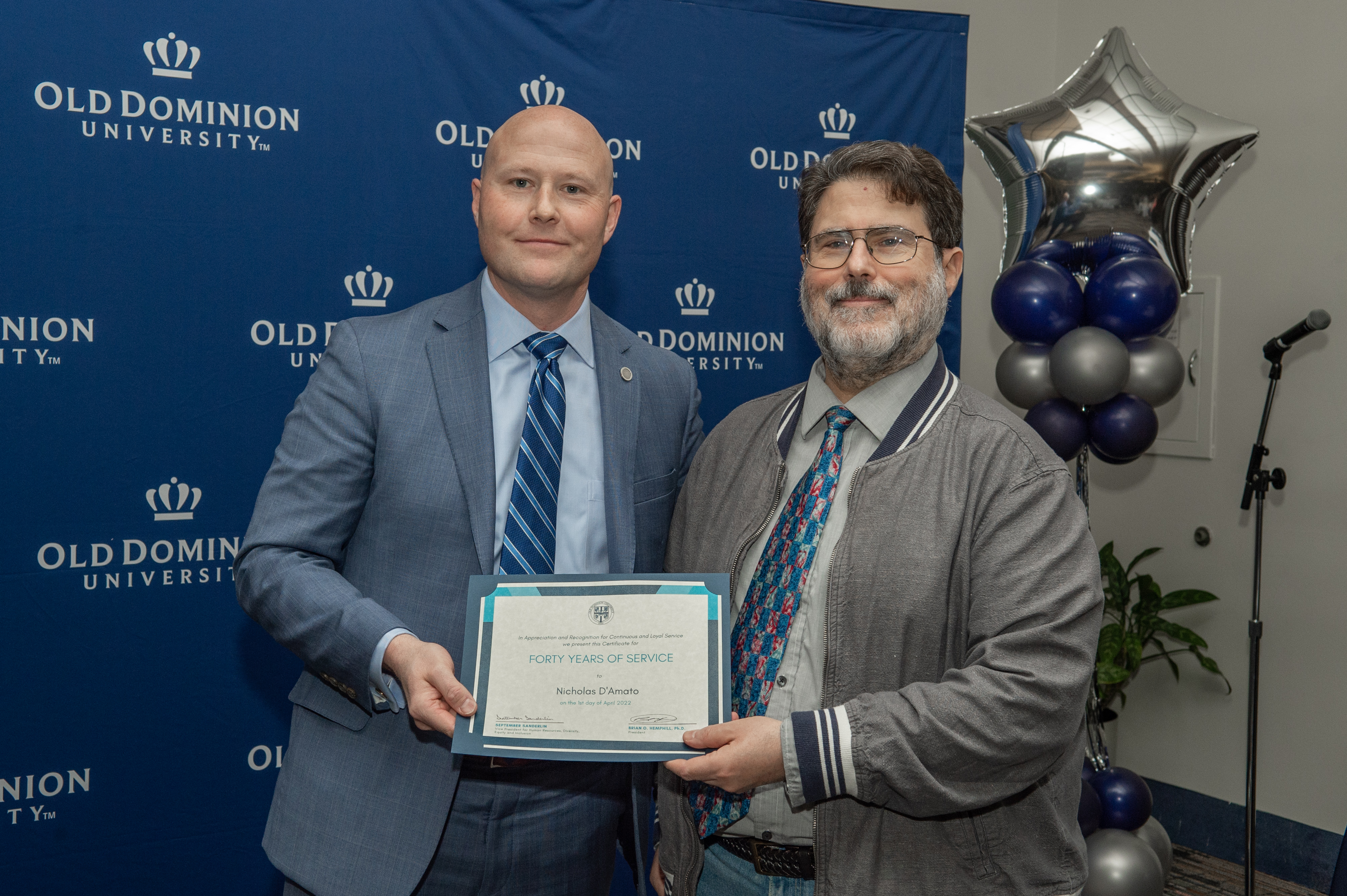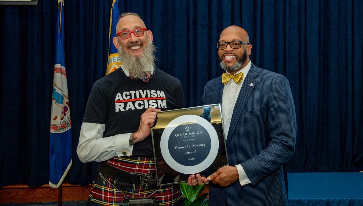 ODU President Brian O. Hemphill, Ph.D., poses for a photo with Woodrow Simms, a 1990 graduate. Photo Chuck Thomas/ODU