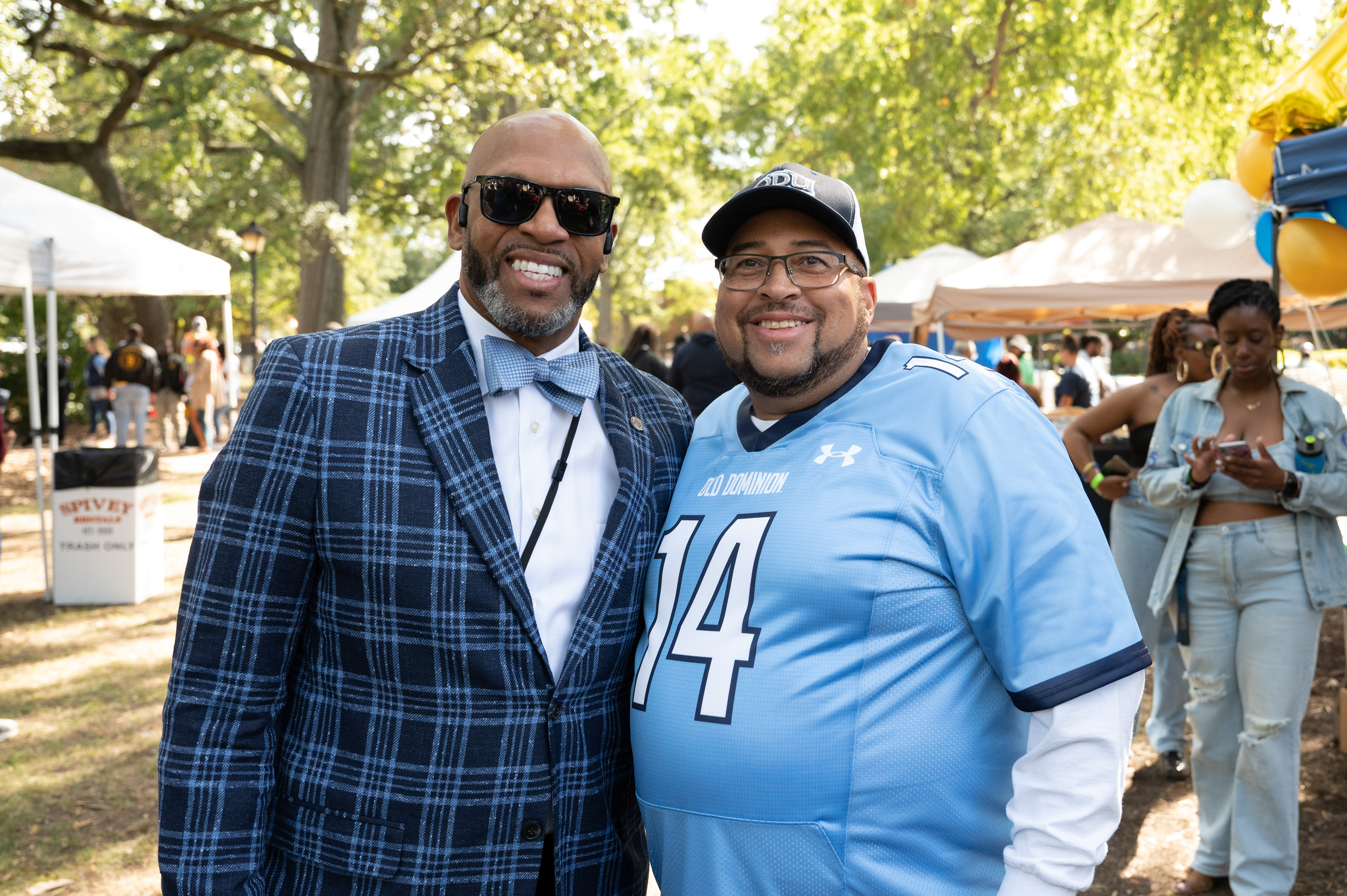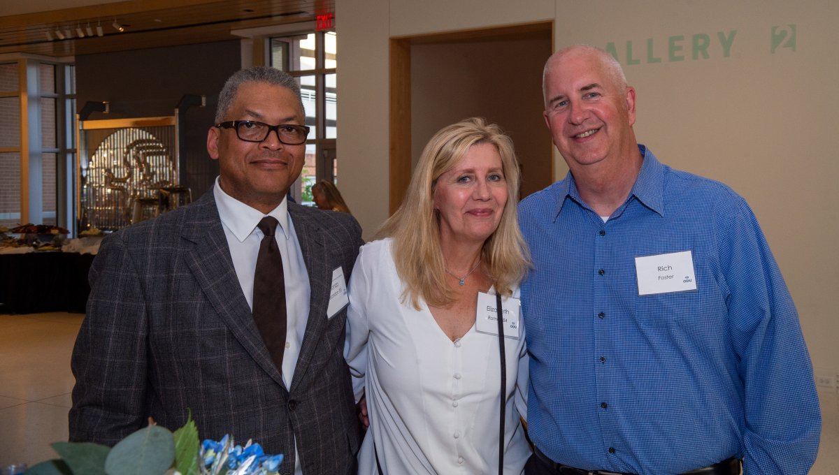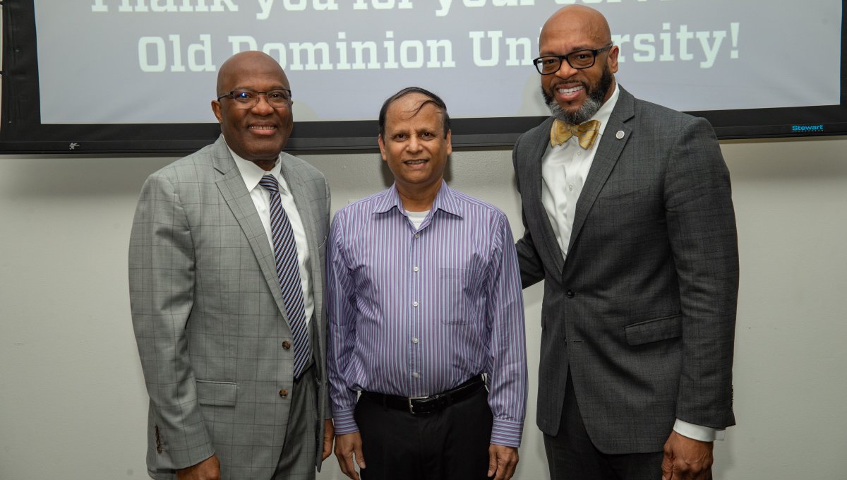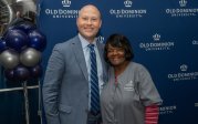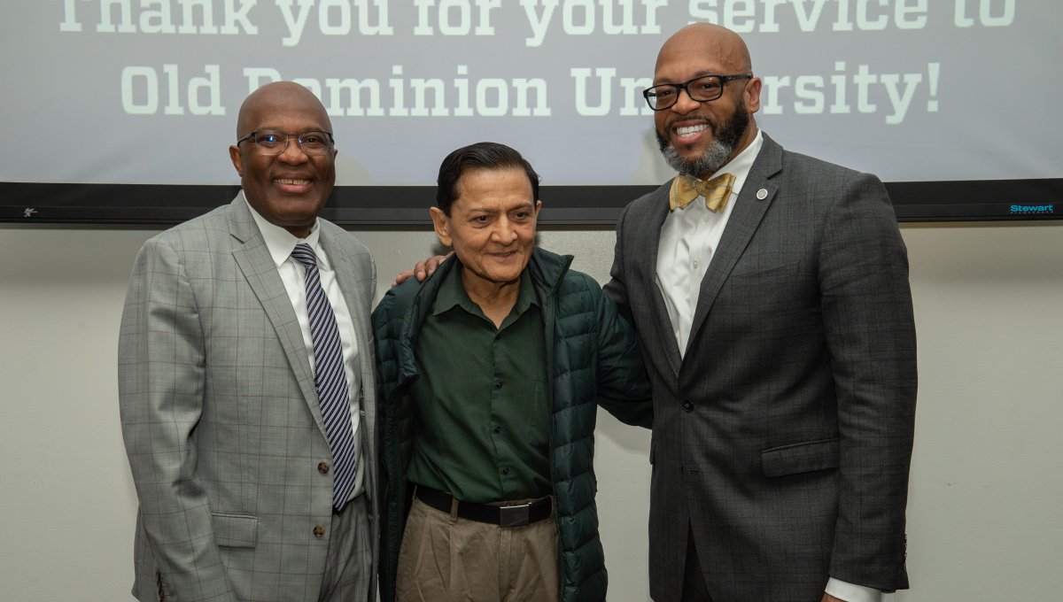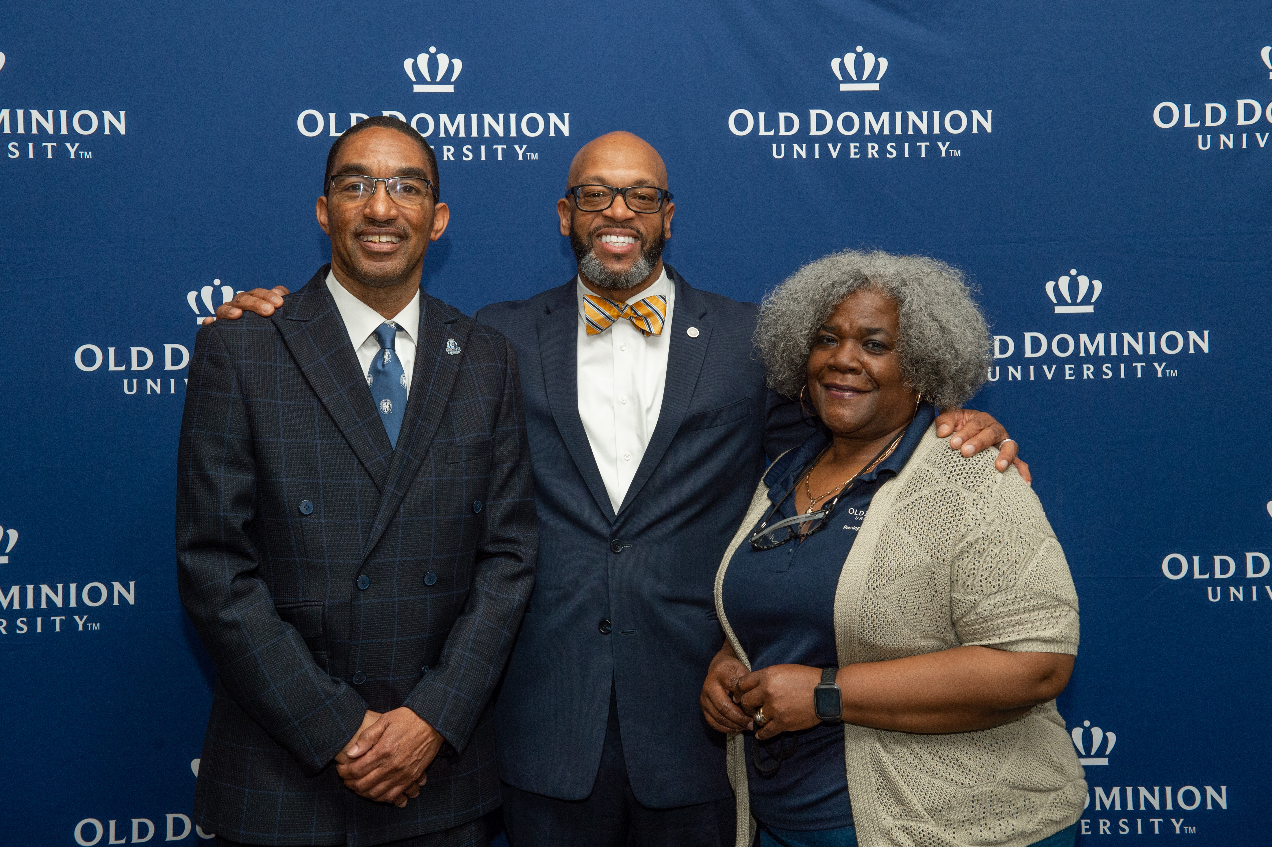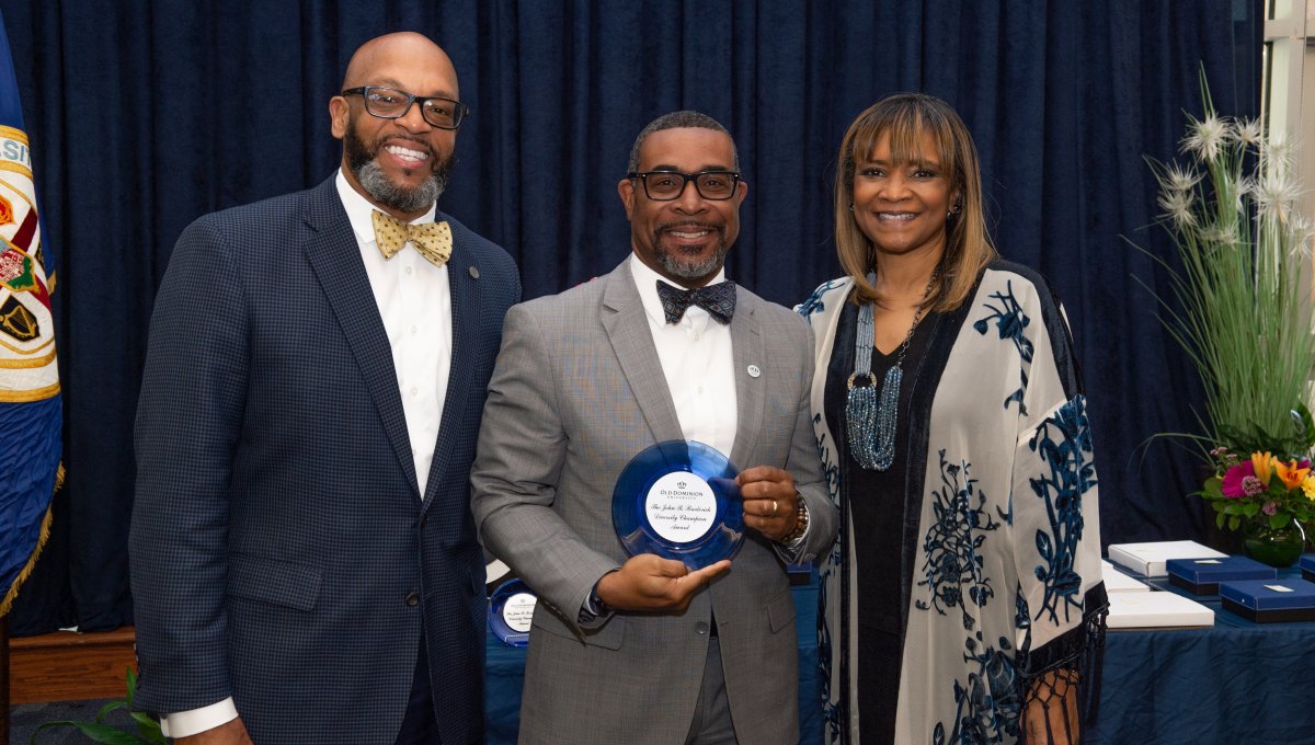 ODU President Brian O. Hemphill, Ph.D., poses for a photo with Woodrow Simms, a 1990 graduate. Photo Chuck Thomas/ODU