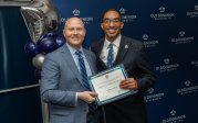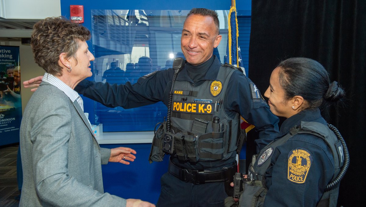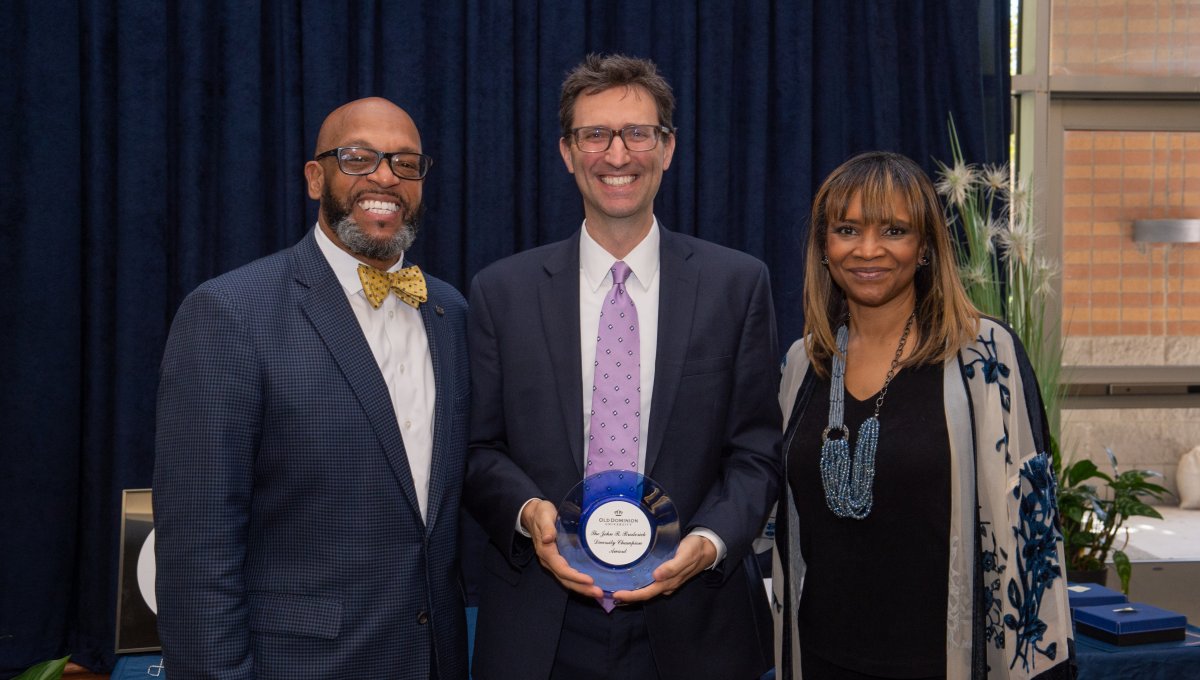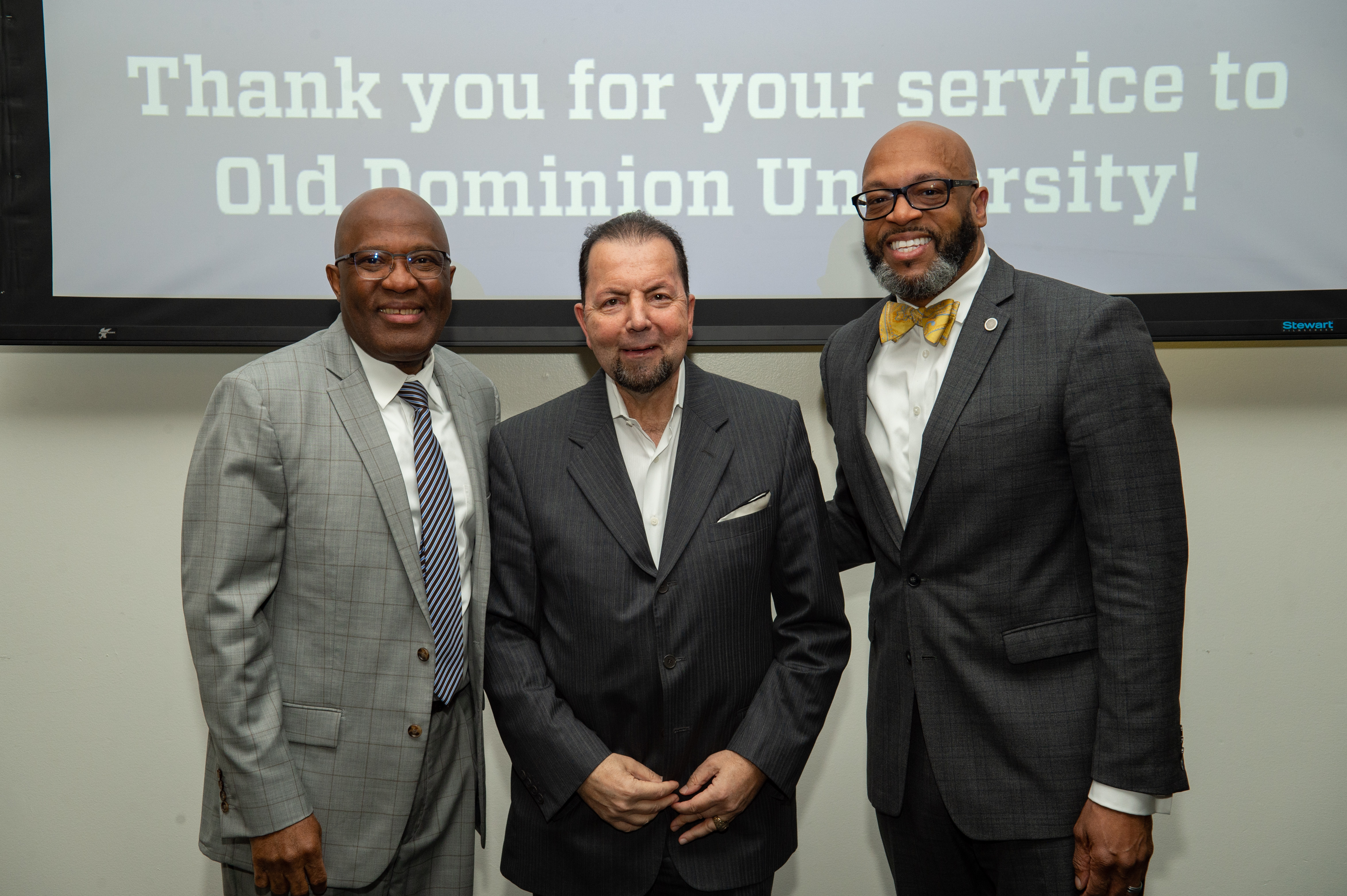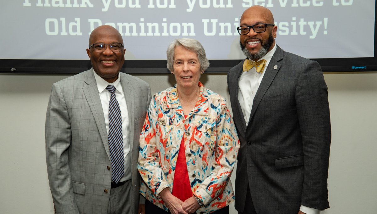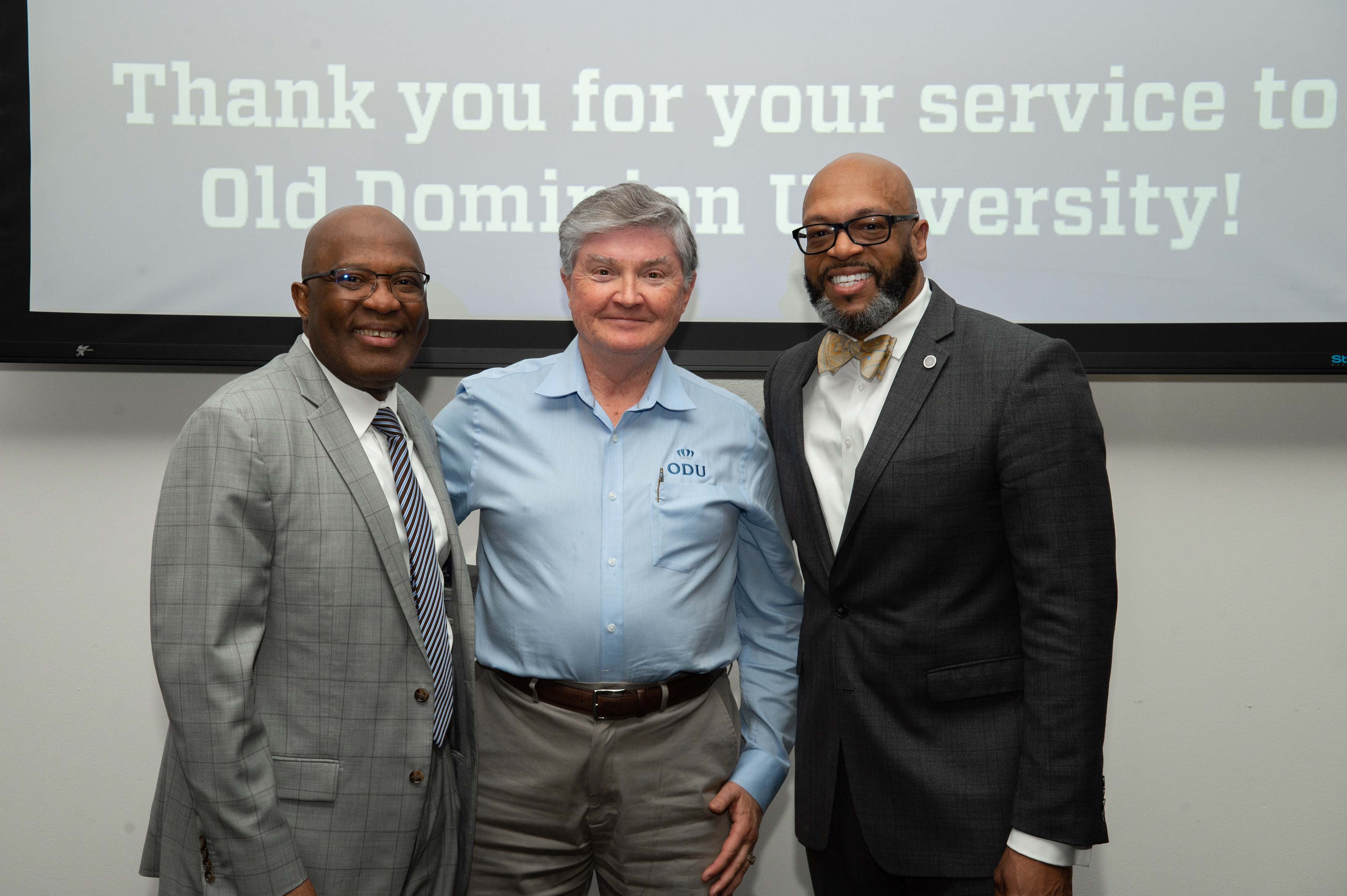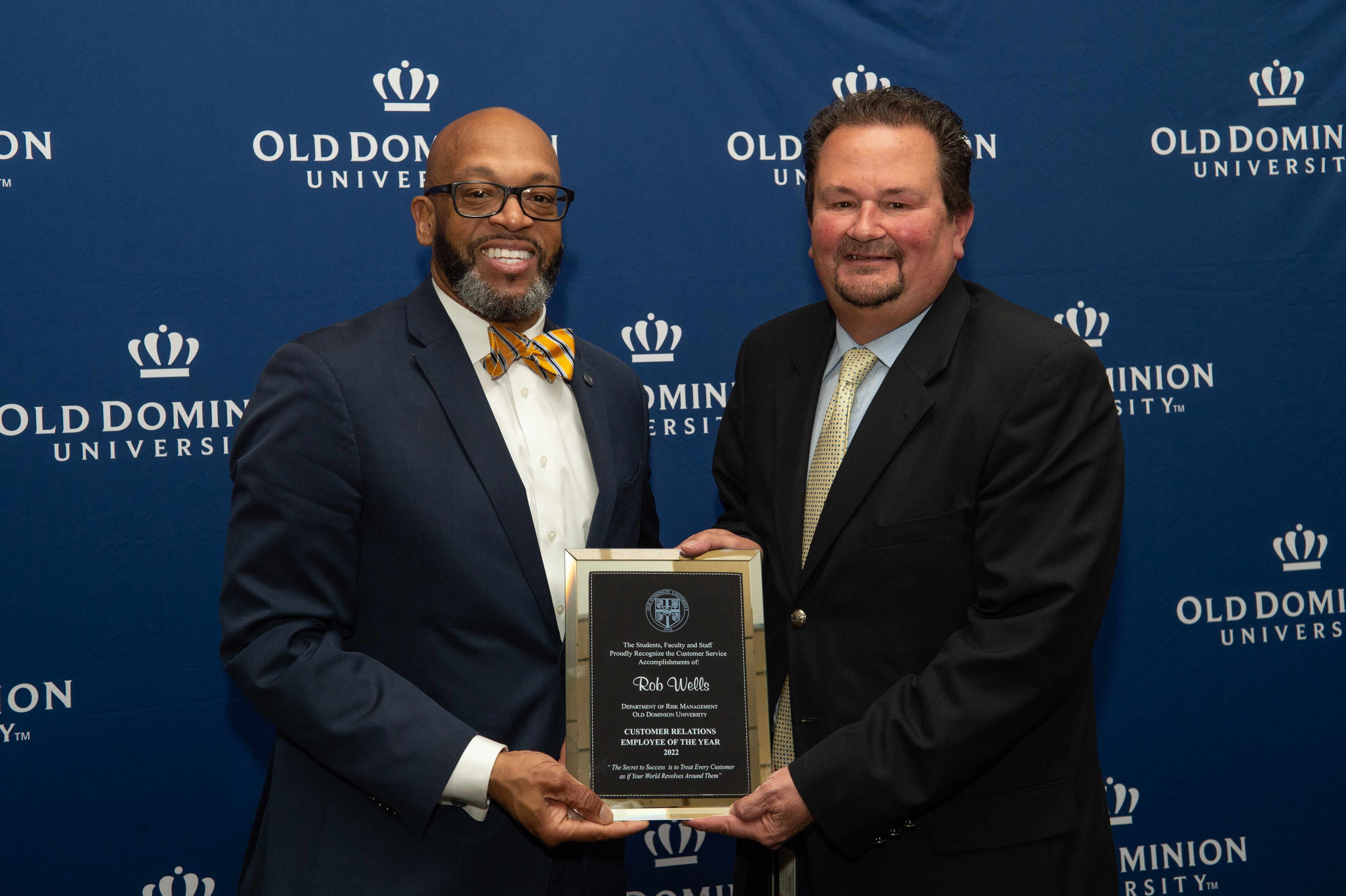 ODU President Brian O. Hemphill, Ph.D., poses for a photo with Woodrow Simms, a 1990 graduate. Photo Chuck Thomas/ODU