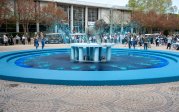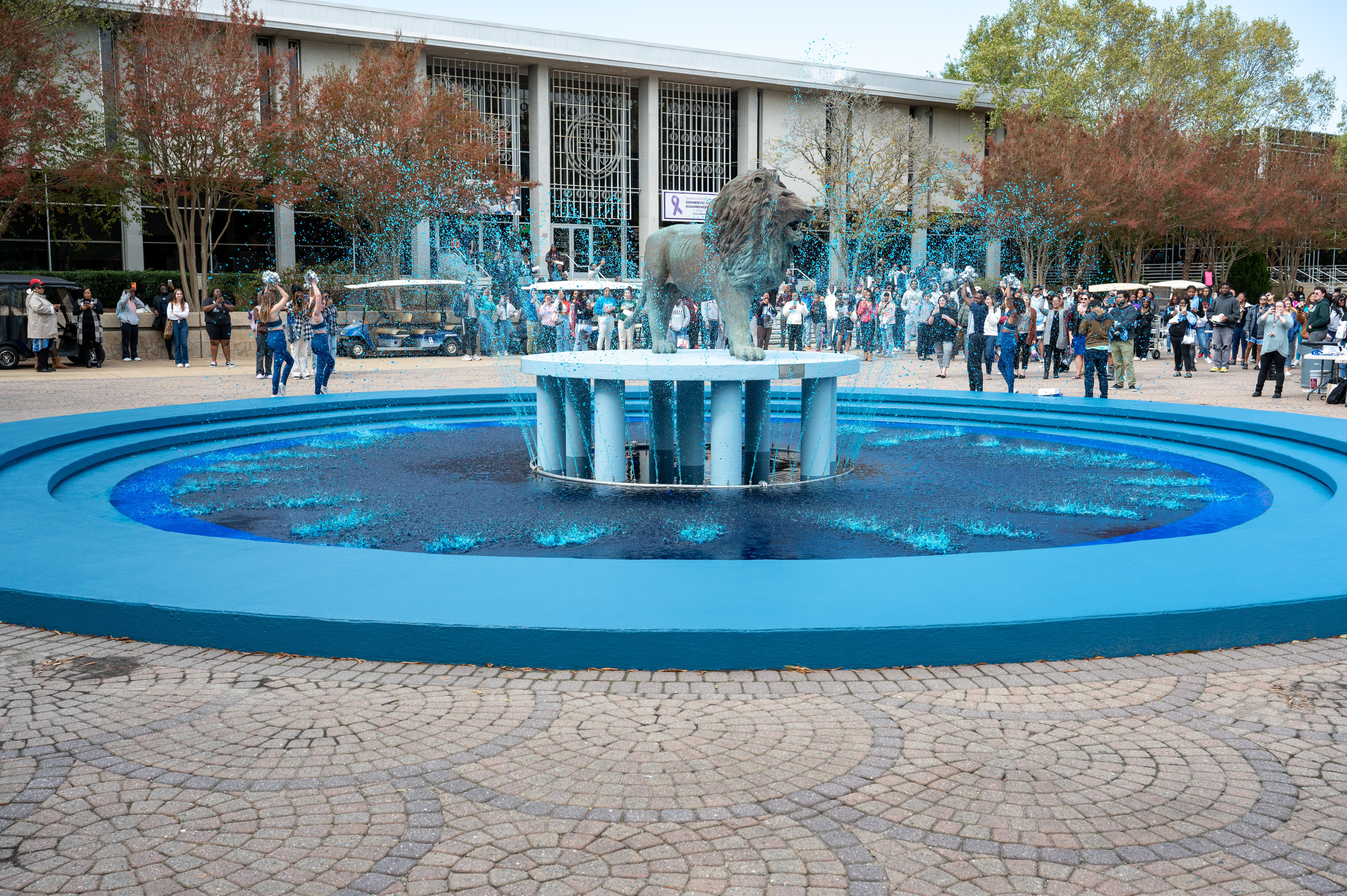 A Homecoming tradition is dying the water the Monarch fountain blue. Photo Chuck Thomas/ODU