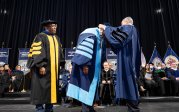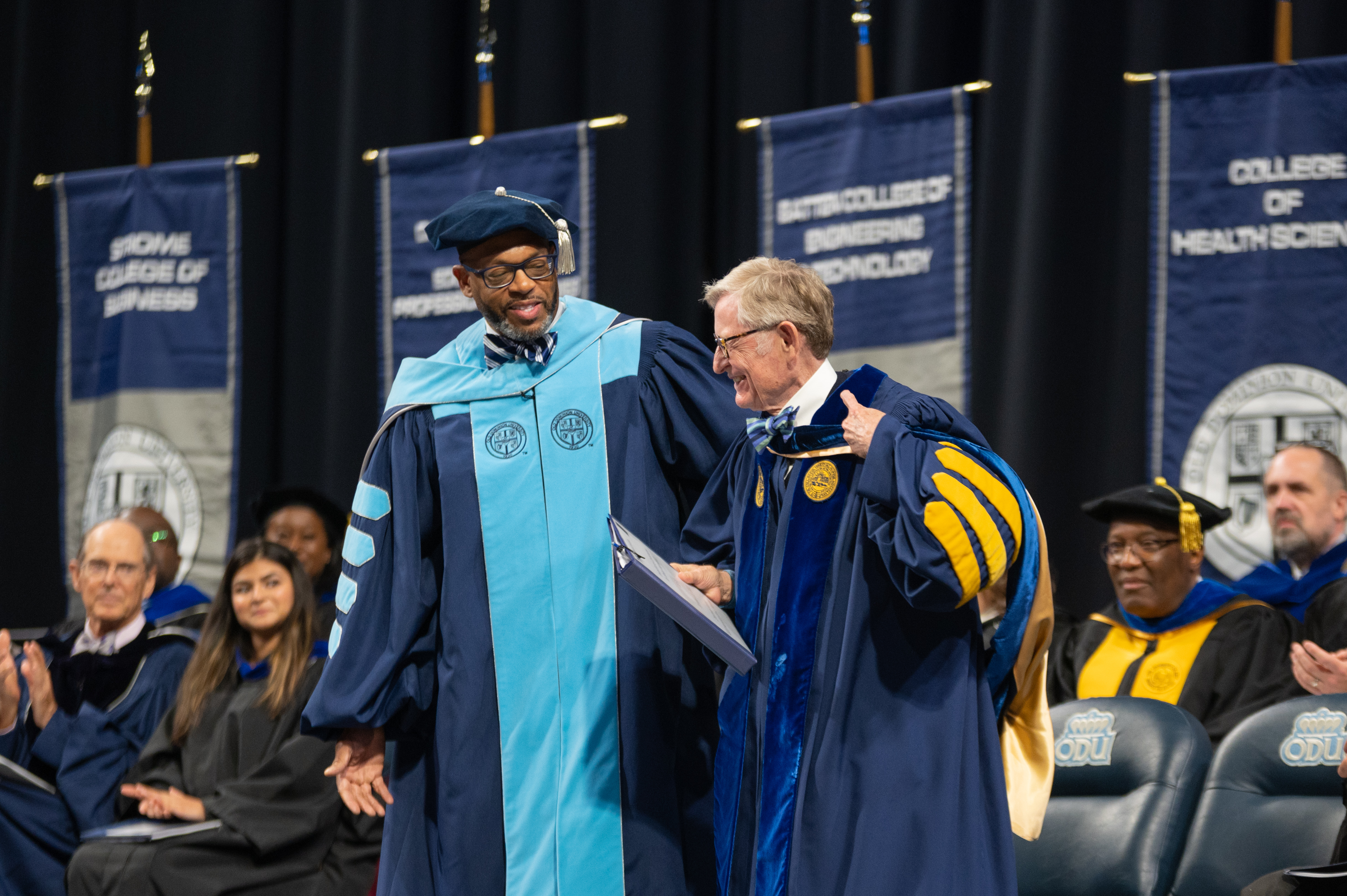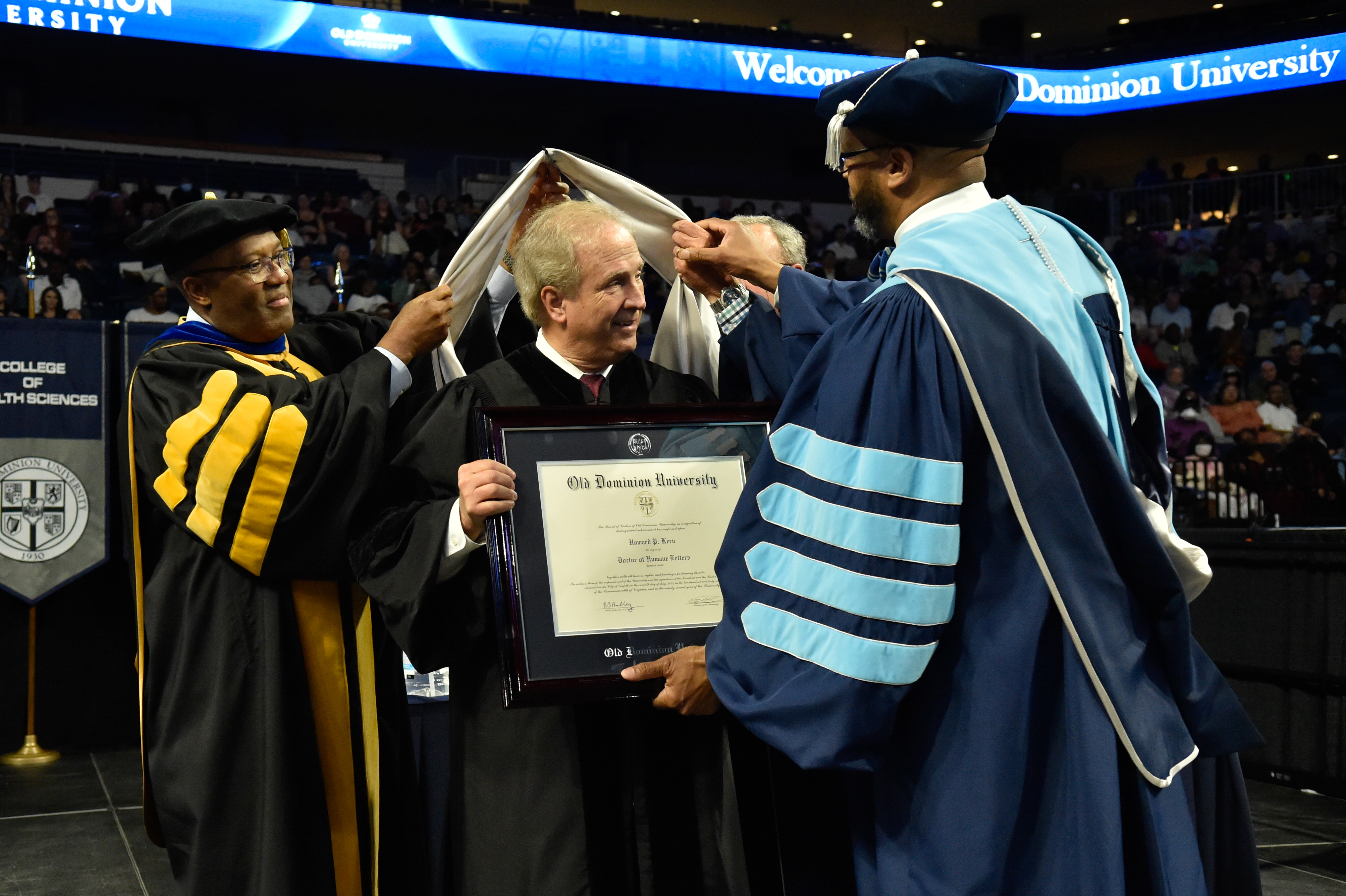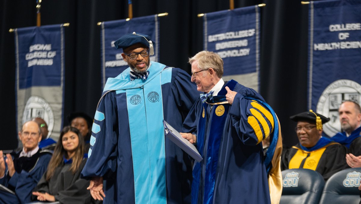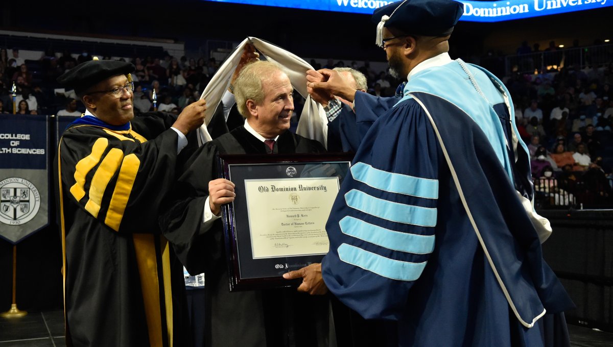 Howard P. Kern, president and chief executive officer of Sentara Healthcare, receives a Doctor of Humane Letters (honoris causa) degree from President Brian O. Hemphill, Ph.D. Photo Chuck Thomas/ODU