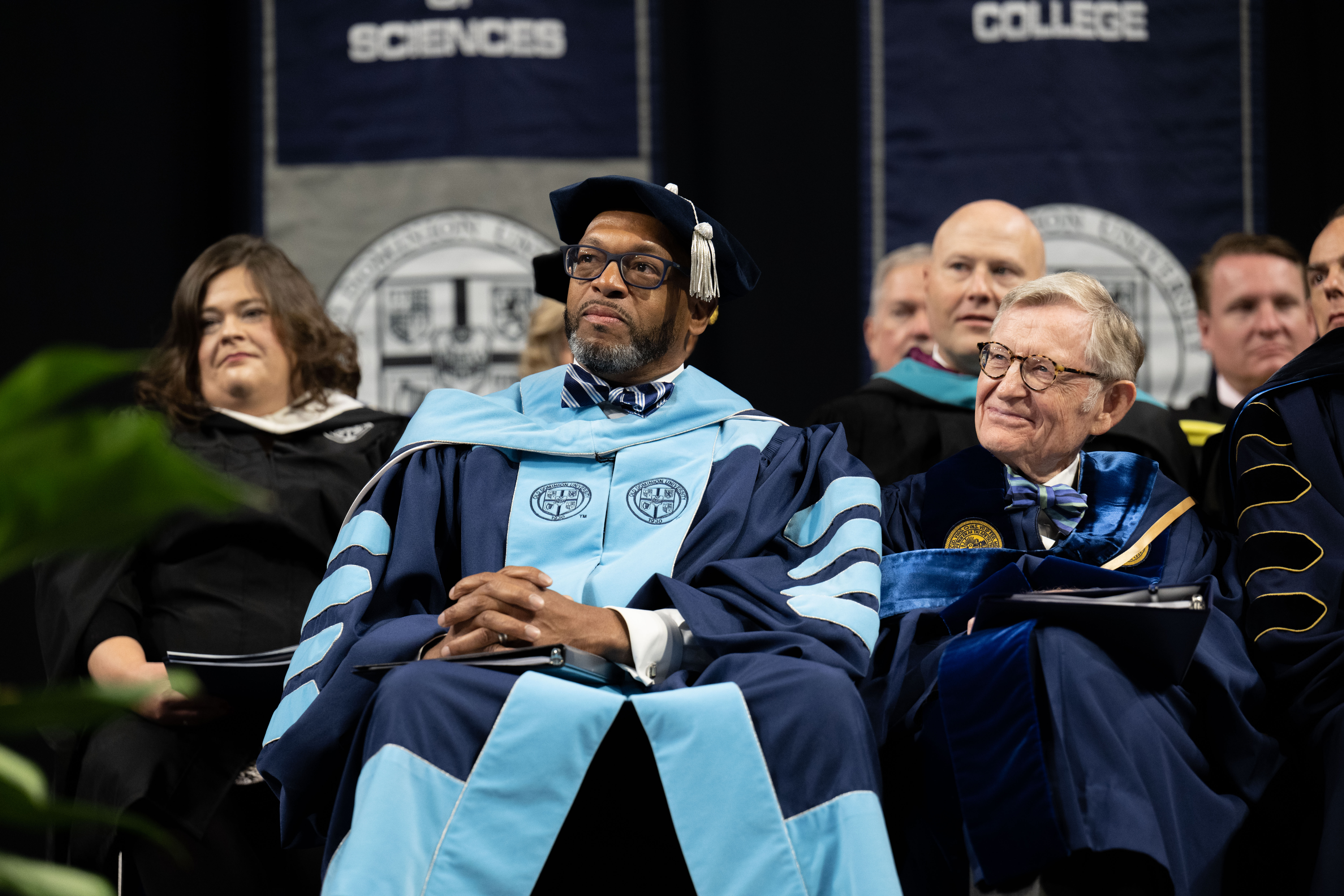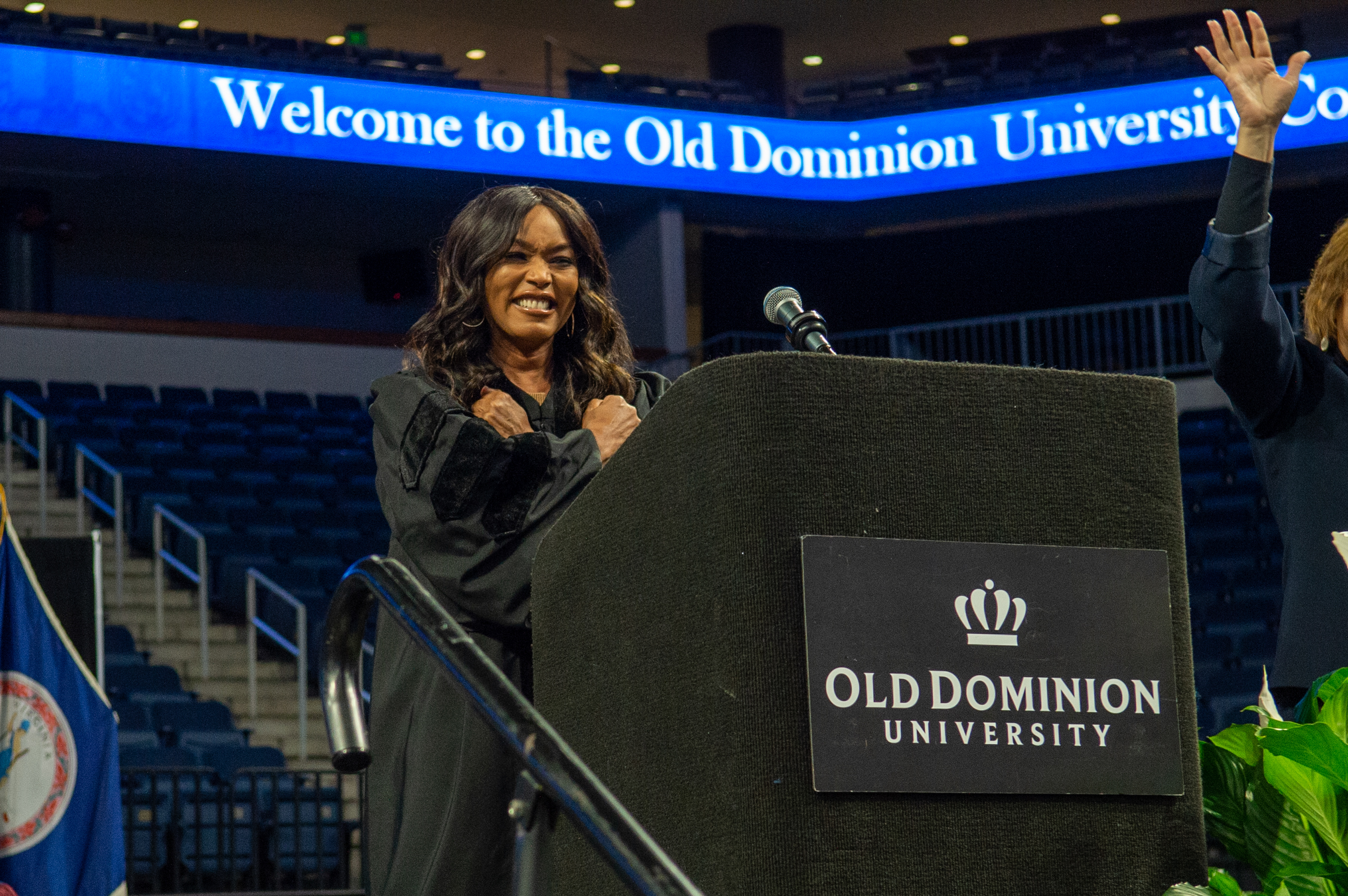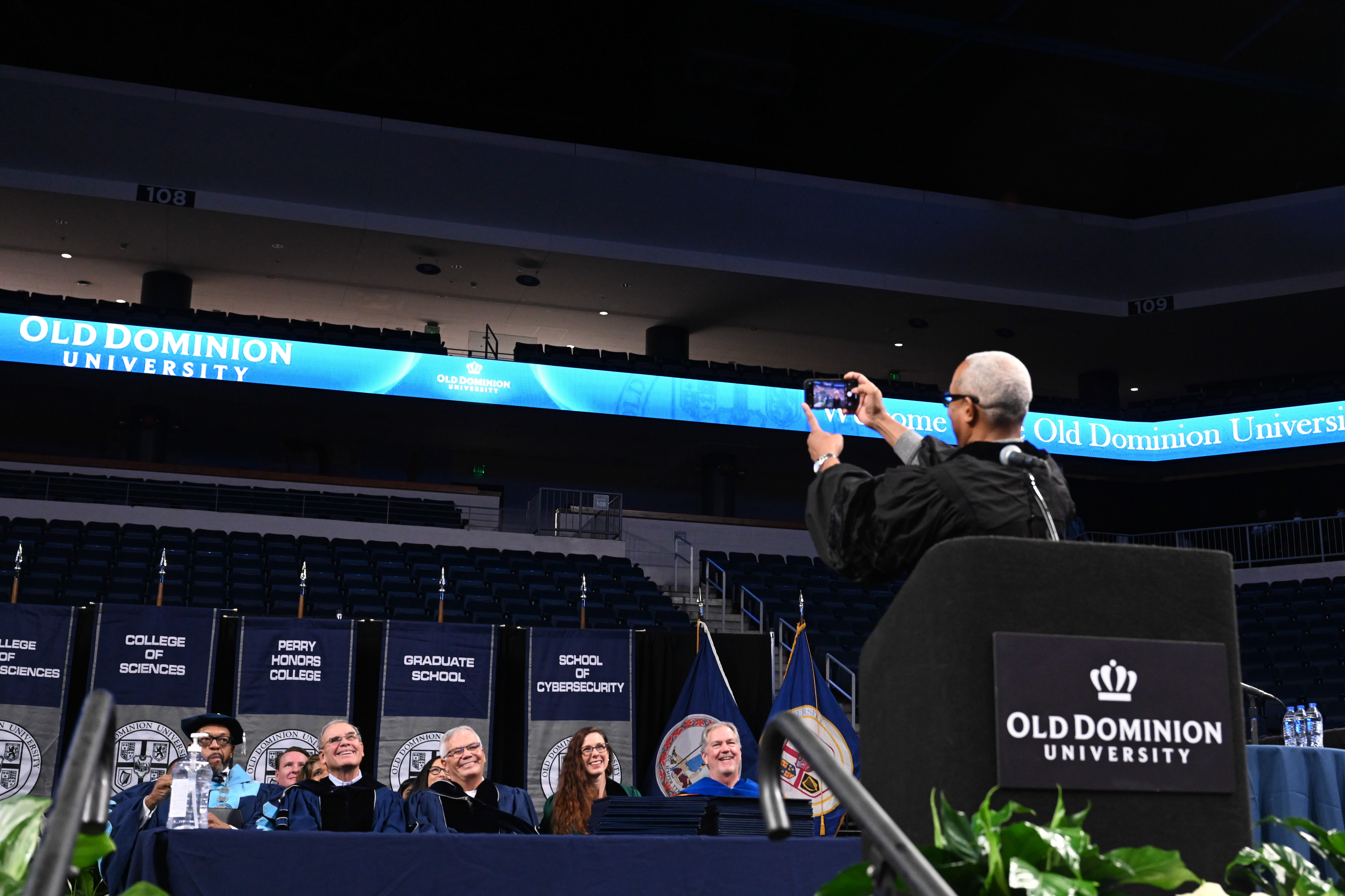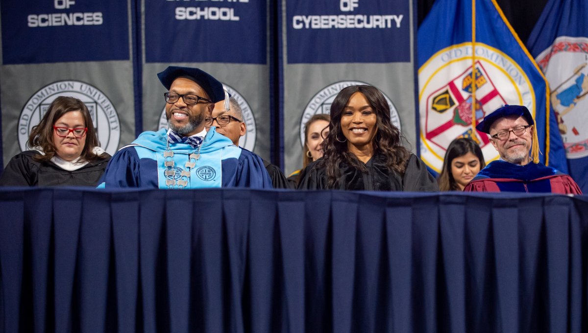 President Brian O. Hemphill, Ph.D., and Award-winning actress Angela Bassett watches the graduates enter Chartway Arena during Old Dominion University's commencement exercises on May 6. Photo Chuck Thomas/ODU