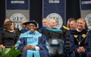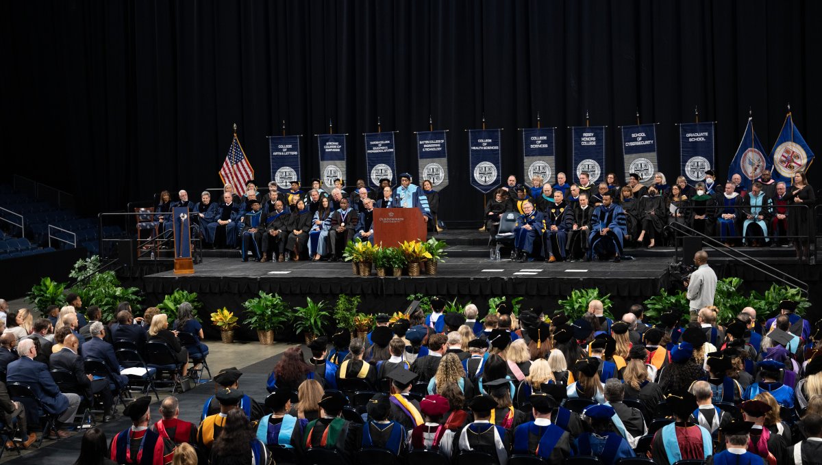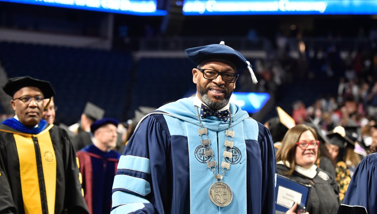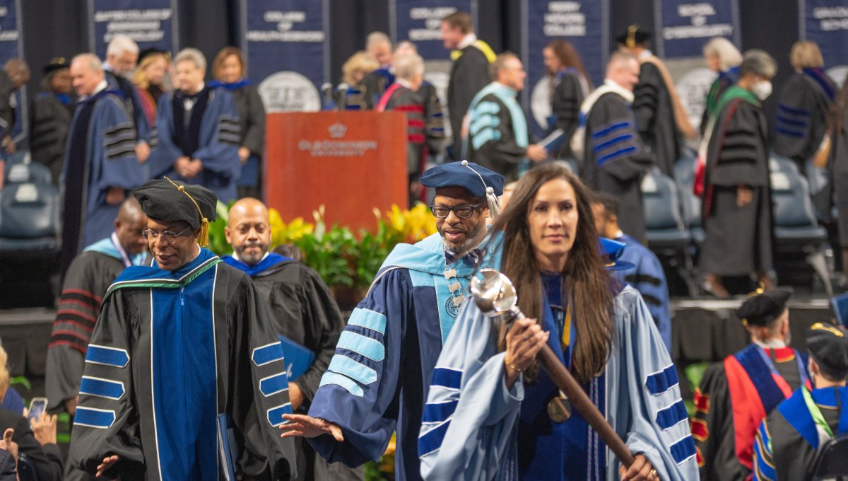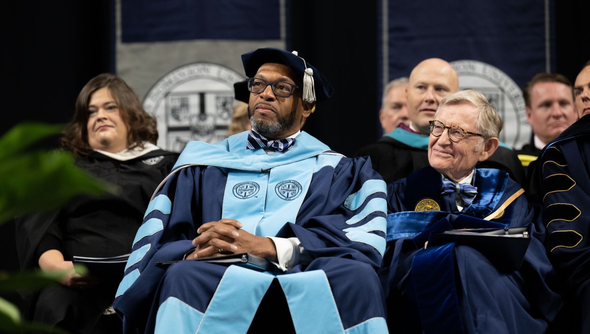 President Brian O. Hemphill, Ph.D., and Award-winning actress Angela Bassett watches the graduates enter Chartway Arena during Old Dominion University's commencement exercises on May 6. Photo Chuck Thomas/ODU