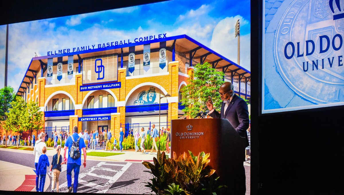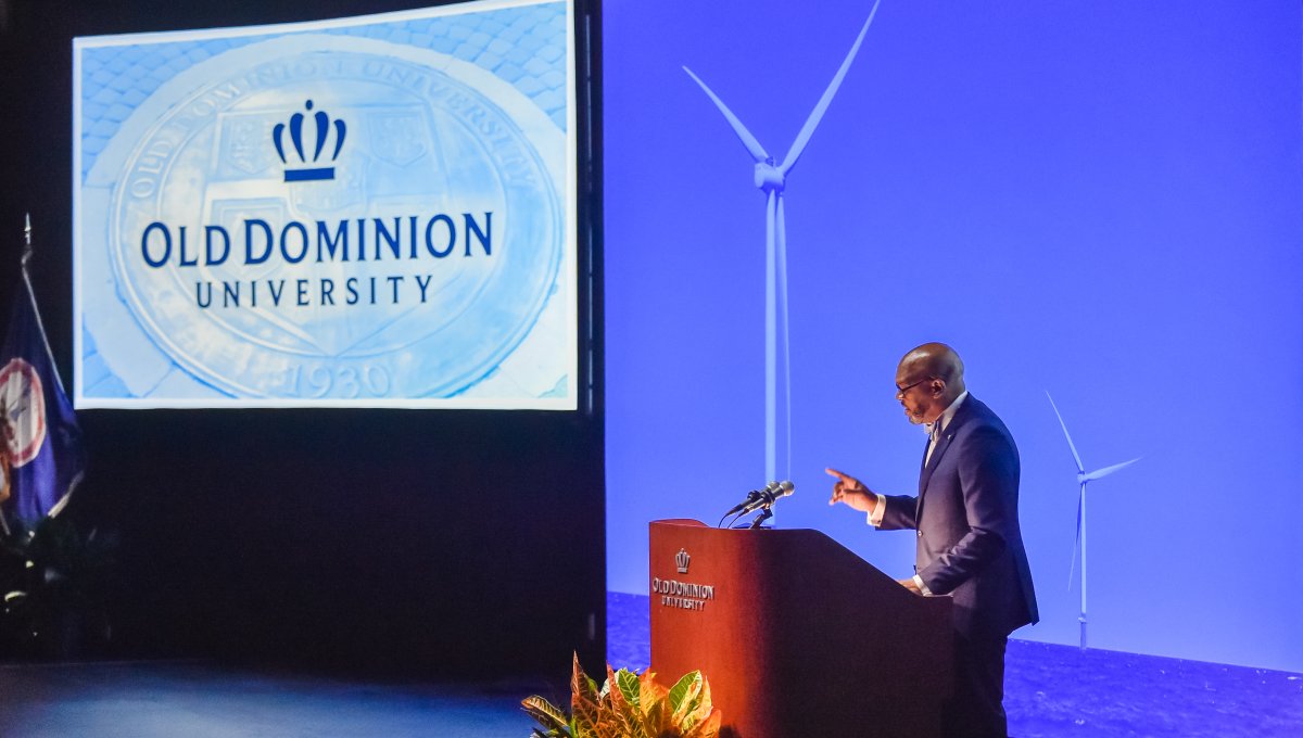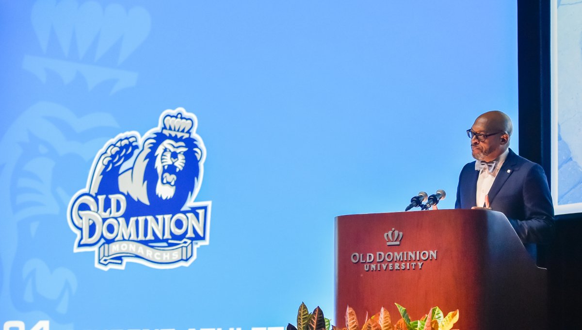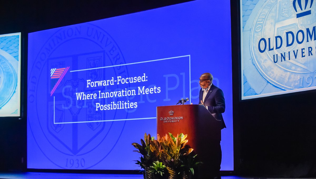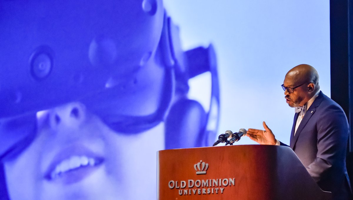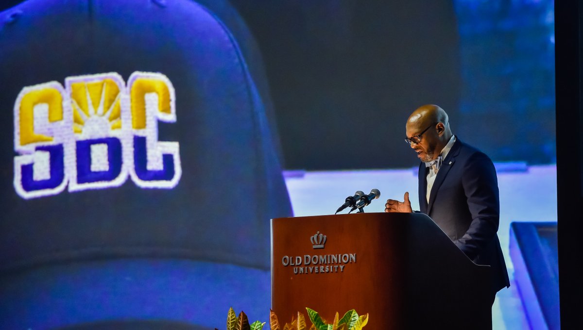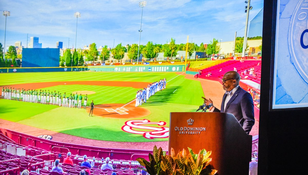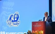 Old Dominion University President Brian O. Hemphill, Ph.D., announced plans for a School of Data Science and an expanded baseball facility during his first State of the University address, which he delivered Friday at Chartway Arena. Photo Chuck Thomas/ODU.