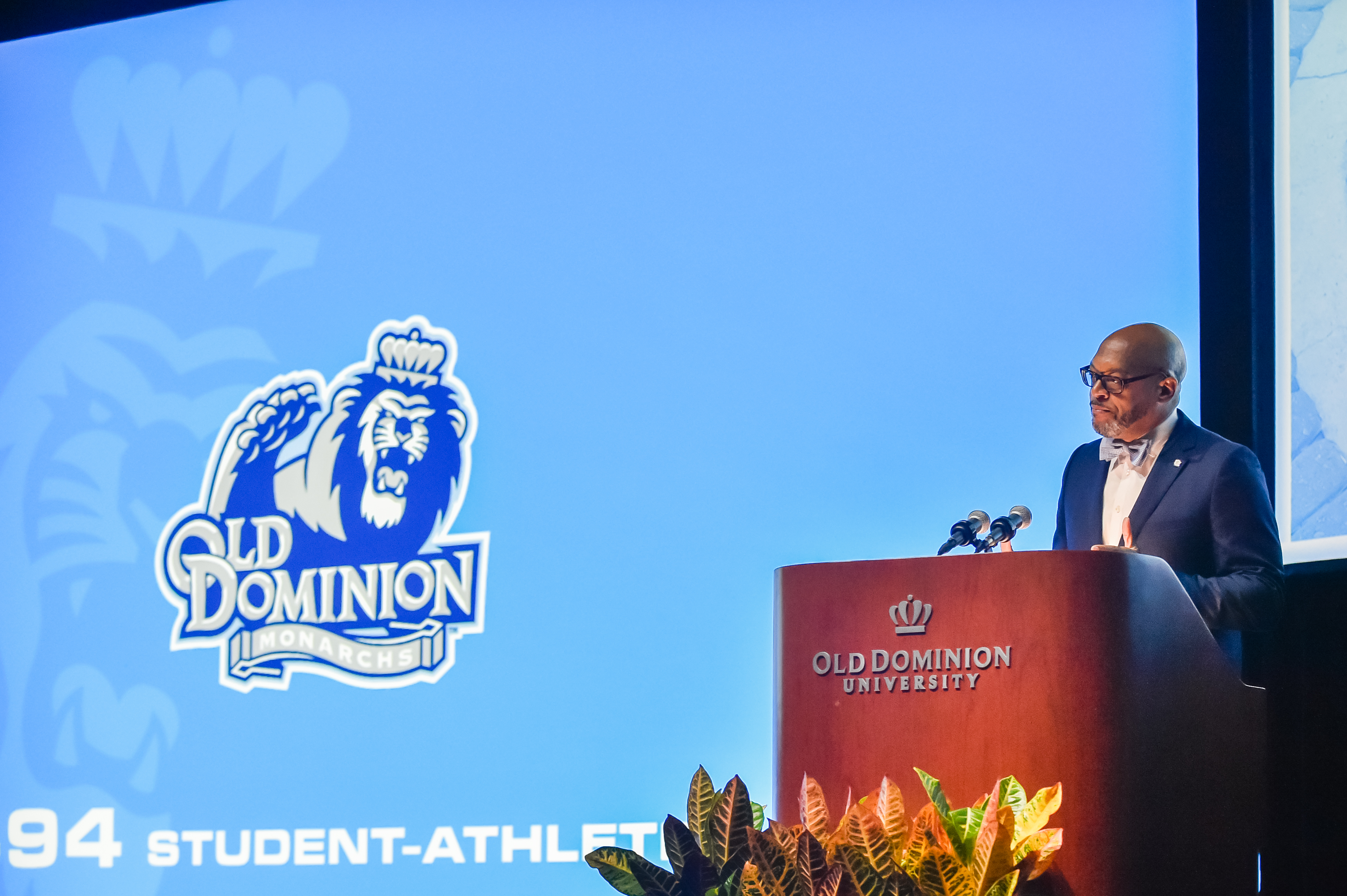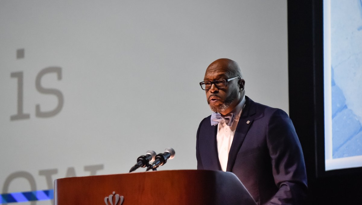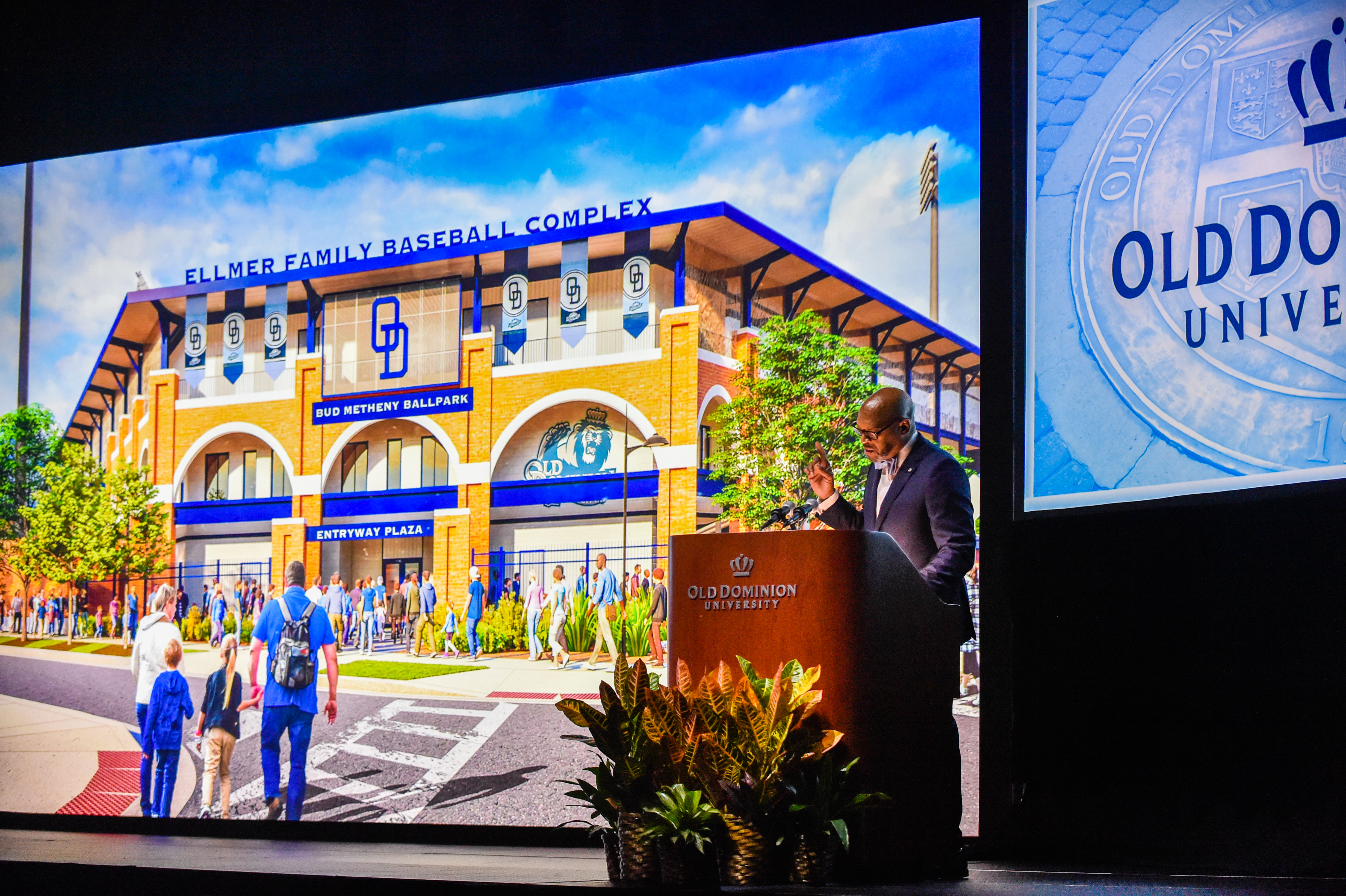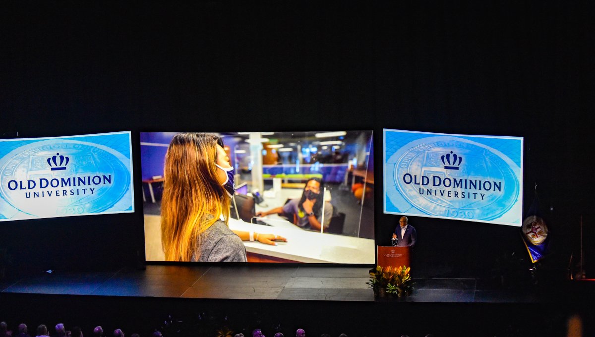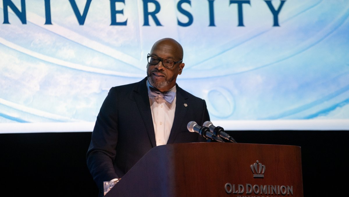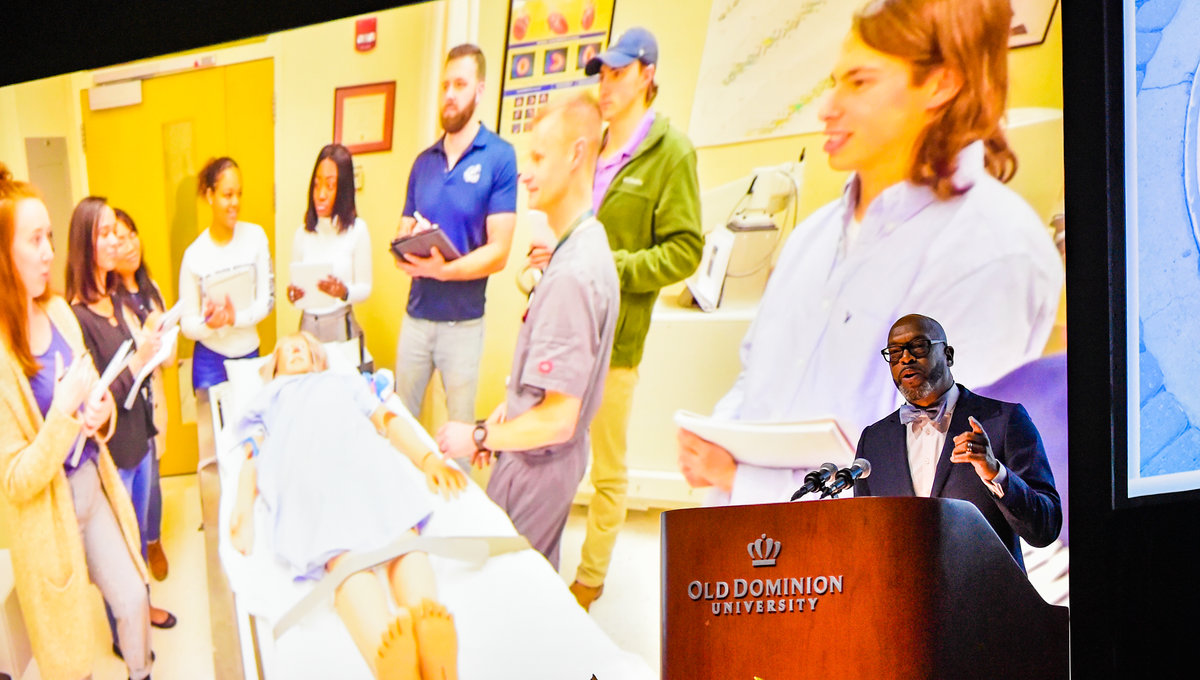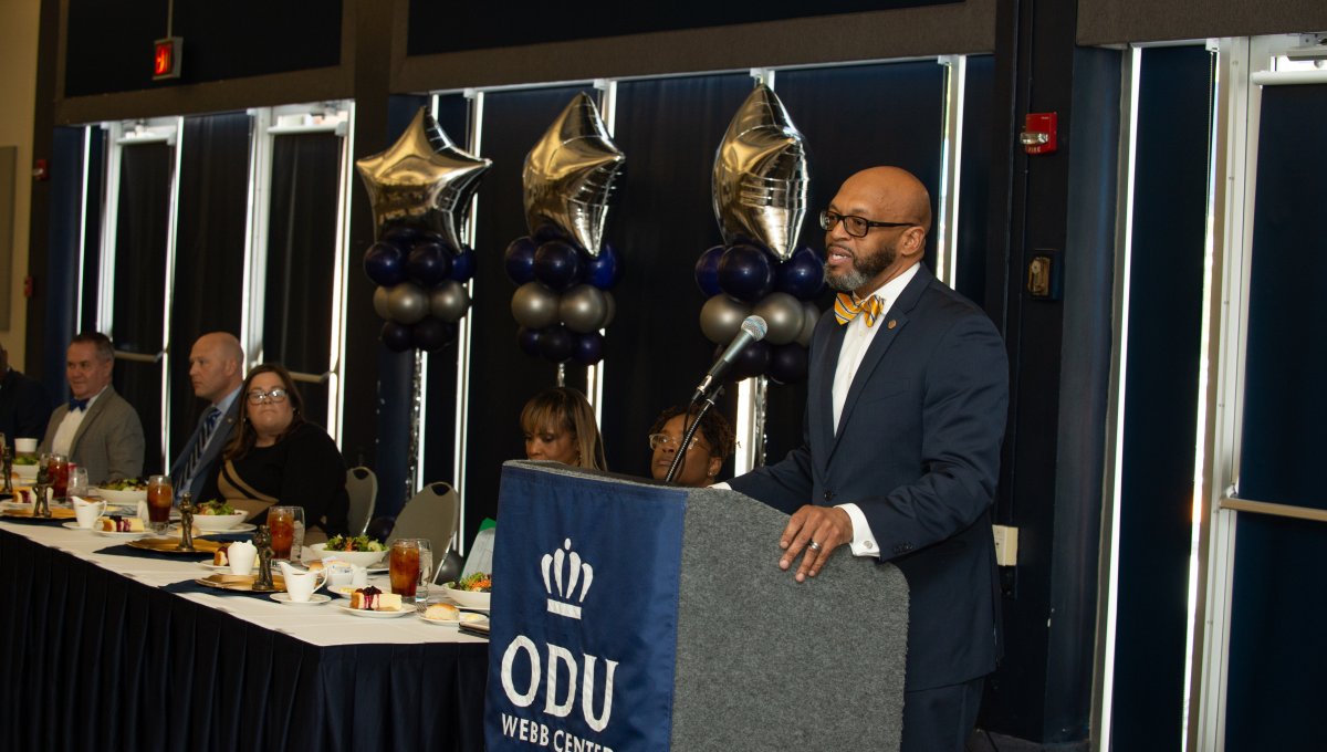 Old Dominion University President Brian O. Hemphill, Ph.D., announced plans for a School of Data Science and an expanded baseball facility during his first State of the University address, which he delivered Friday at Chartway Arena. Photo Chuck Thomas/ODU.