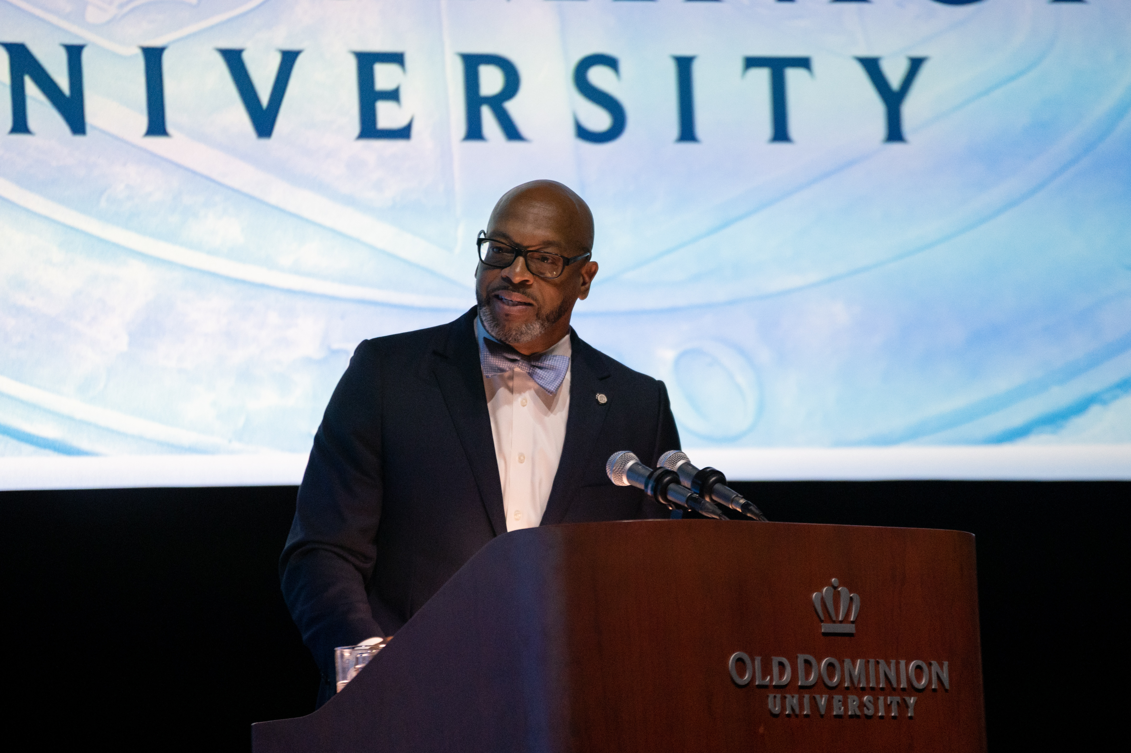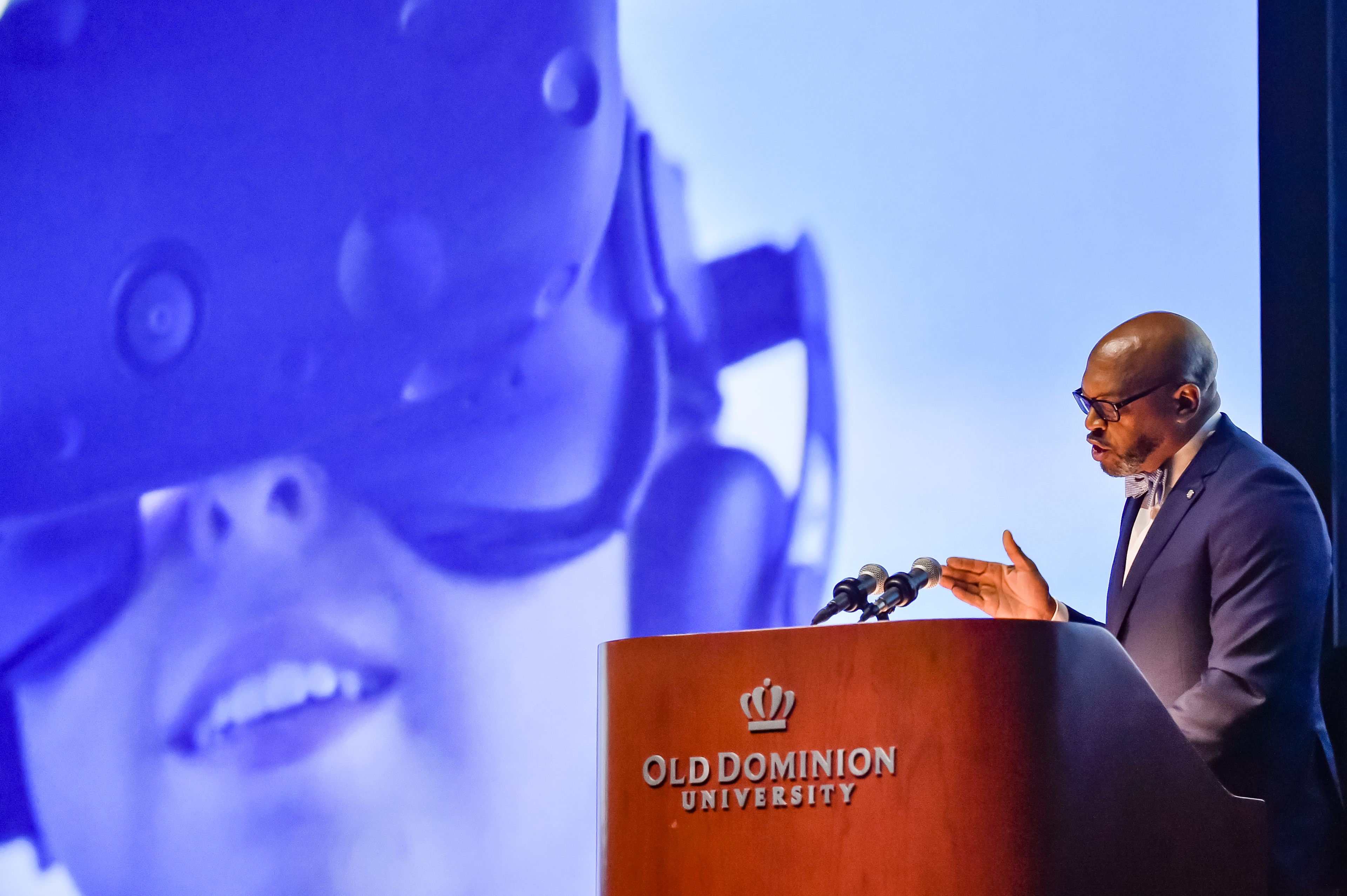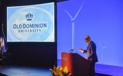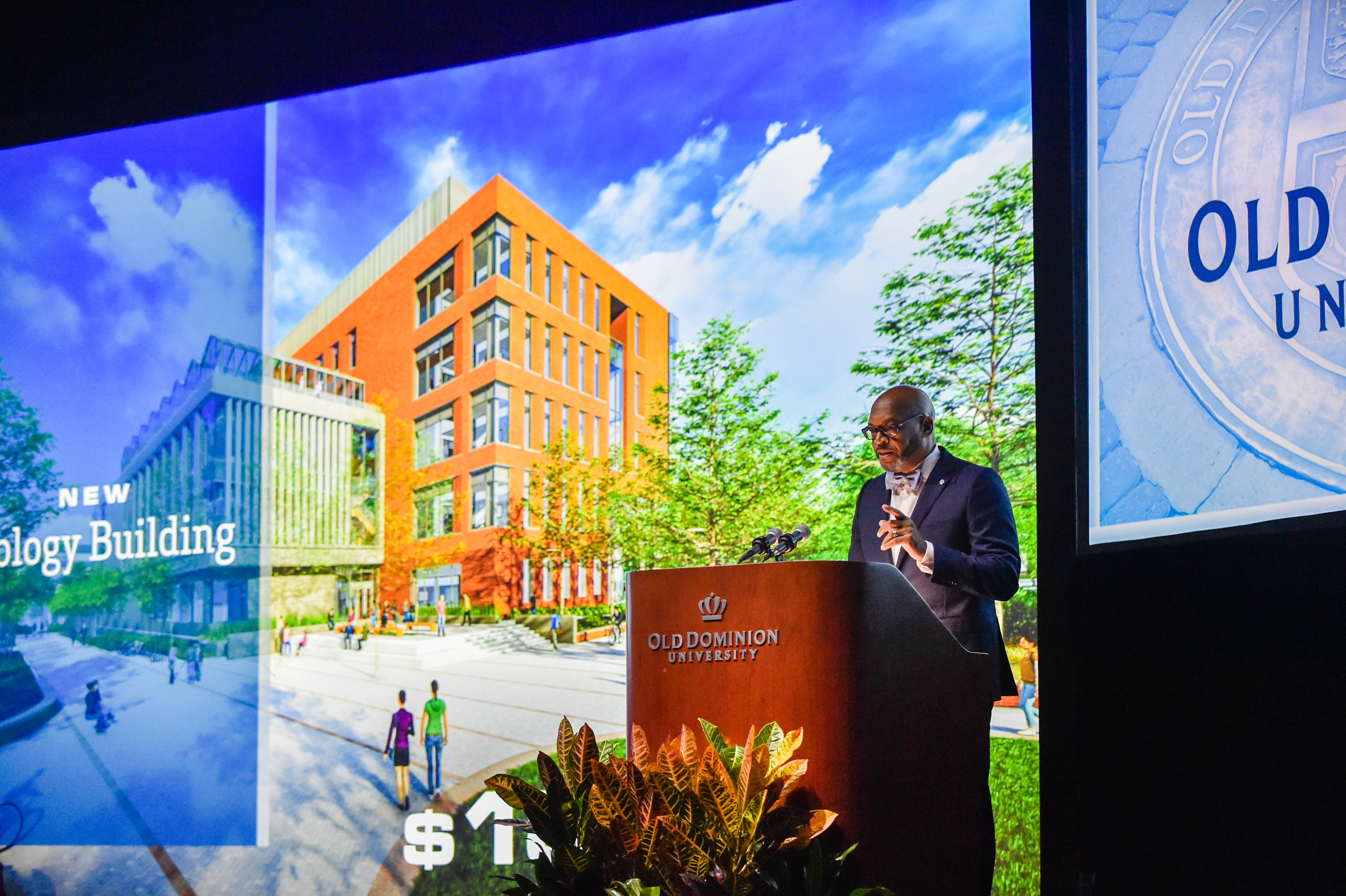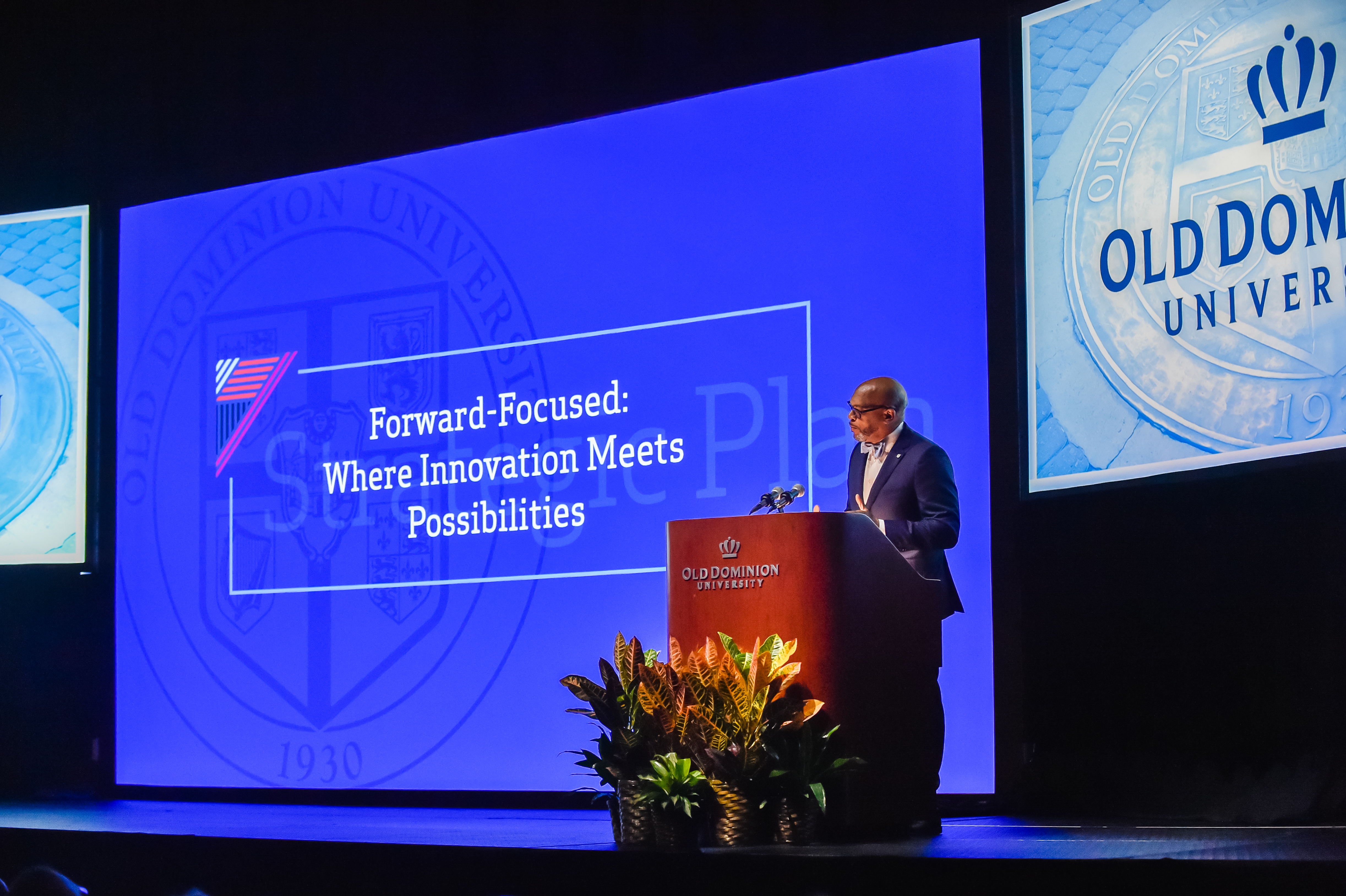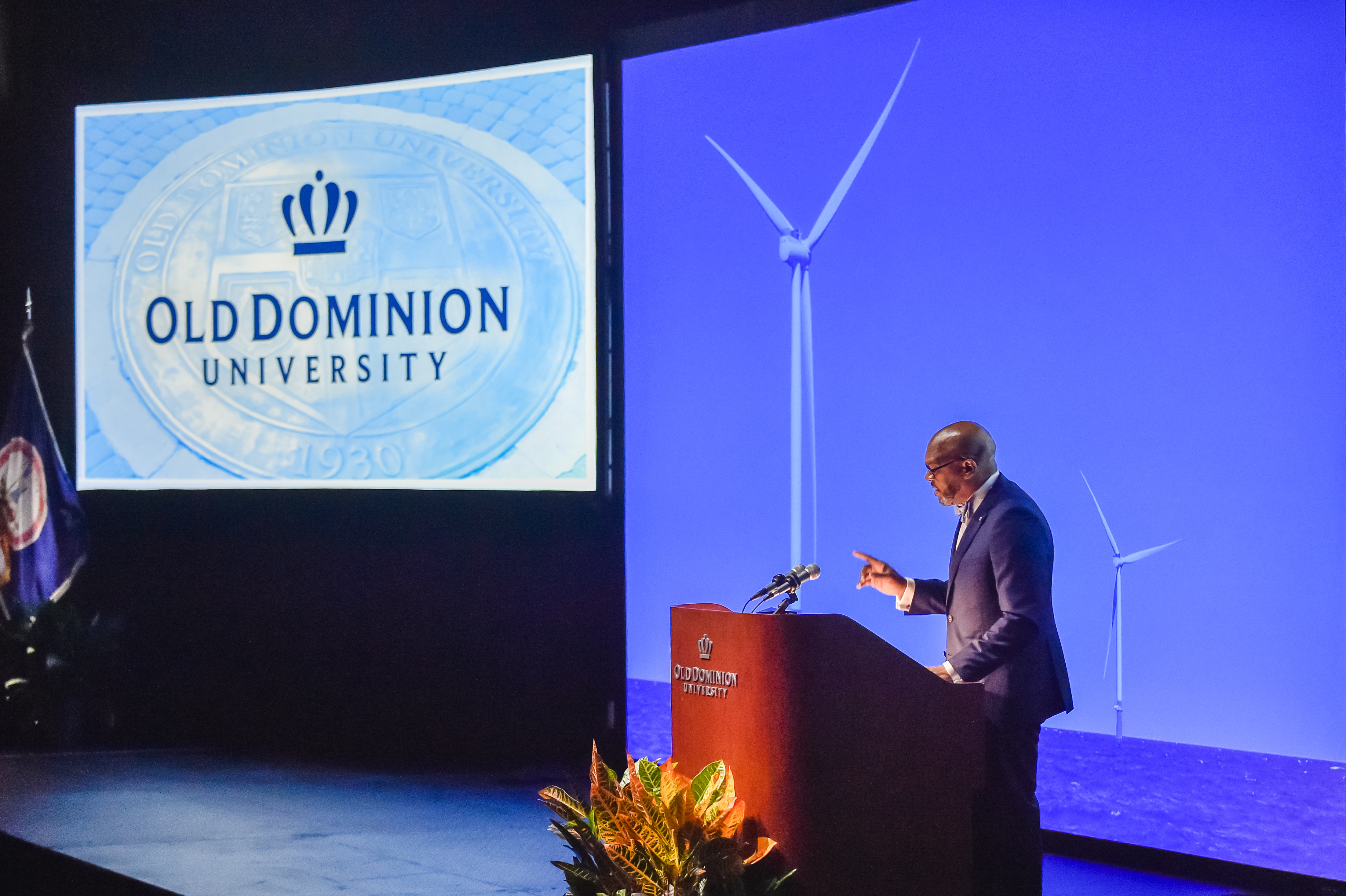 Old Dominion University President Brian O. Hemphill, Ph.D., announced plans for a School of Data Science and an expanded baseball facility during his first State of the University address, which he delivered Friday at Chartway Arena. Photo Chuck Thomas/ODU.