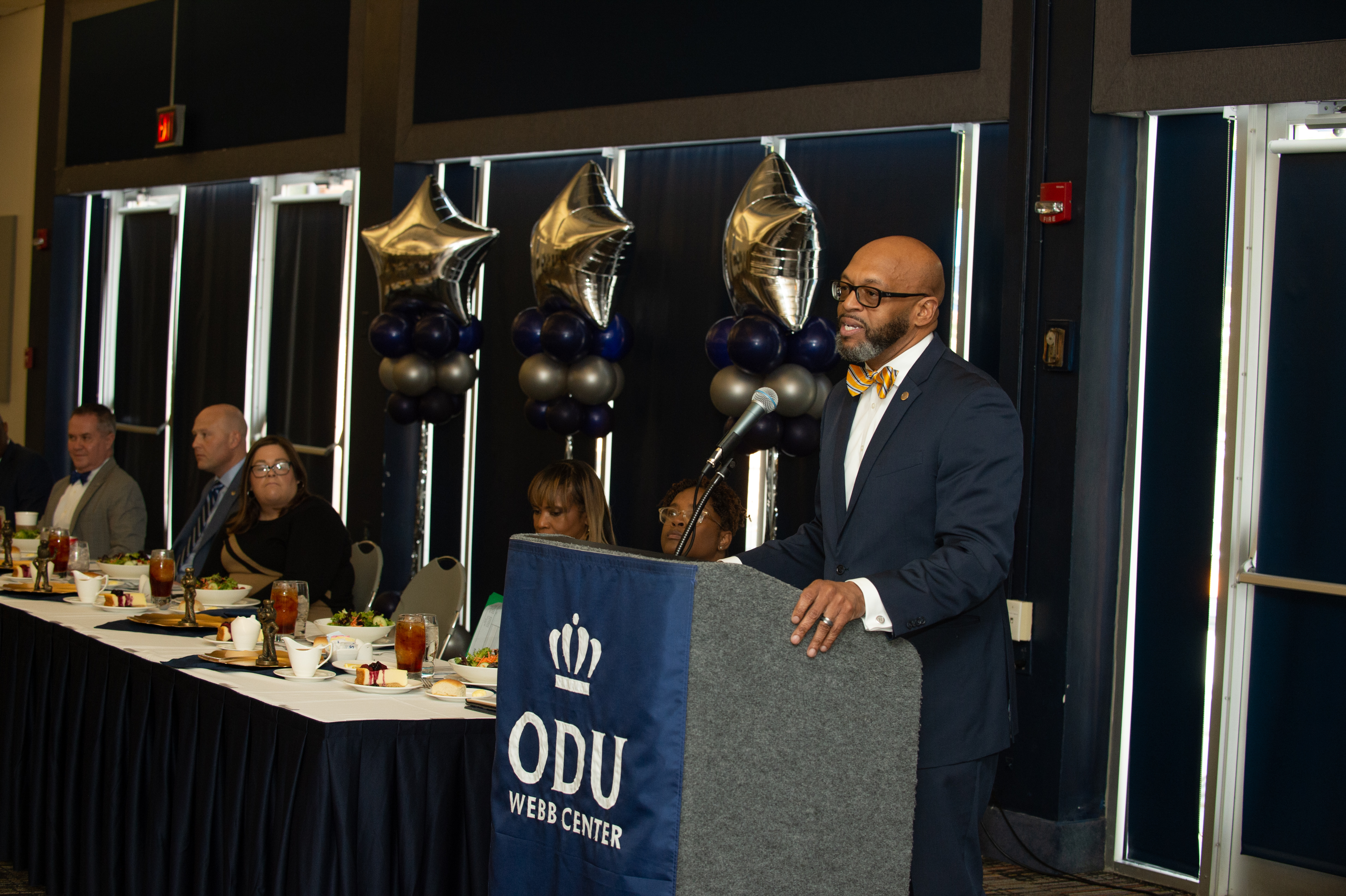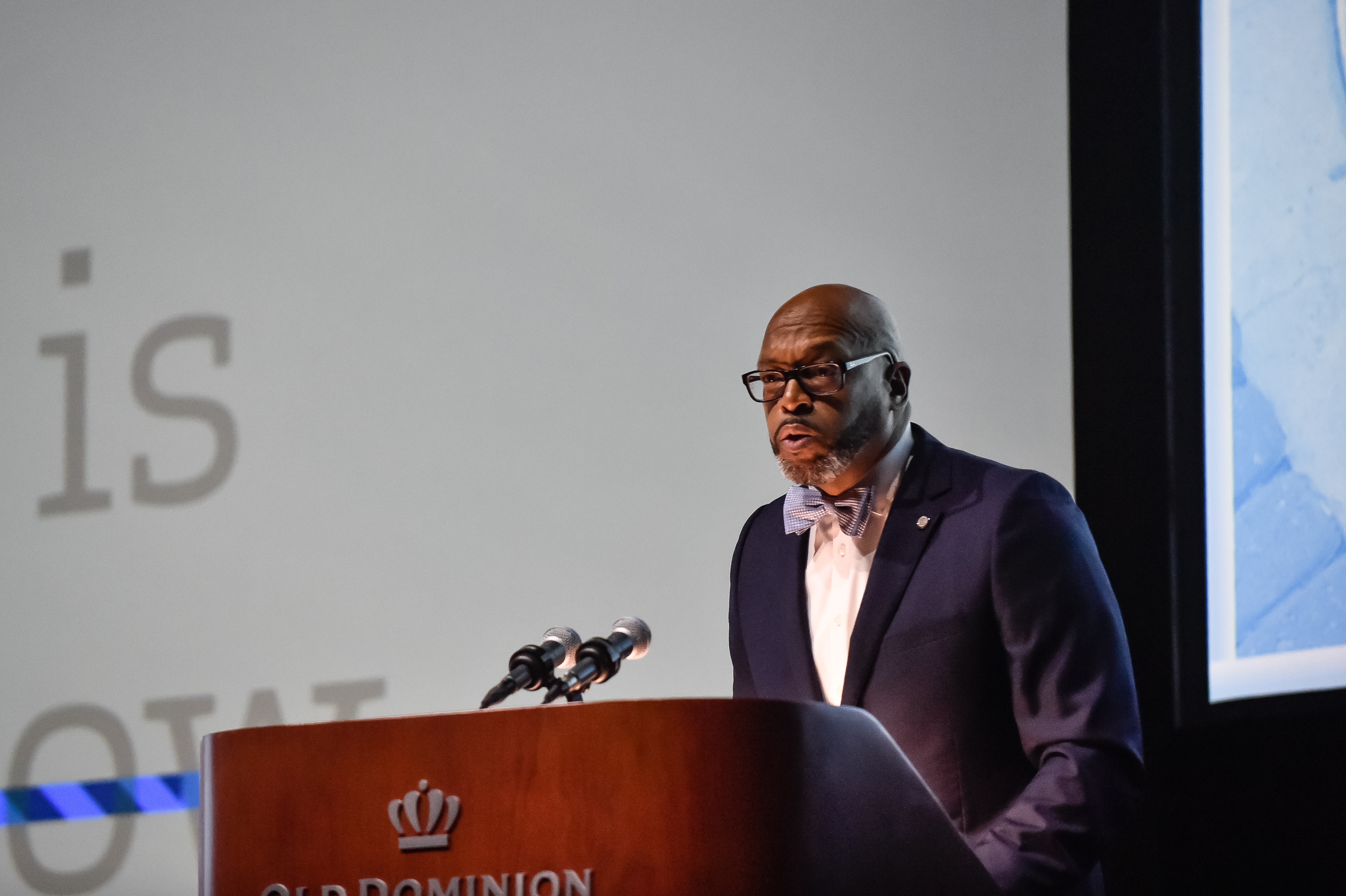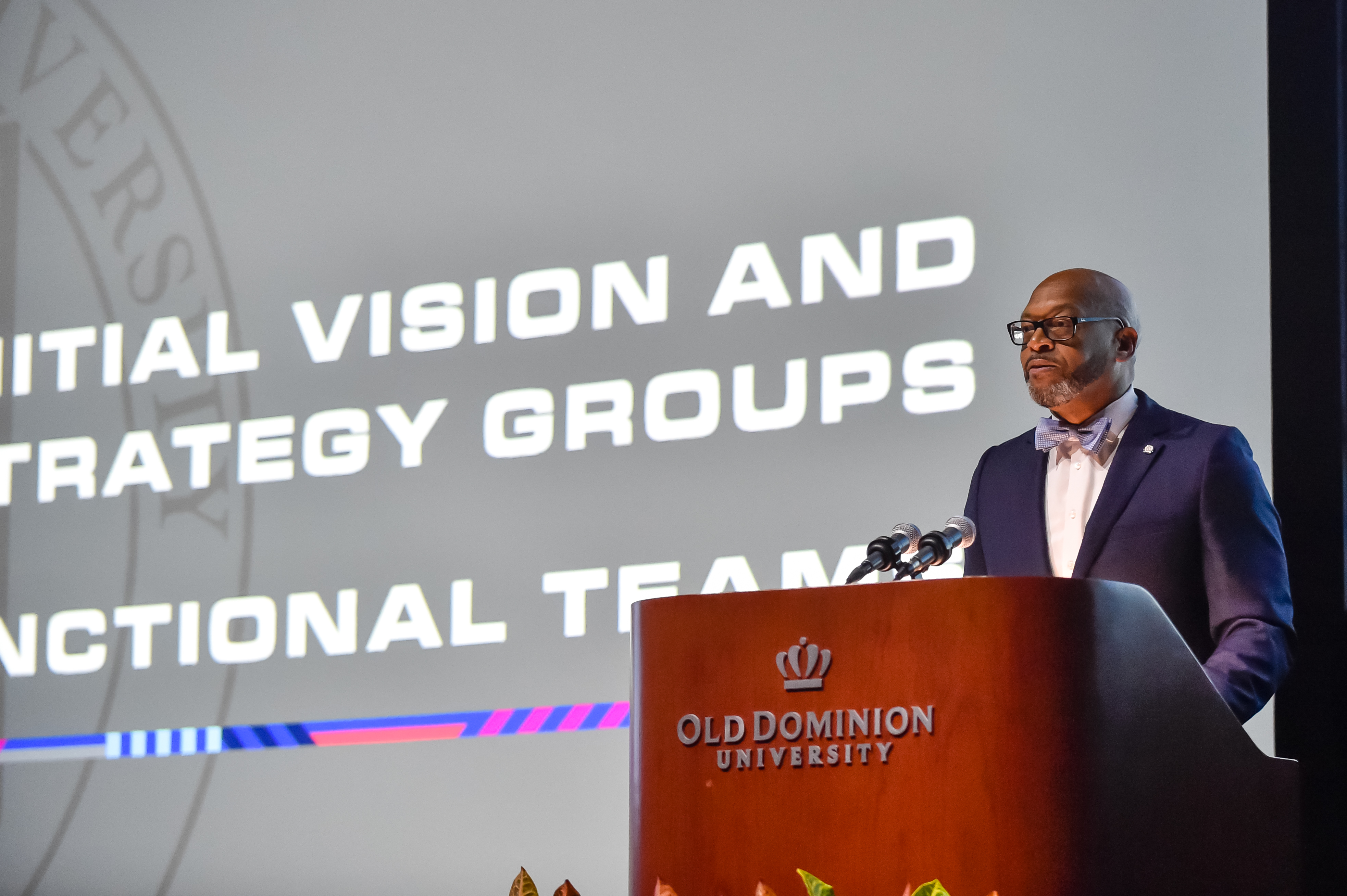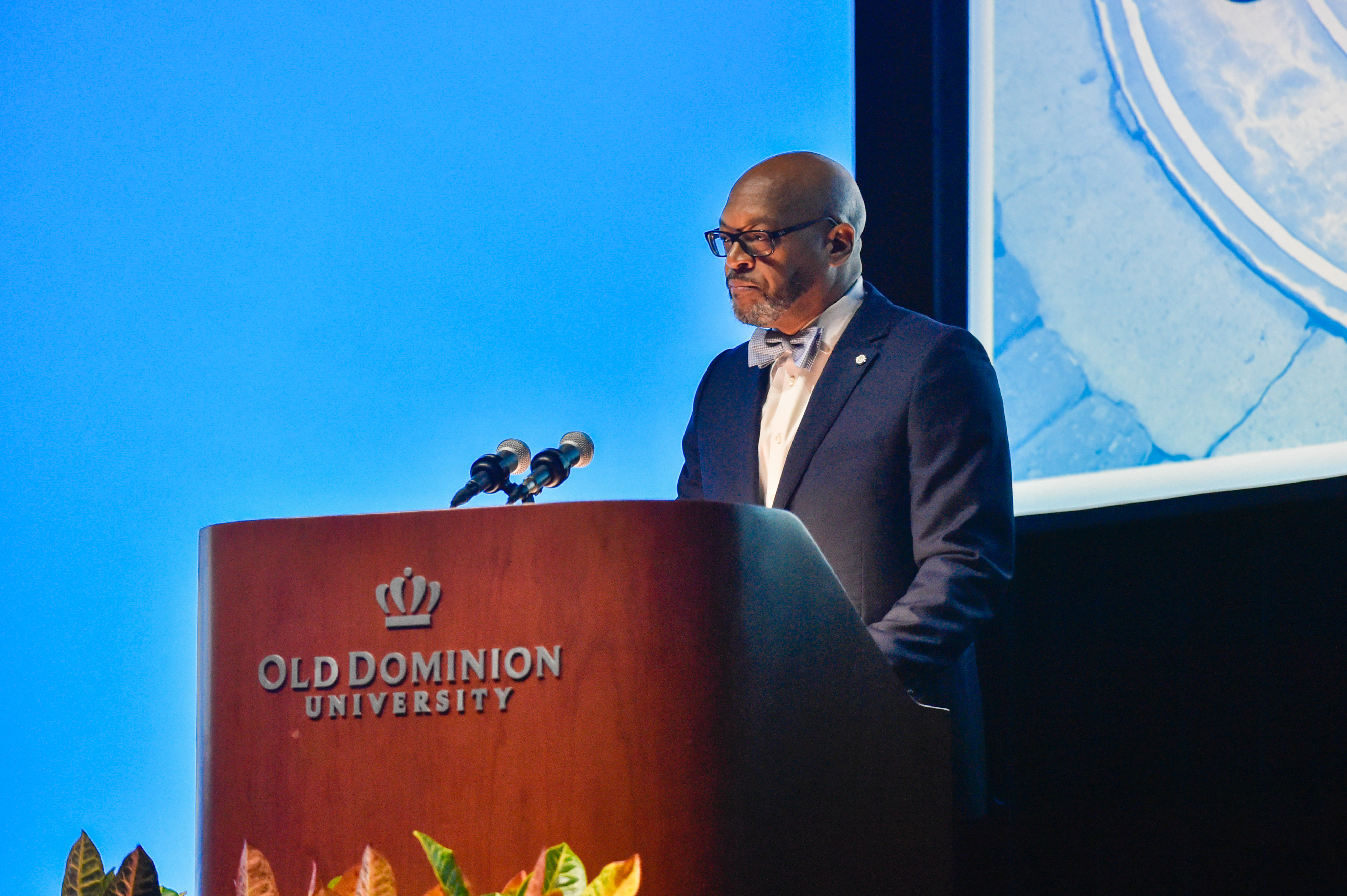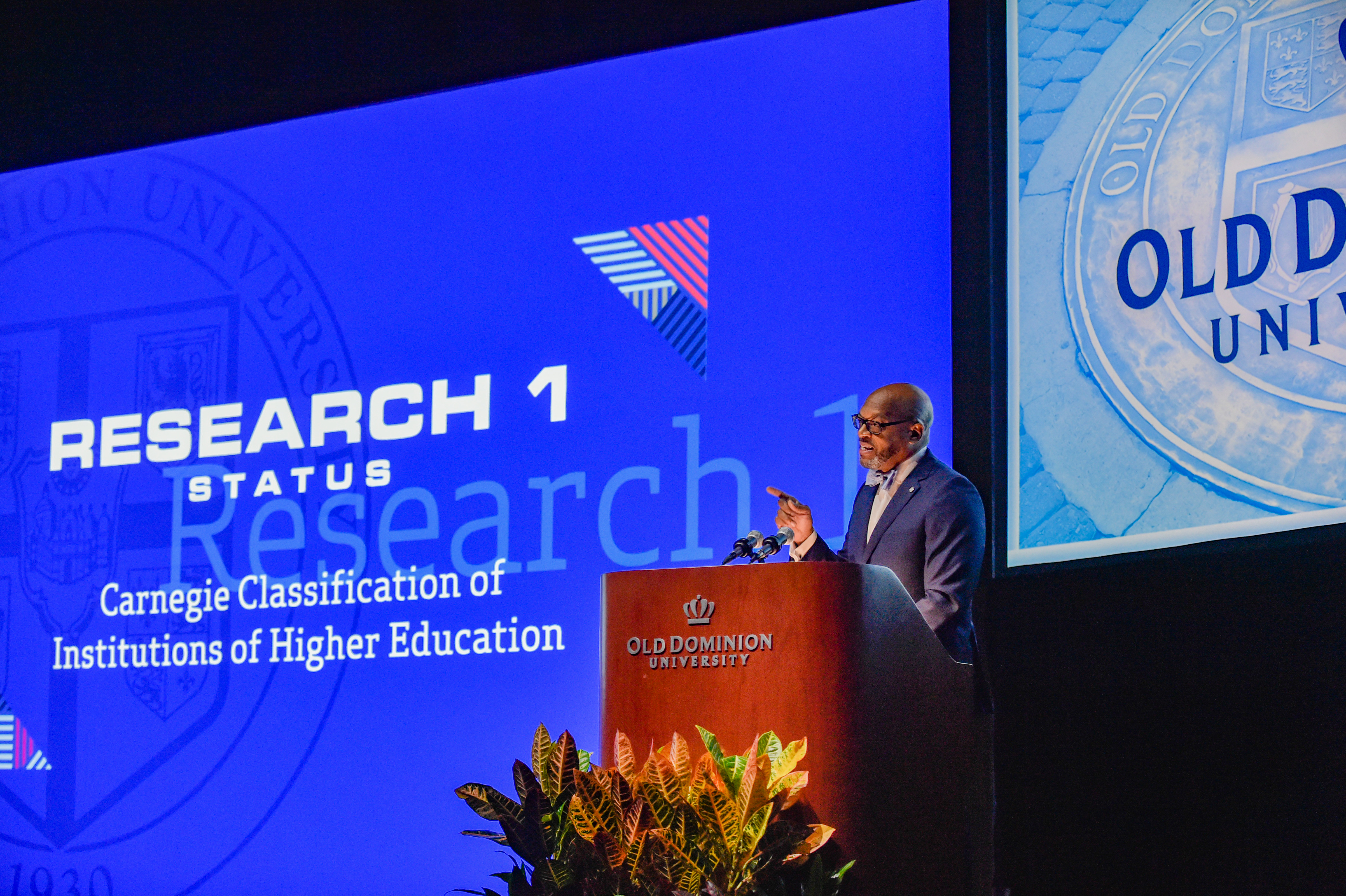 Old Dominion University President Brian O. Hemphill, Ph.D., announced plans for a School of Data Science and an expanded baseball facility during his first State of the University address, which he delivered Friday at Chartway Arena. Photo Chuck Thomas/ODU.