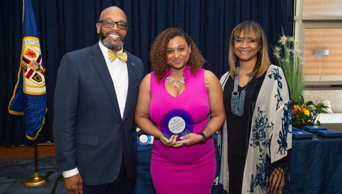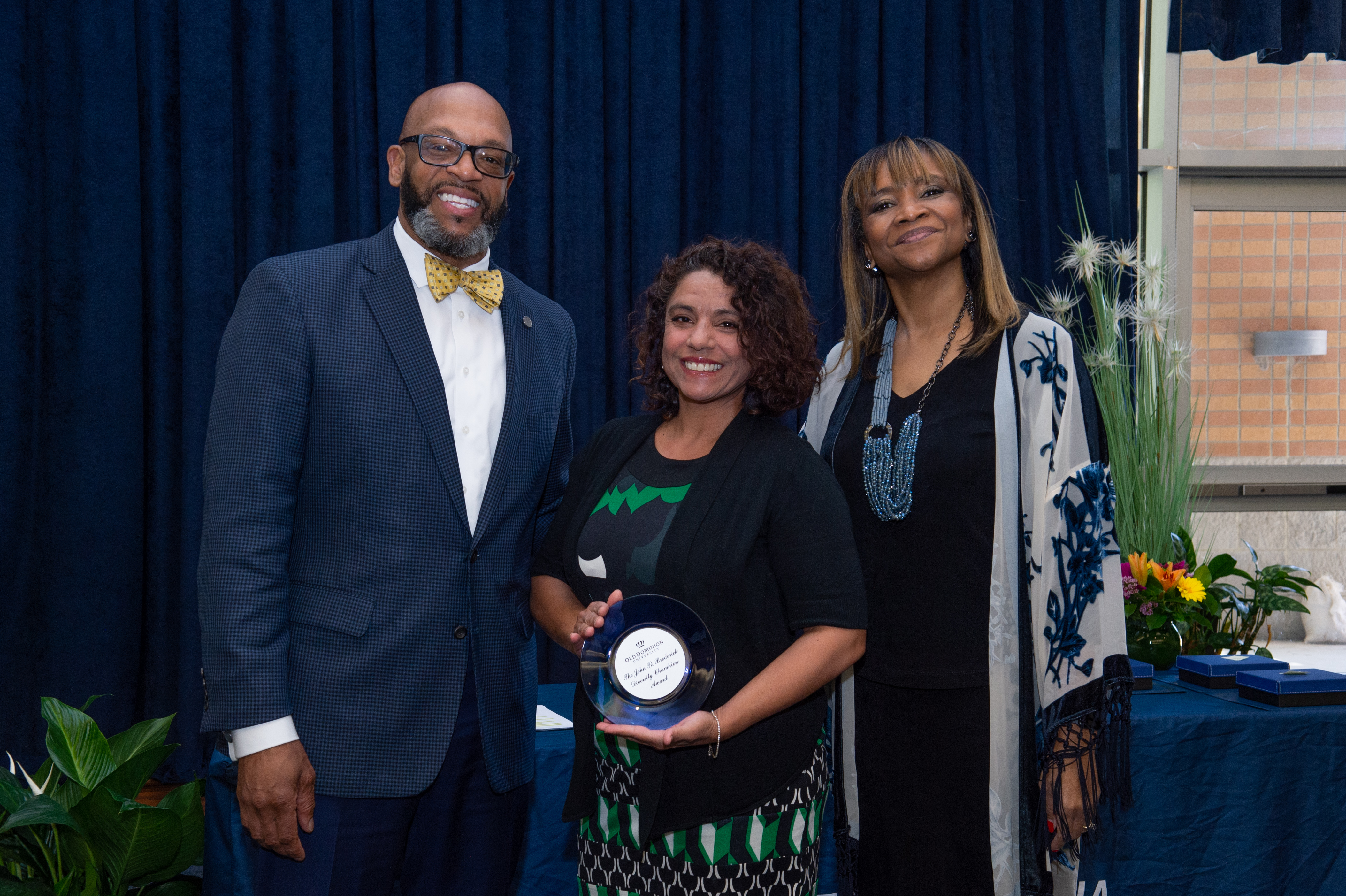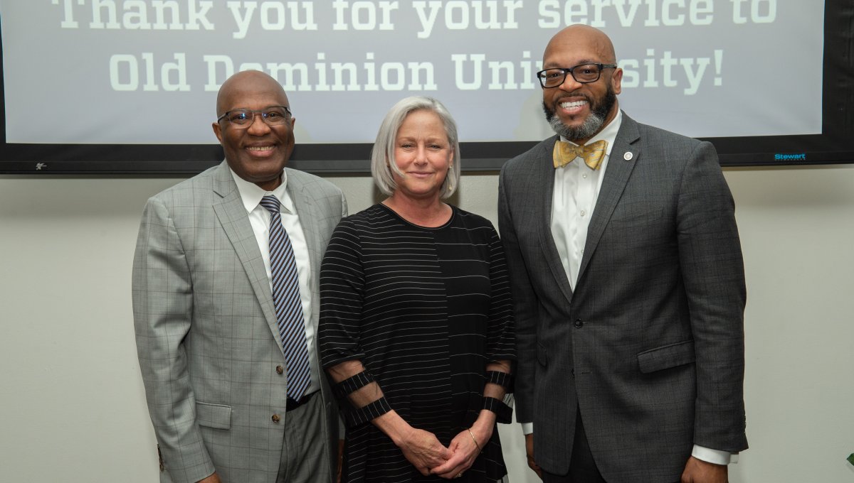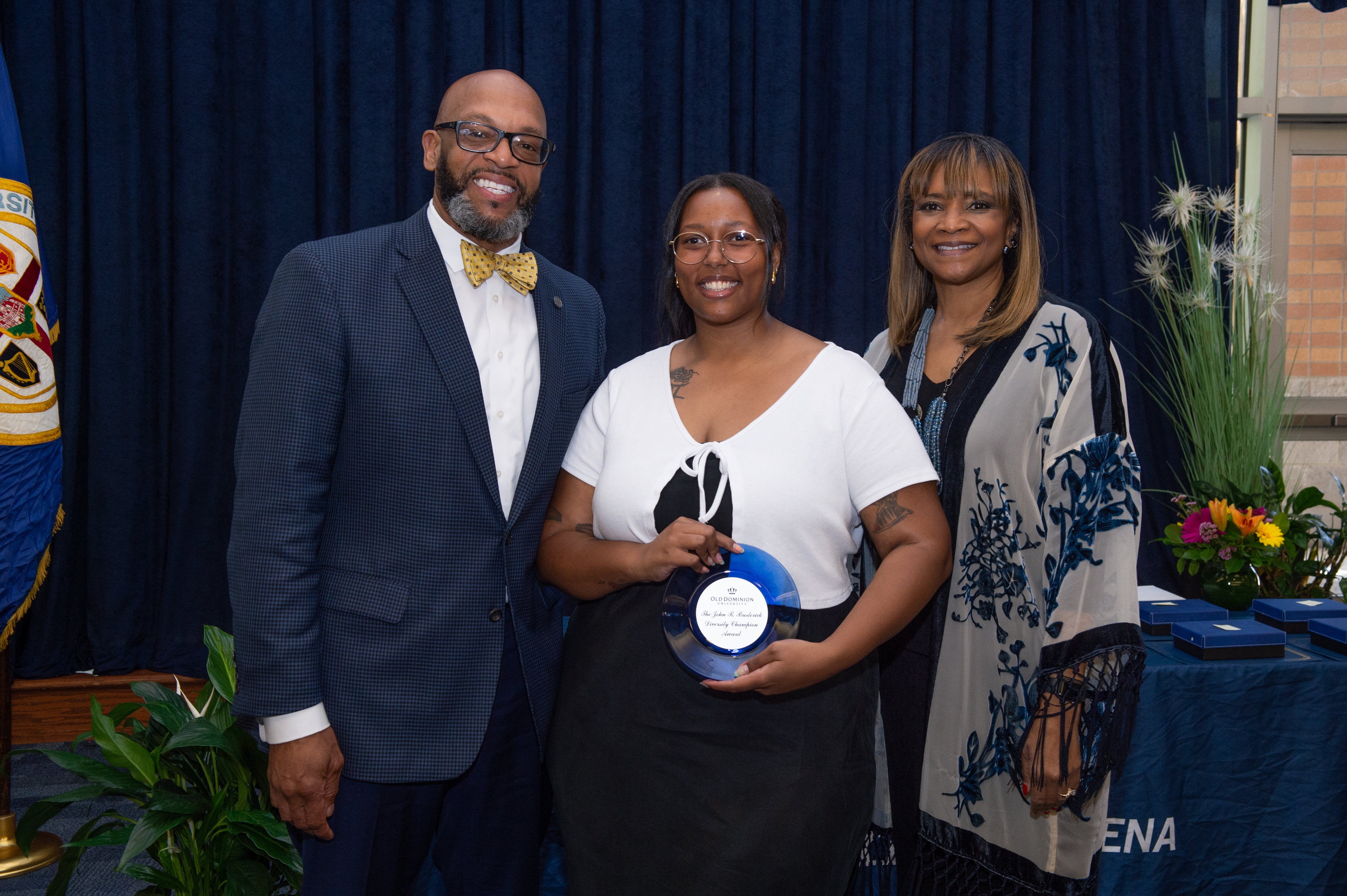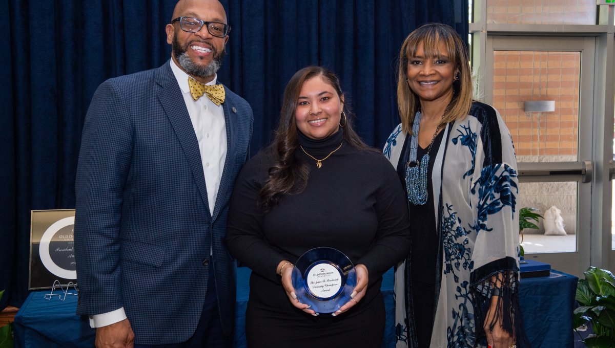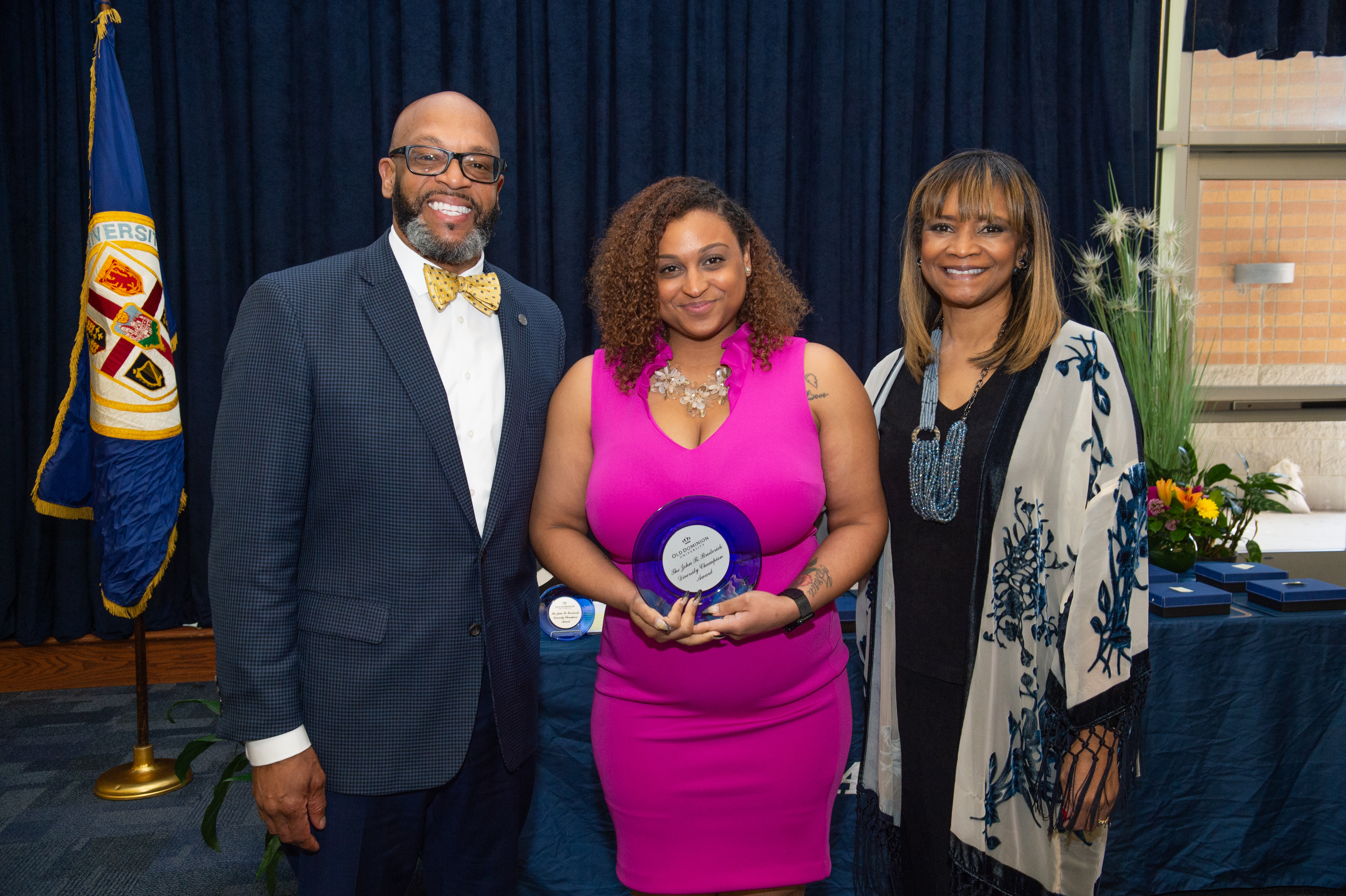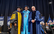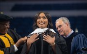 Award-winning actress Angela Bassett receives a Doctor of Humane Letters degree from Board of Visitors Rector Bruce Bradley and Provost Austin Agho. Photo Nicholas Clark/ODU