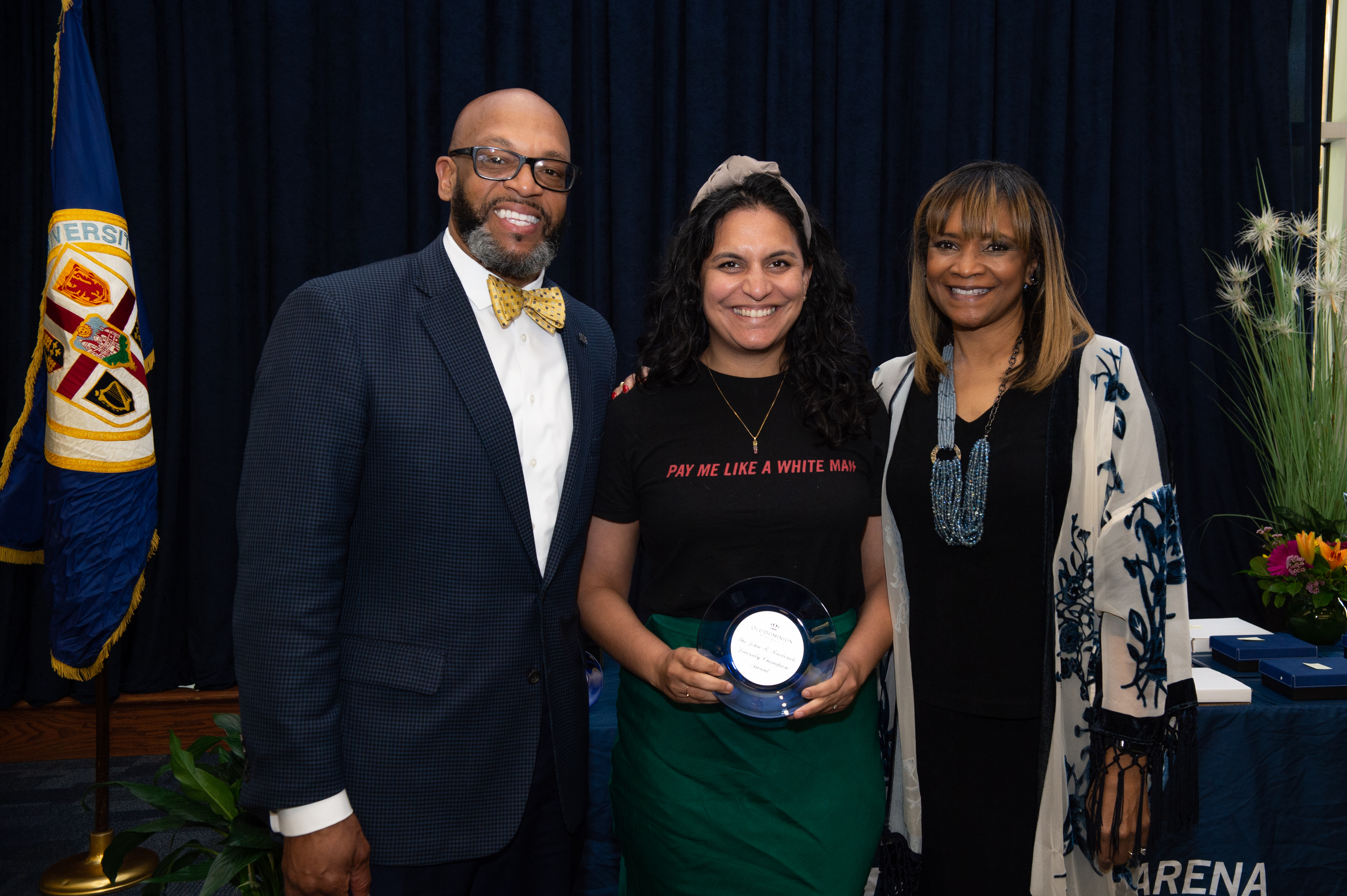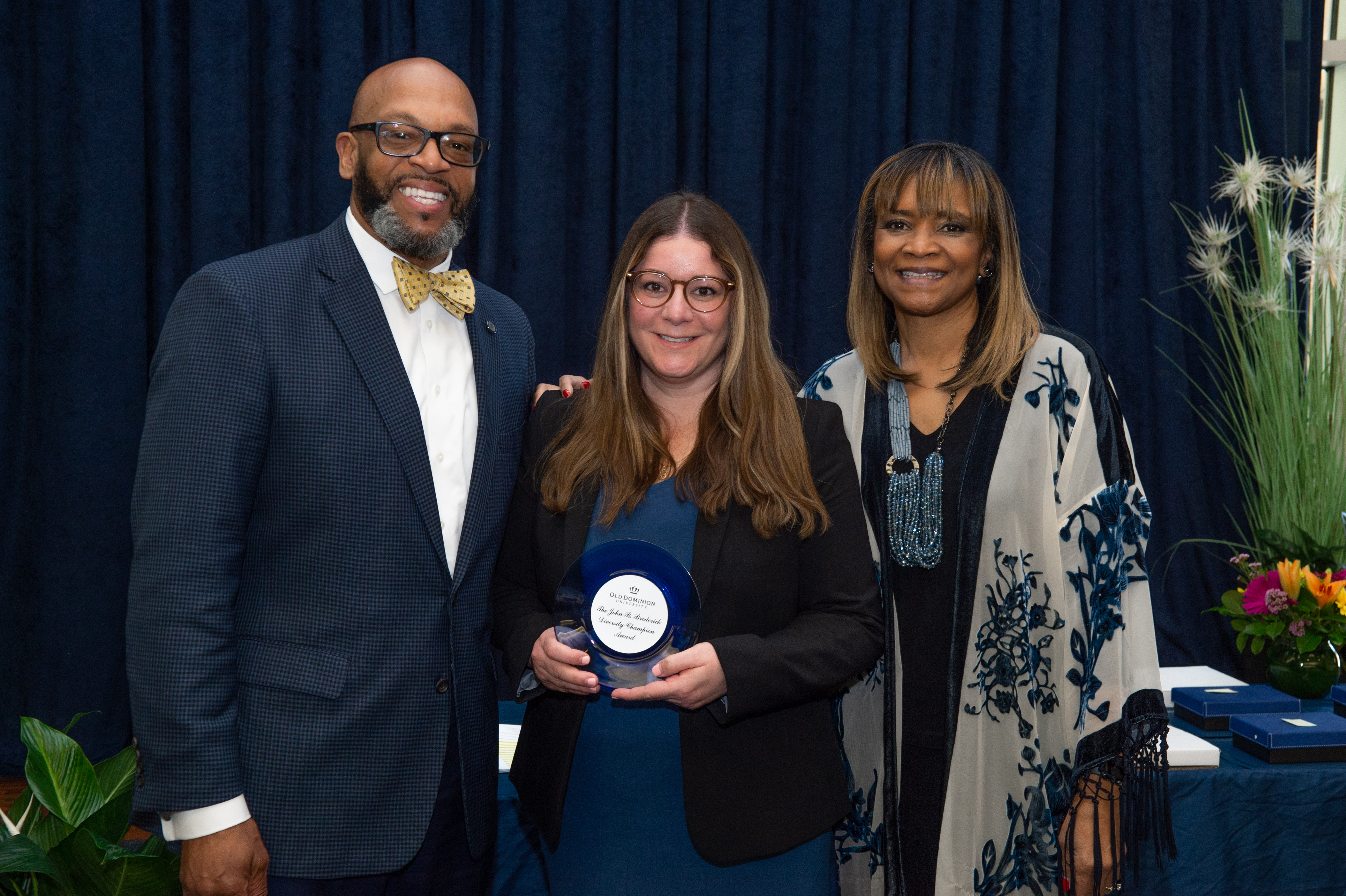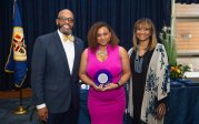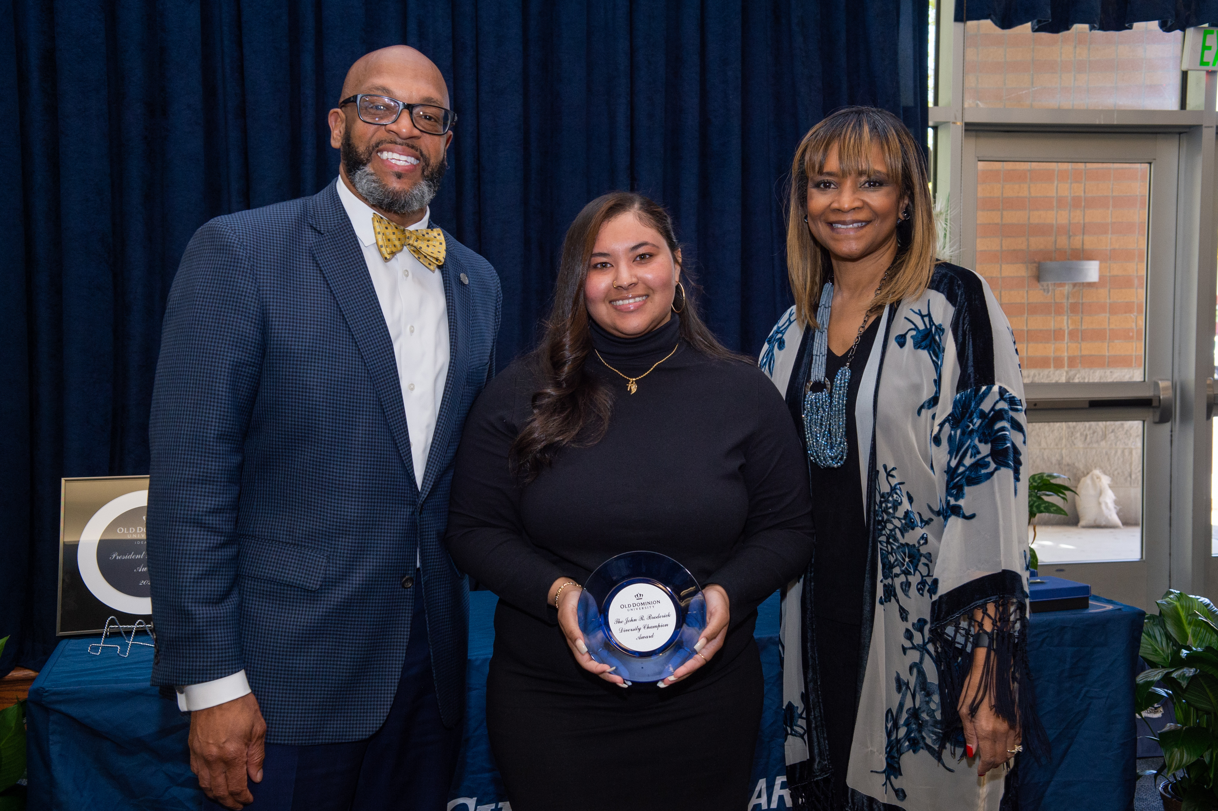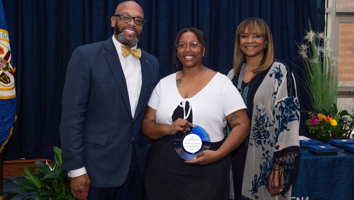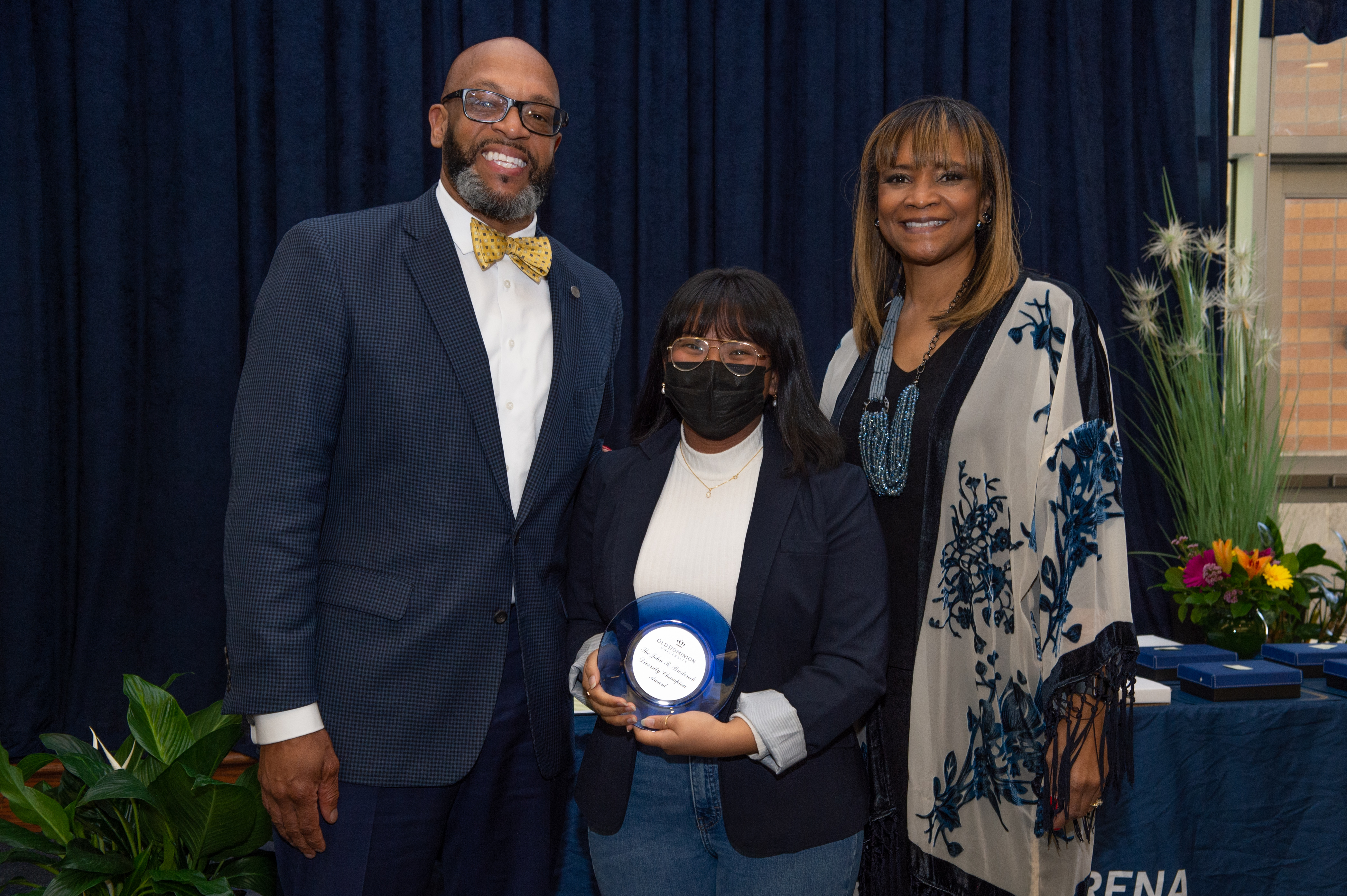 Award-winning actress Angela Bassett receives a Doctor of Humane Letters degree from Board of Visitors Rector Bruce Bradley and Provost Austin Agho. Photo Nicholas Clark/ODU