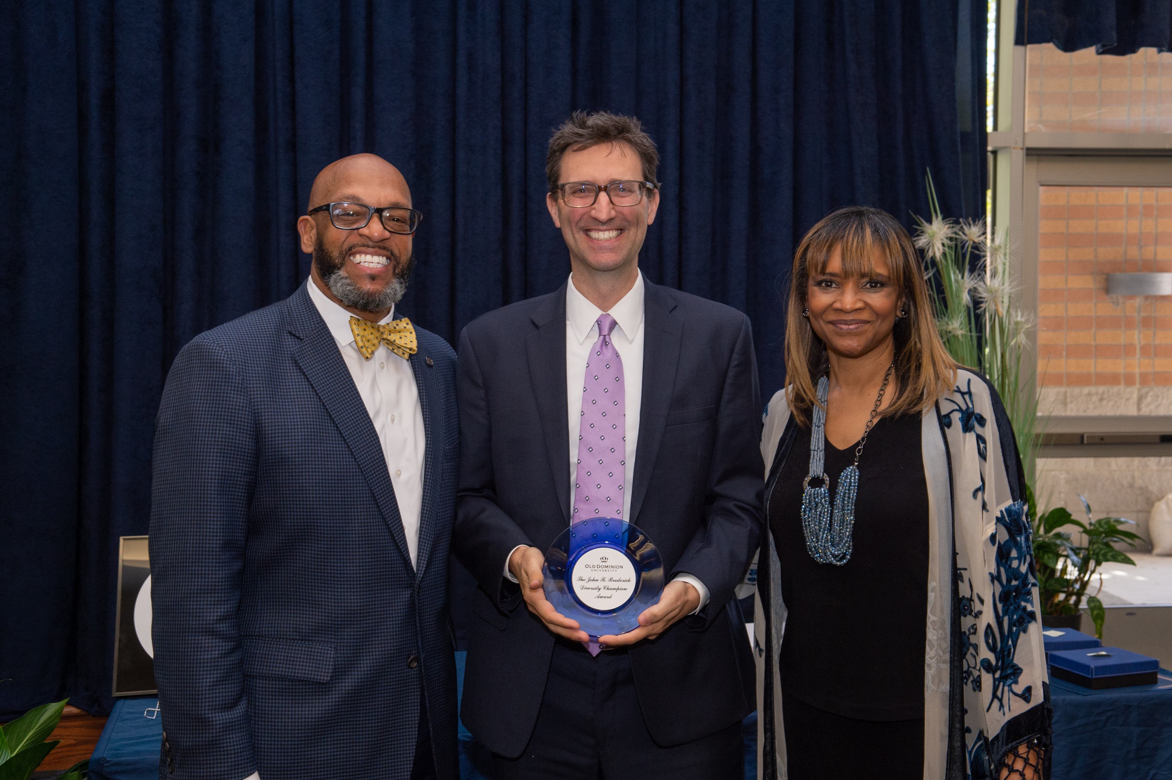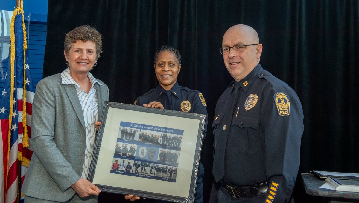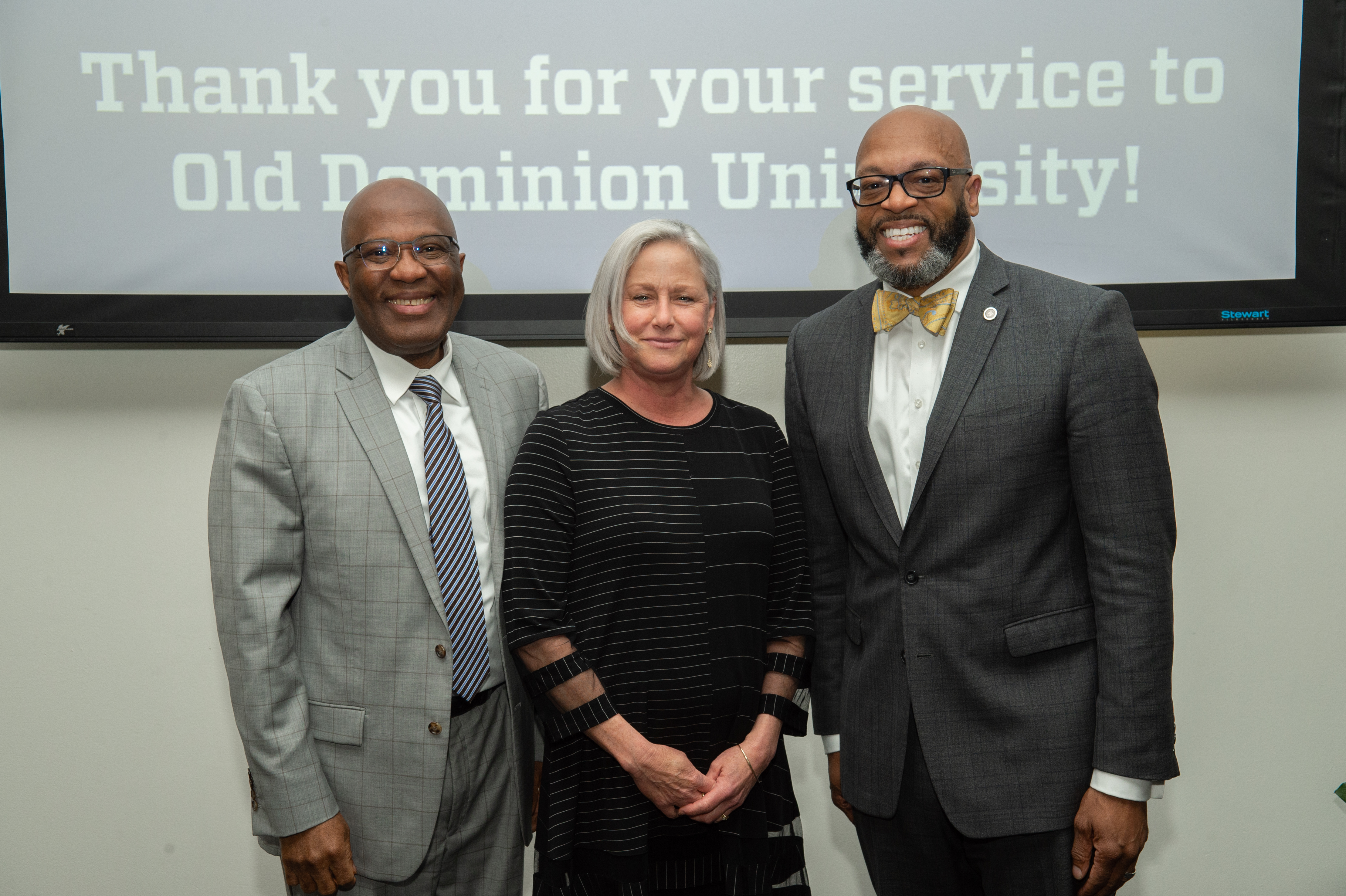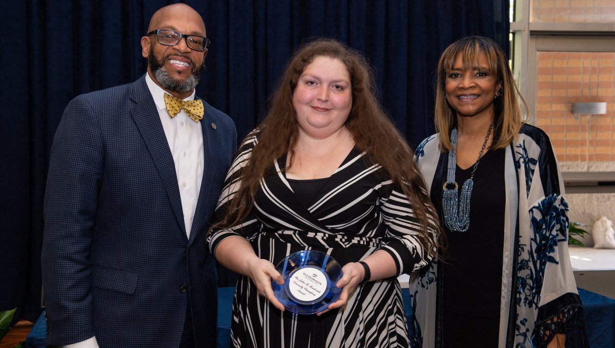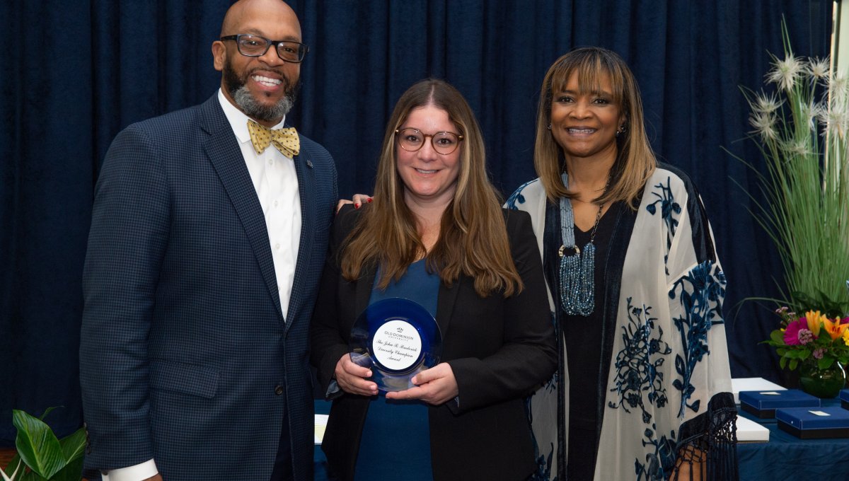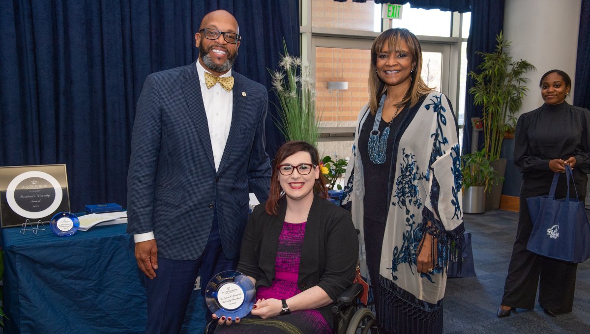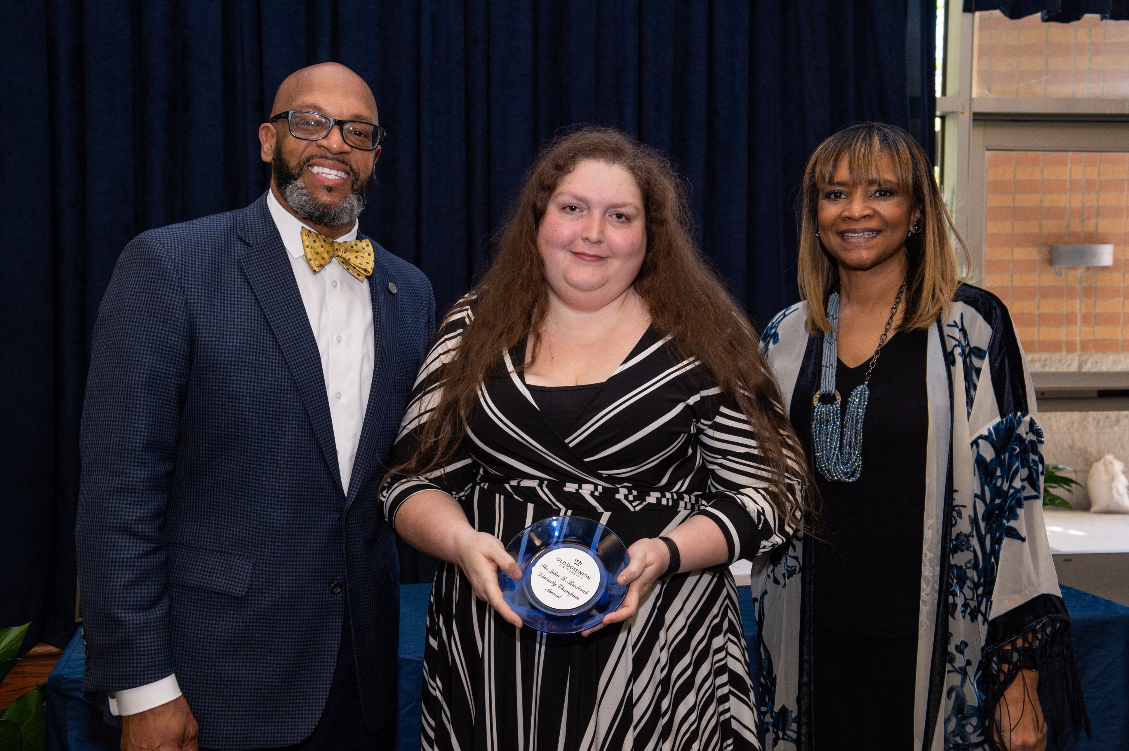 Award-winning actress Angela Bassett receives a Doctor of Humane Letters degree from Board of Visitors Rector Bruce Bradley and Provost Austin Agho. Photo Nicholas Clark/ODU